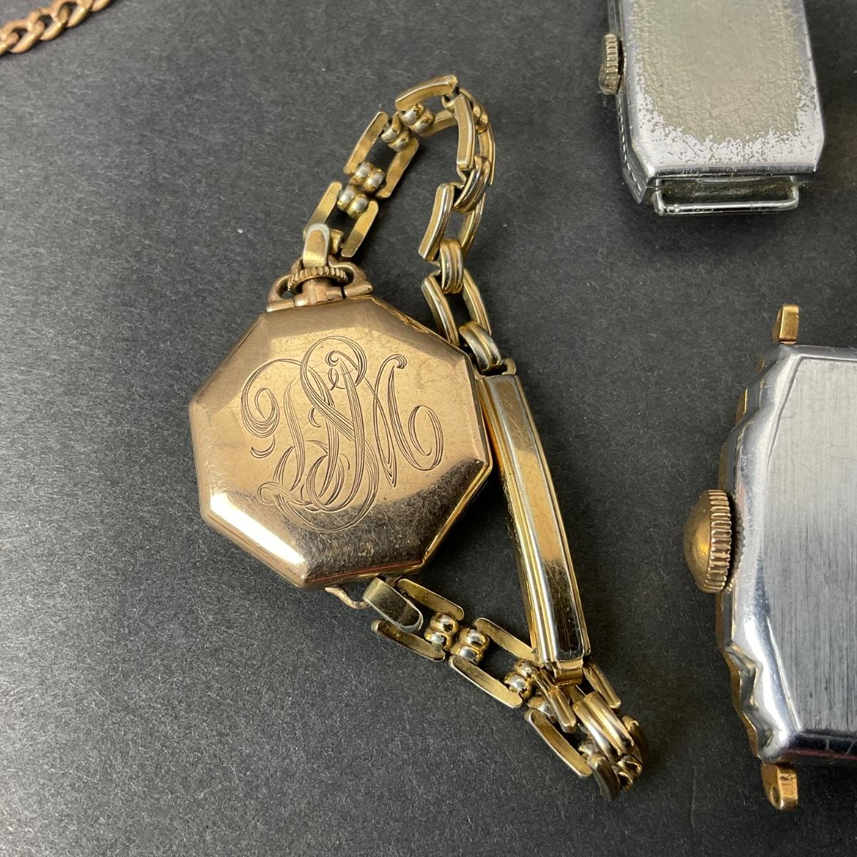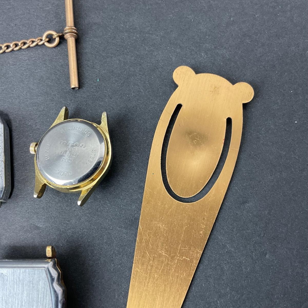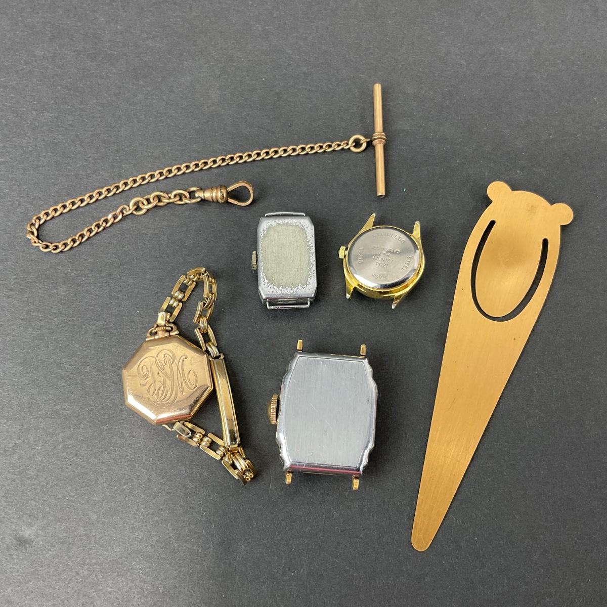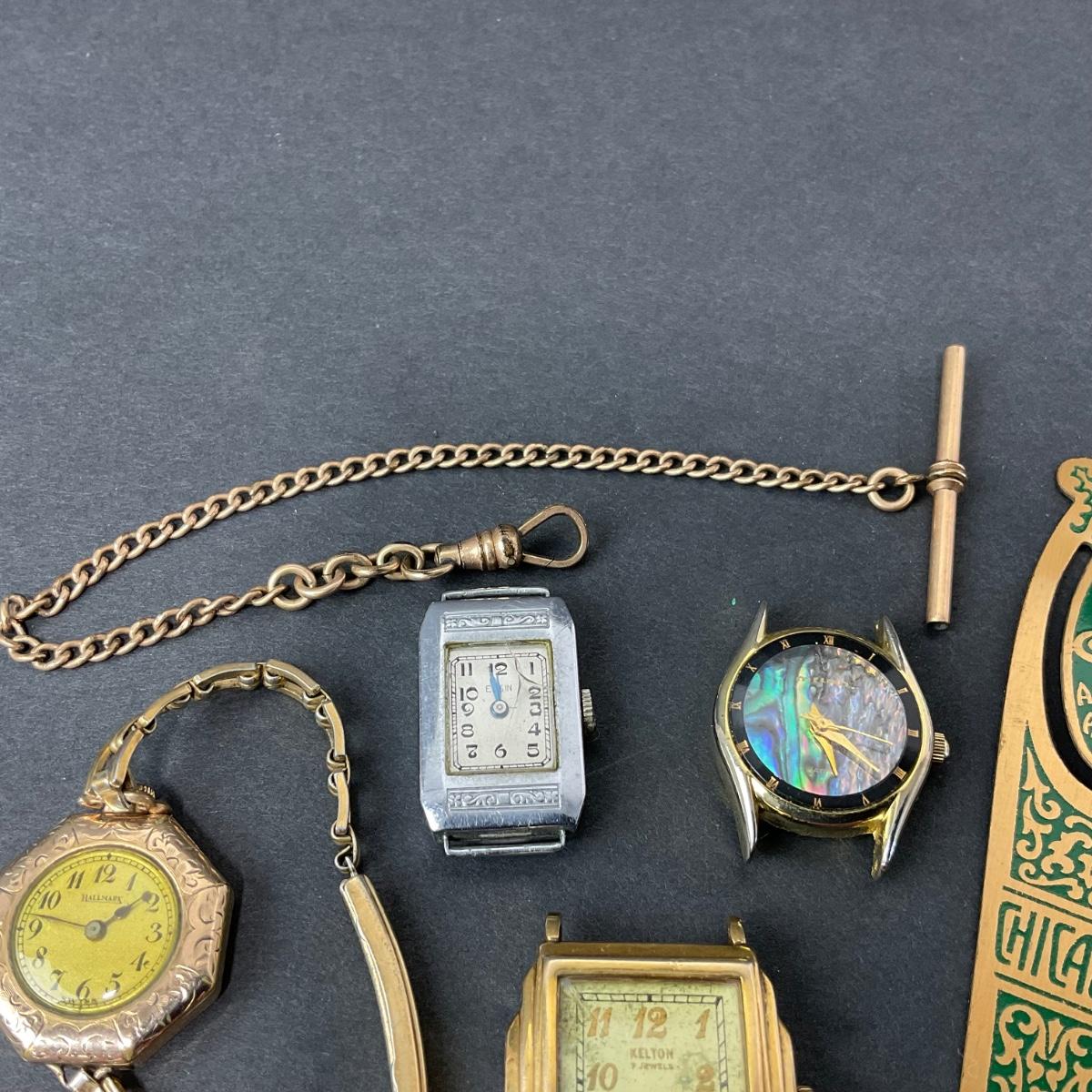 One assorted lot of watch parts and pieces. These are untested and unknown if they are in working order. There is also a fun little metal bookmark. Please see photos for details and condition. Any condition statement is given as a courtesy to a client, is an opinion, and should not be treated as a statement of fact. Reference to condition written, oral or within a condition report shall not be regarded as a full account of condition and may not include all defects, alterations, or restorations. Absence of a condition report does not imply a lot is flawless or lacking imperfections or damage. Katherine’s Auction & Appraisal Service shall have no responsibility for any error or omission. Returns shall not be accepted on the basis of condition. ::: Shipping is available on this lot. If you require shipping you must let us know at the close of the auction. We will coordinate with you after the item has been won. Shipping fees will include insurance up to or exceeding the value of all items being mailed. If you have any questions regarding this lot please contact the auctioneer either via this website, by direct email or by phone. PICK UP TIMES and other important information can be found in the TERMS and DESCRIPTION of the auction. Please take a look for pertinent information. Thanks!