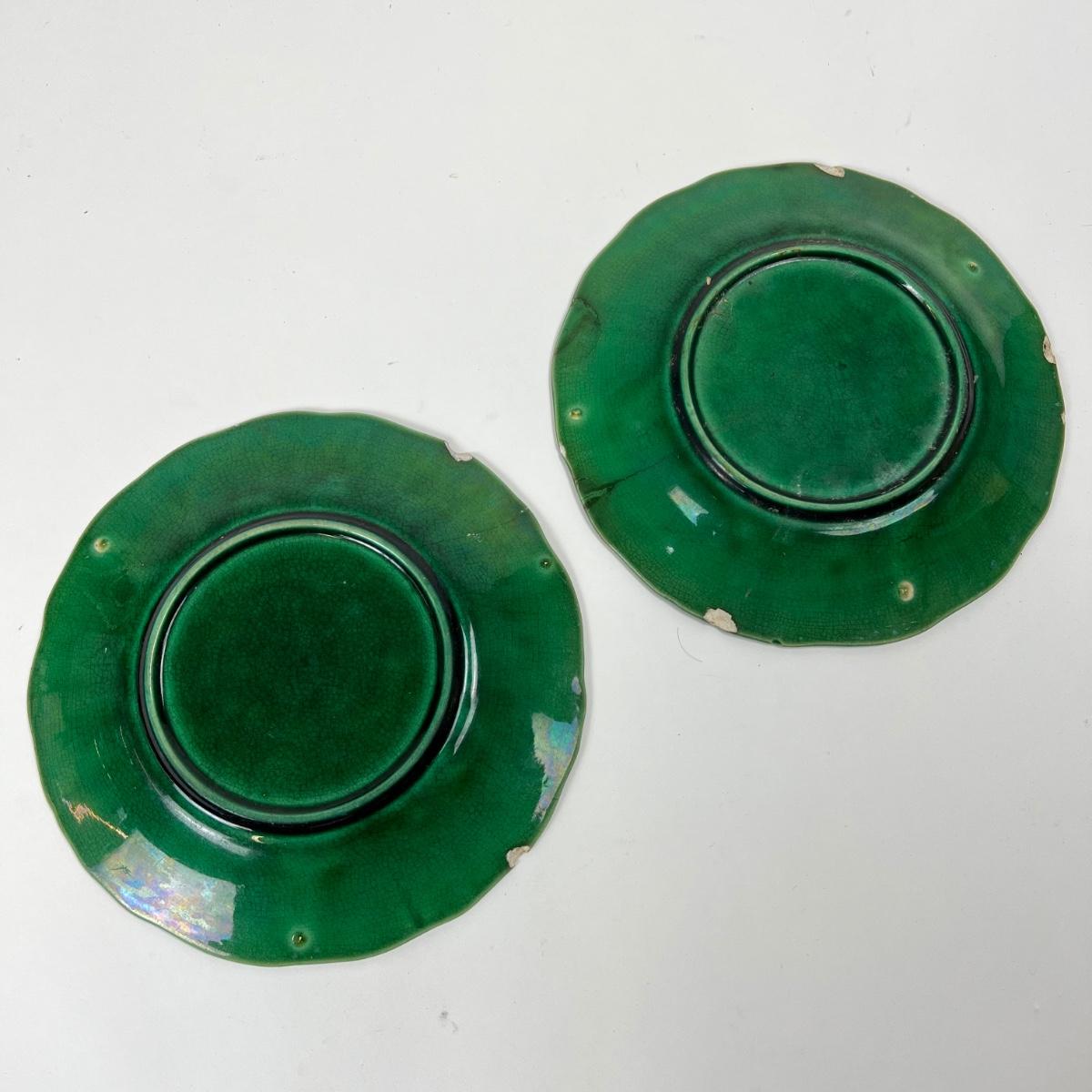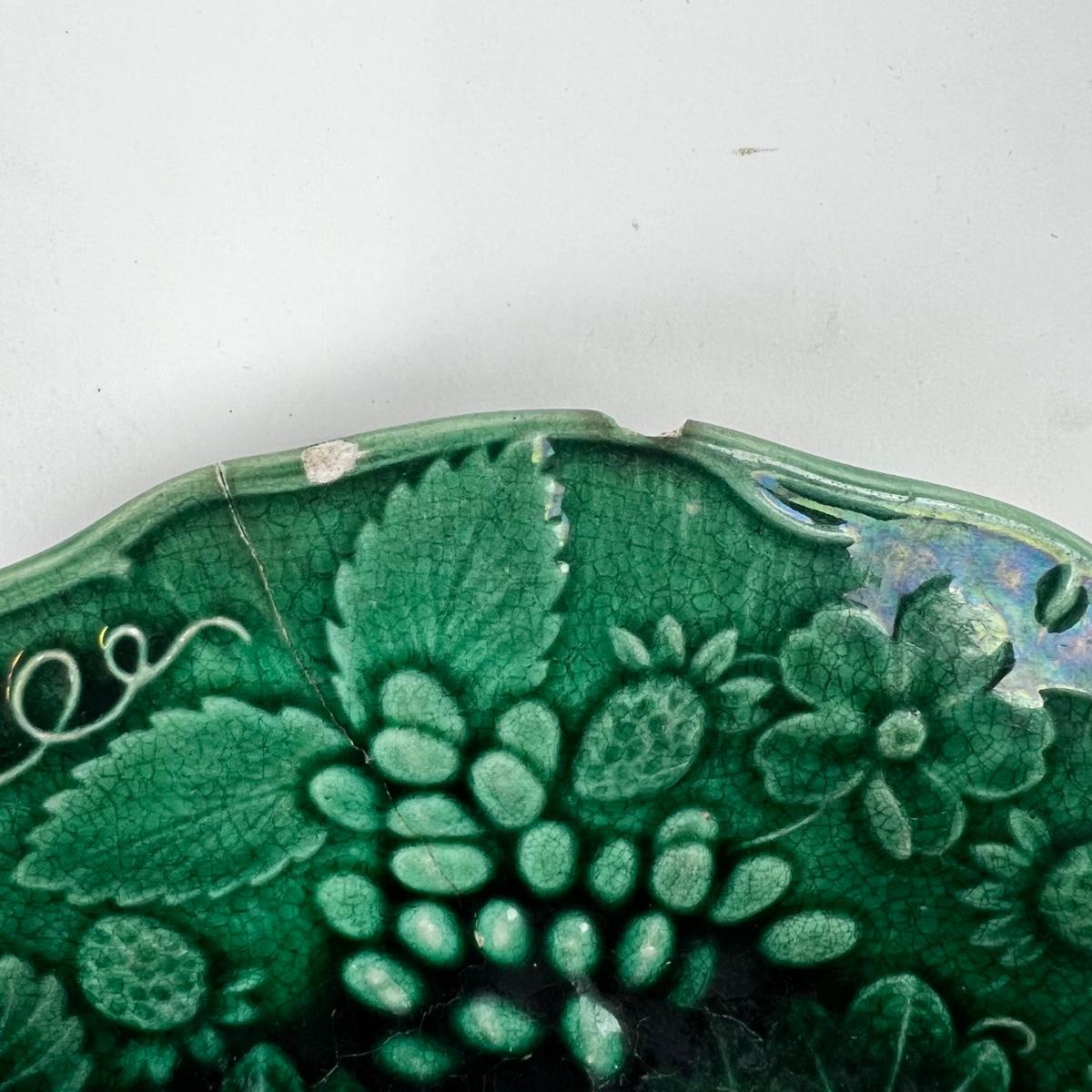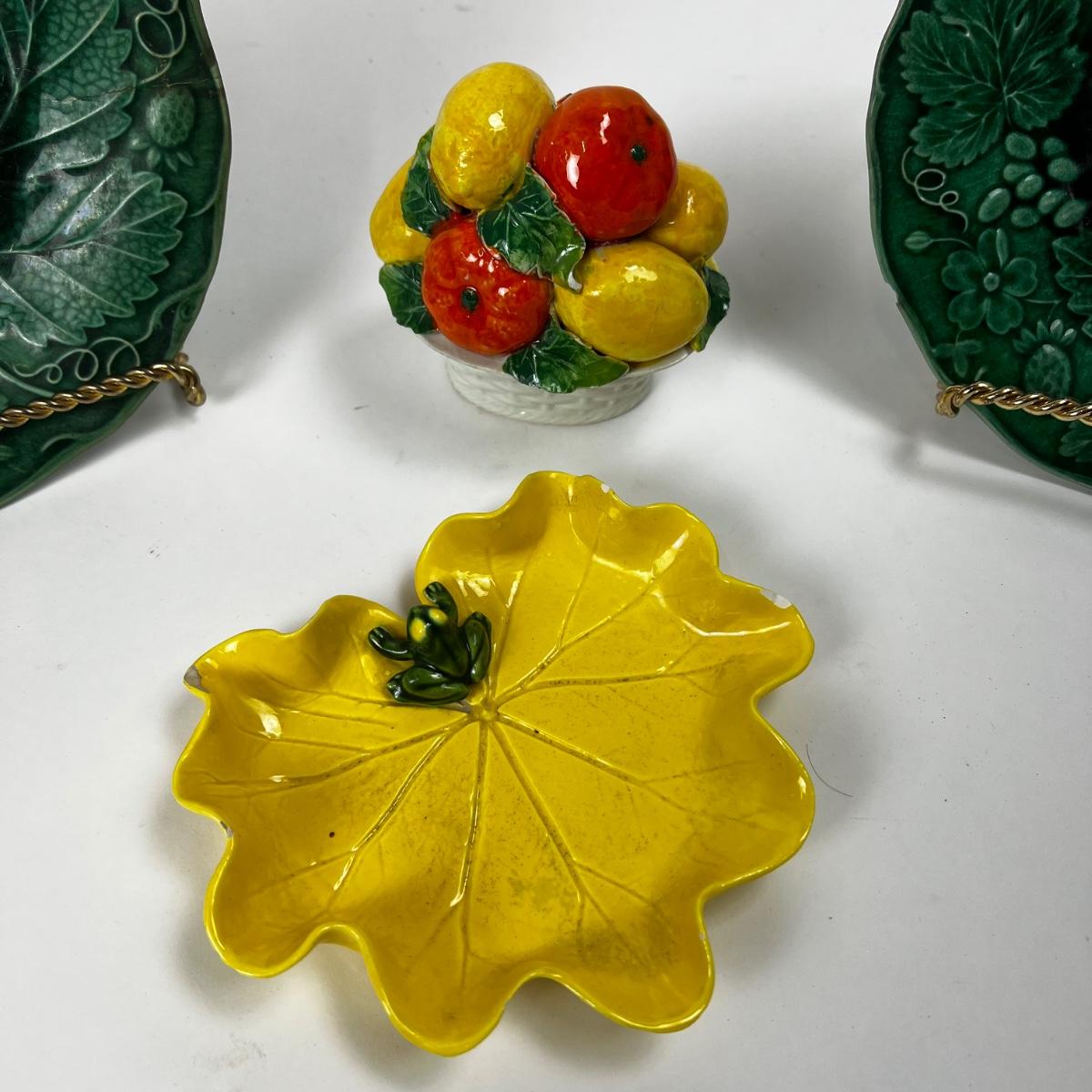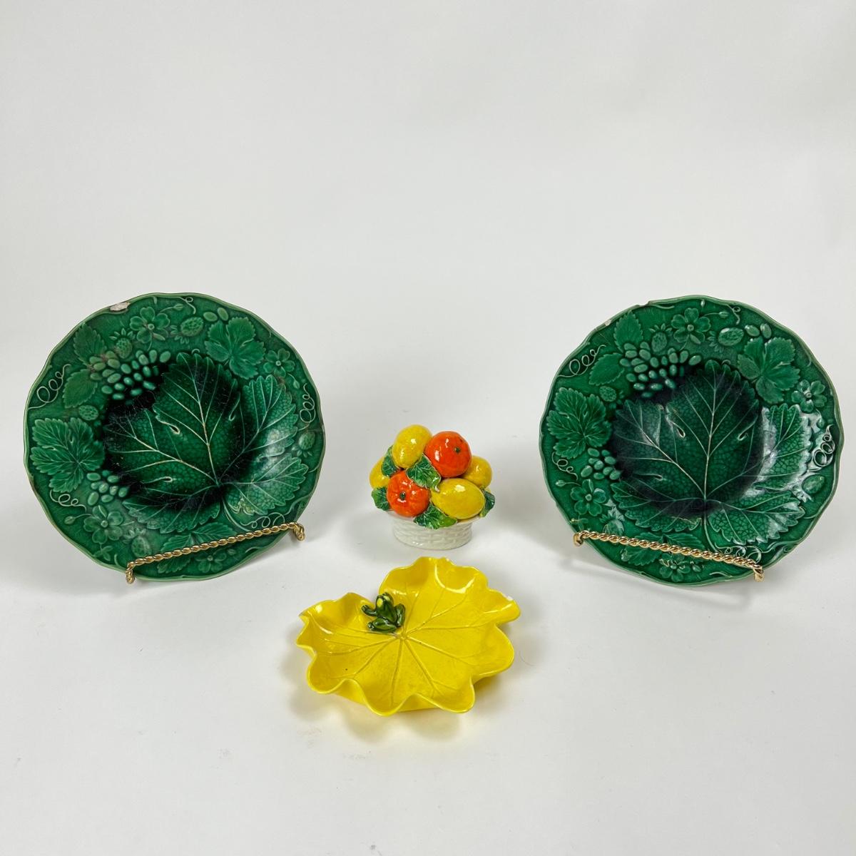 Lot of Majolica plates, frog & lily pad, and small fruit basket.