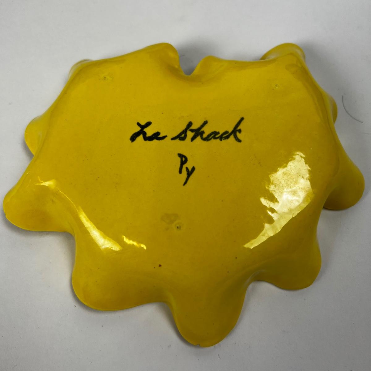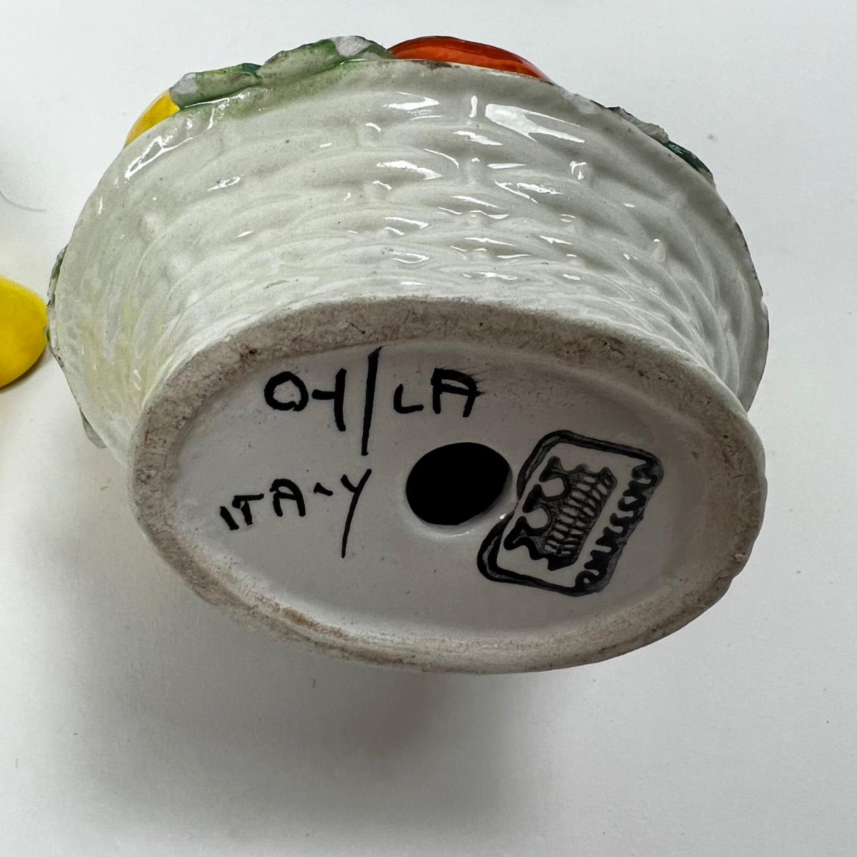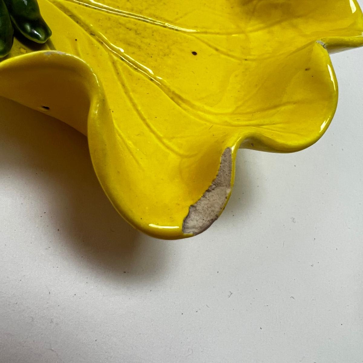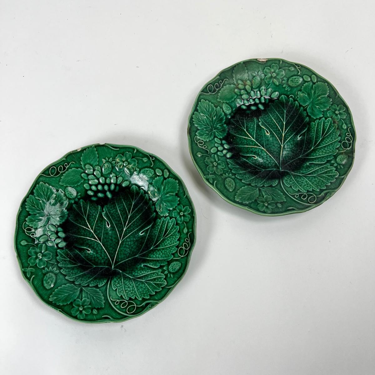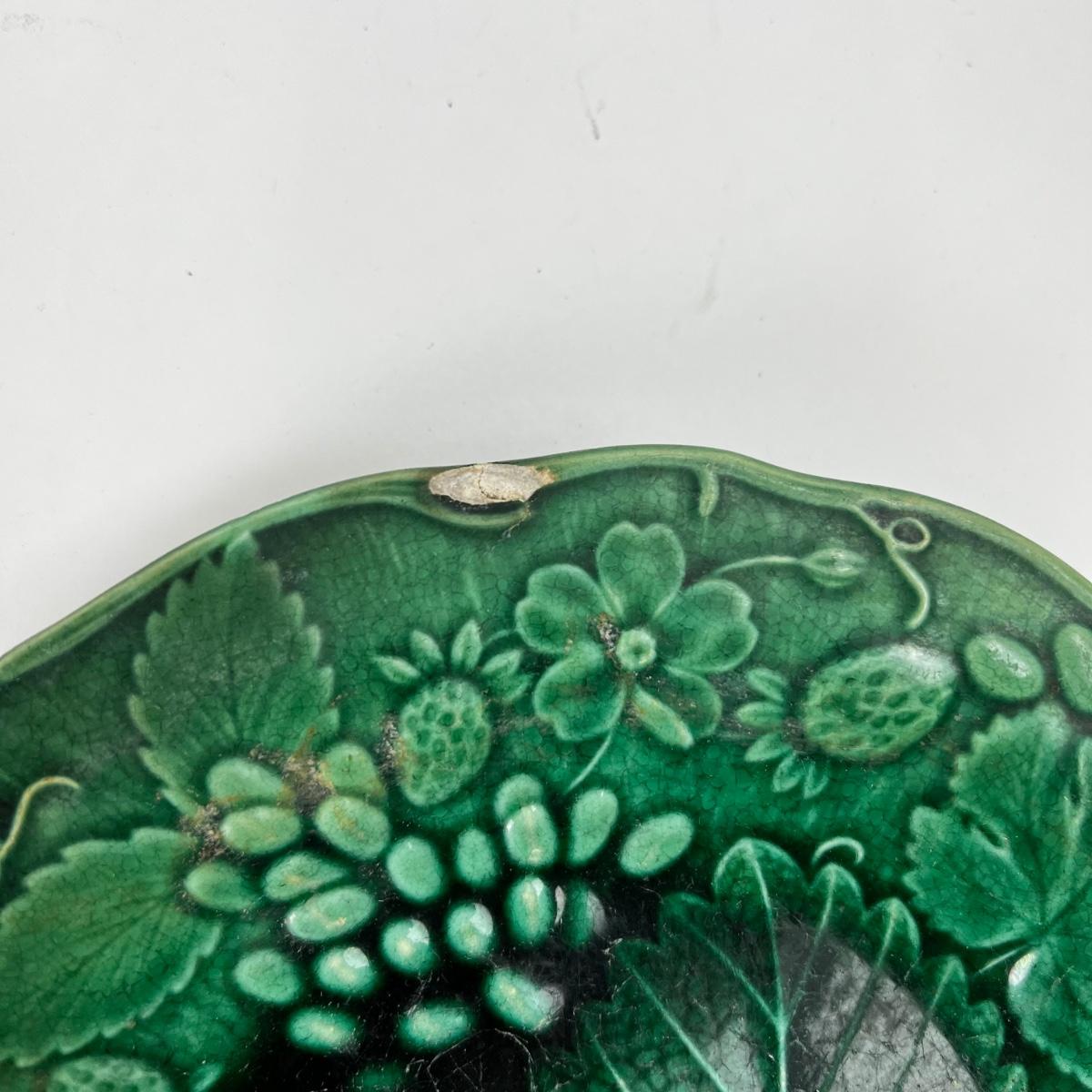 Lot of Majolica plates, frog & lily pad, and small fruit basket.