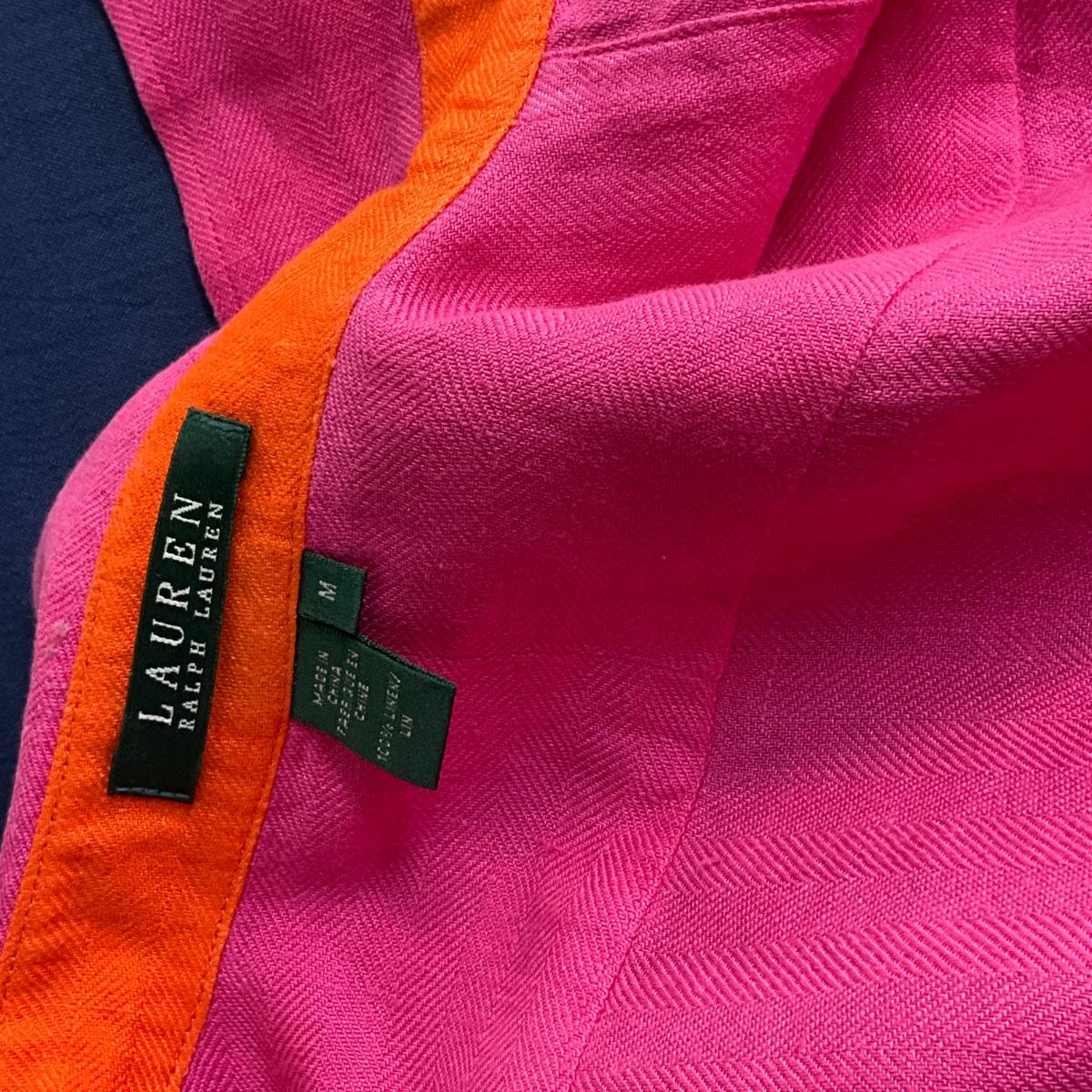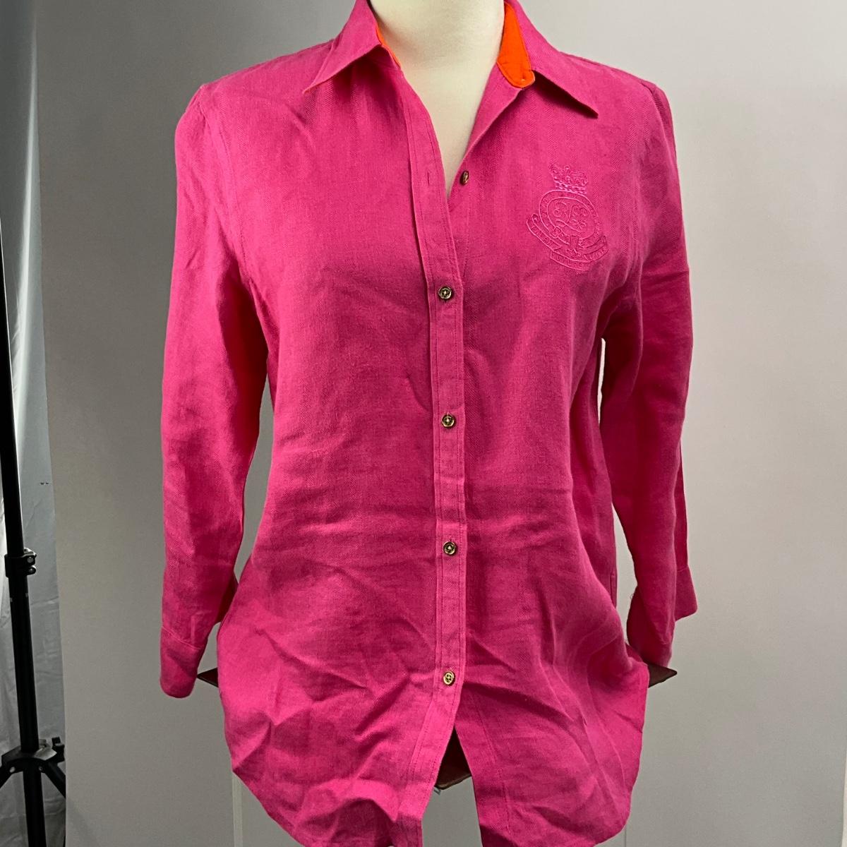 The top is 100% linen, hot pink with orange, embroidered Ralph Lauren Crest button up. It measures 20" from armpit to armpit and 26" in overall length.