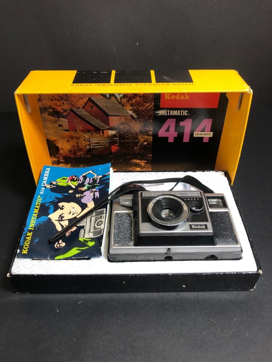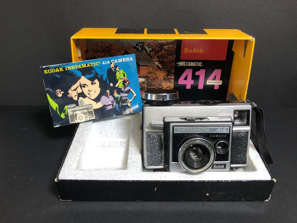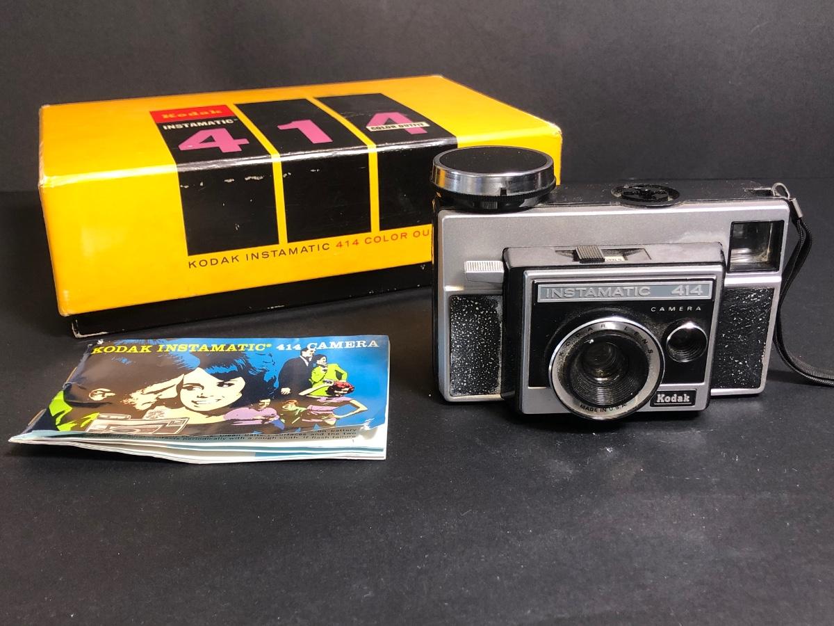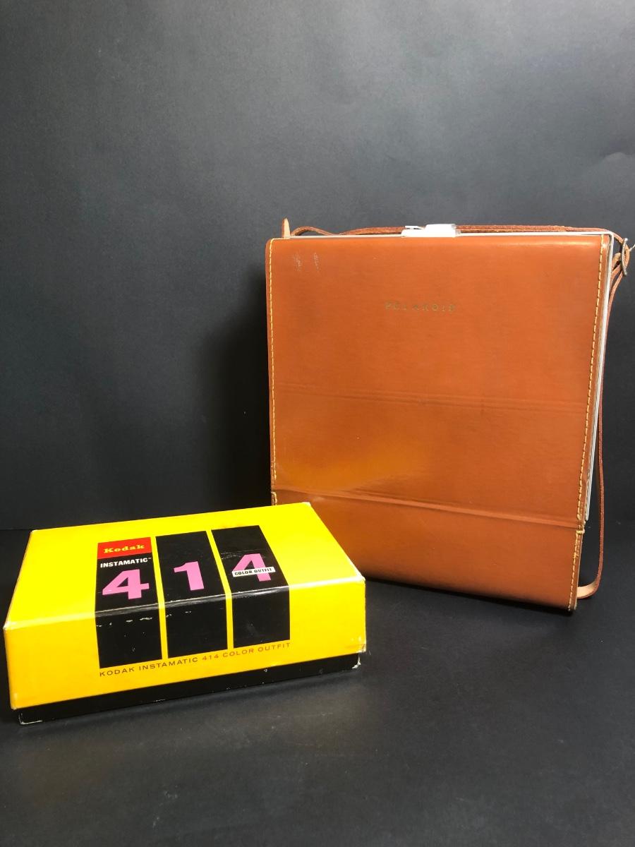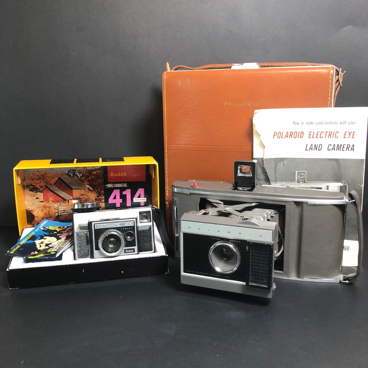 Includes the Kodak Instamatic 414 with its original box and the Polaroid Electric Eye Land Camera with its original case and instruction manual.