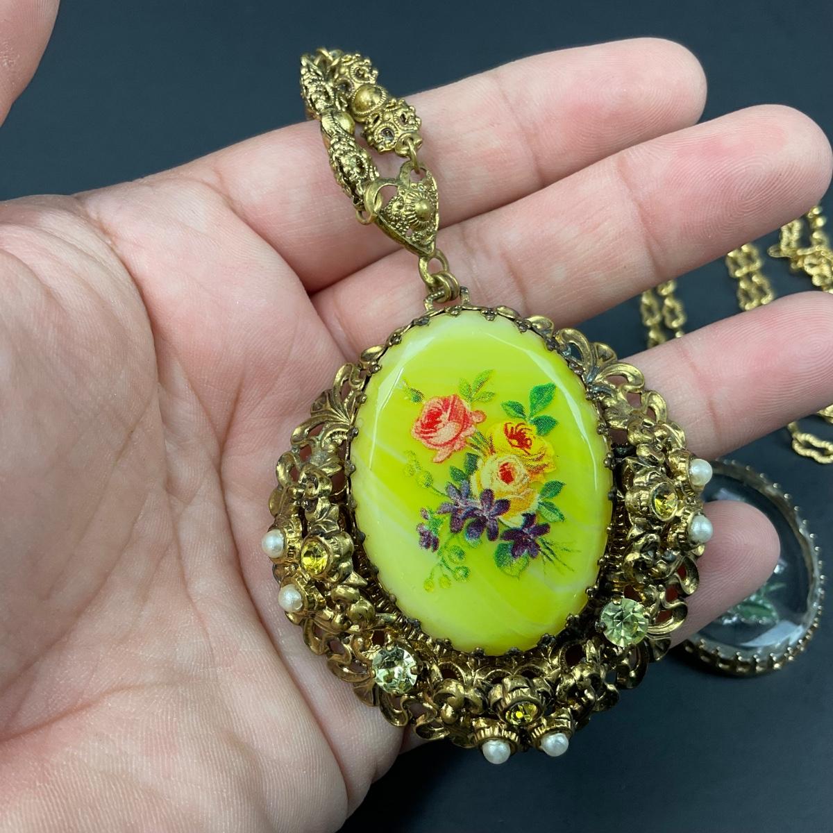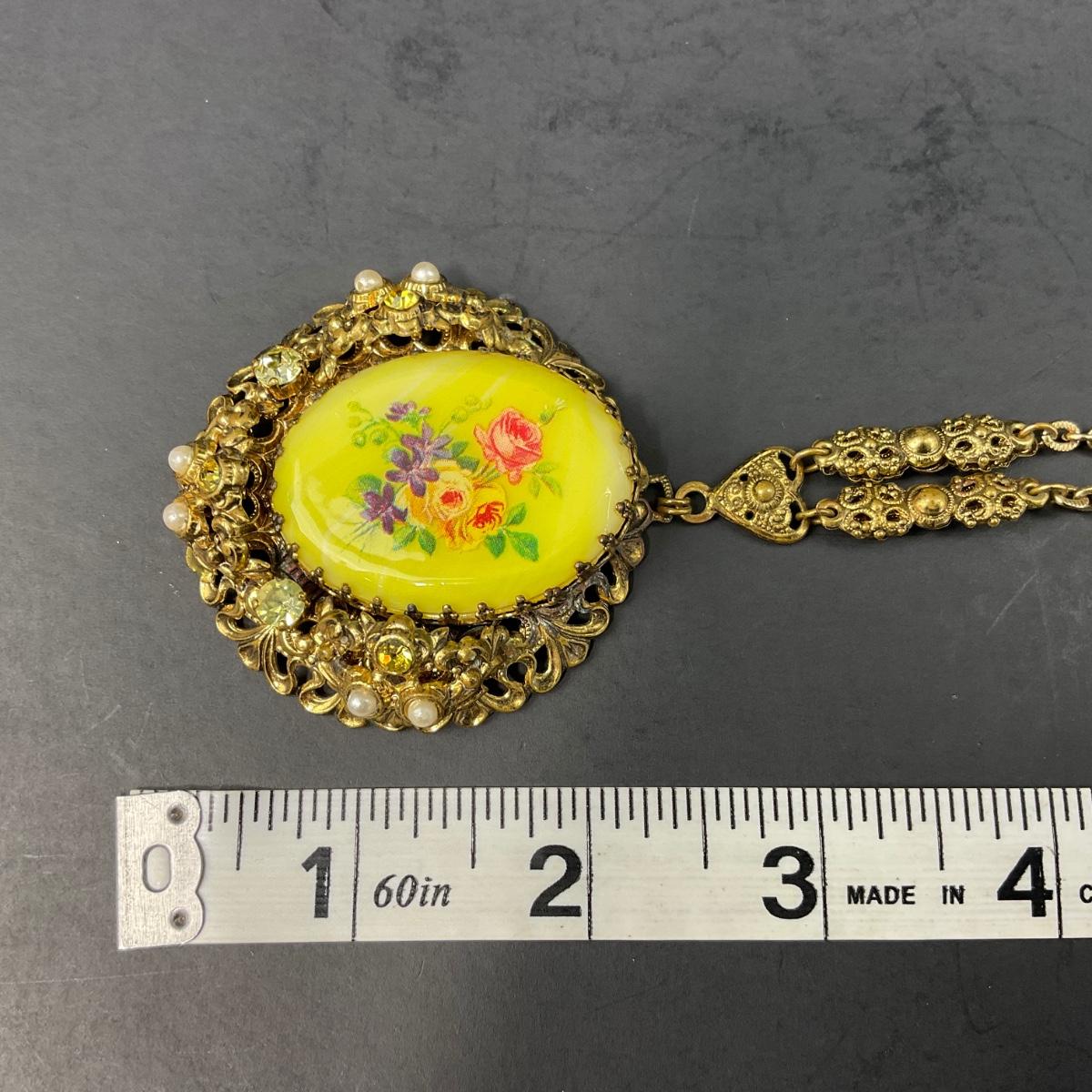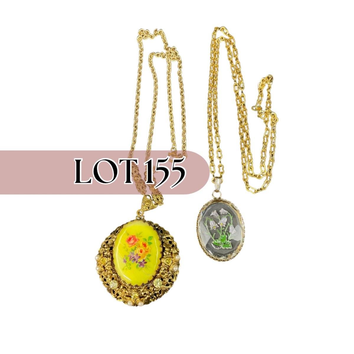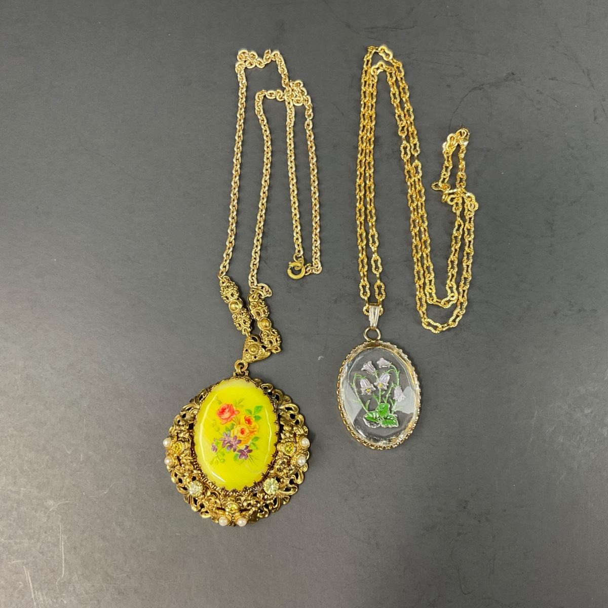 Two vintage statement pendant flower necklaces including one etched and painted flower pendant. Please see photos for details and condition. Any condition statement is given as a courtesy to a client, is an opinion, and should not be treated as a statement of fact. Reference to condition written, oral or within a condition report shall not be regarded as a full account of condition and may not include all defects, alterations, or restorations. Absence of a condition report does not imply a lot is flawless or lacking imperfections or damage. Katherine’s Auction & Appraisal Service shall have no responsibility for any error or omission. Returns shall not be accepted on the basis of condition. ::: Shipping is available on this lot. If you require shipping you must let us know at the close of the auction. We will coordinate with you after the item has been won. Shipping fees will include insurance up to or exceeding the value of all items being mailed. If you have any questions regarding this lot please contact the auctioneer either via this website, by direct email or by phone. PICK UP TIMES and other important information can be found in the TERMS and DESCRIPTION of the auction. Please take a look for pertinent information. Thanks!