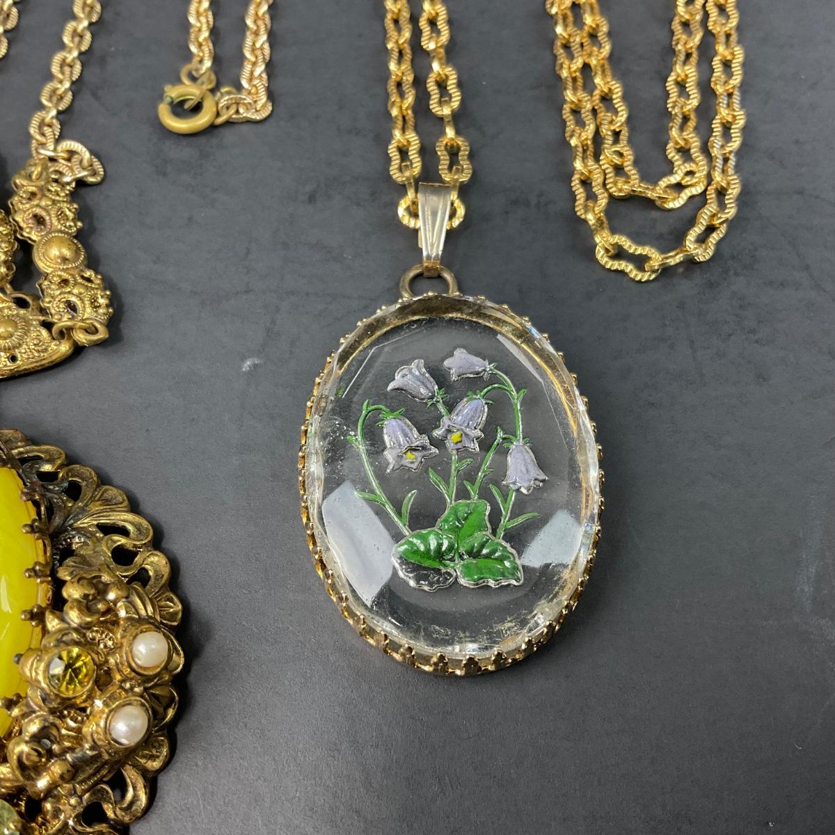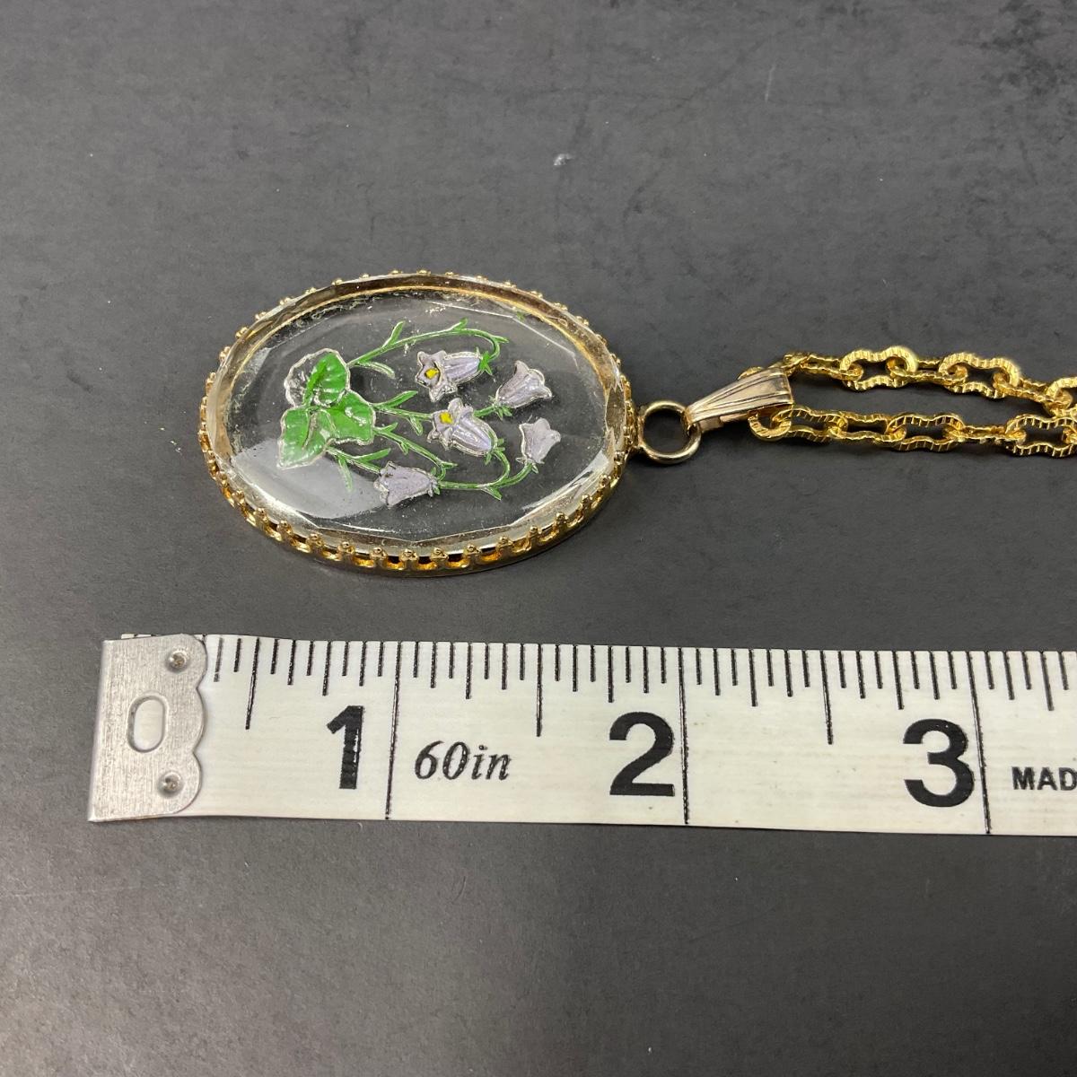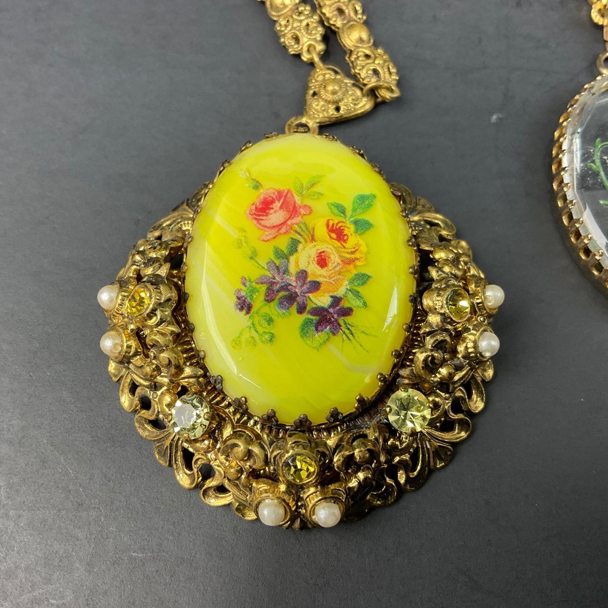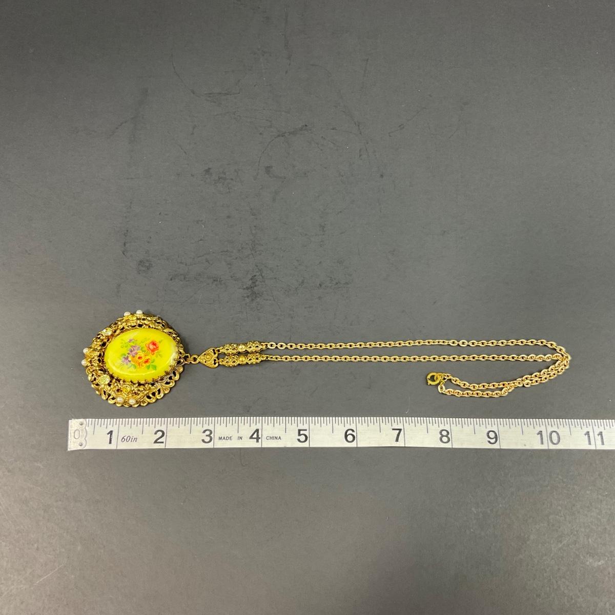 Two vintage statement pendant flower necklaces including one etched and painted flower pendant. Please see photos for details and condition. Any condition statement is given as a courtesy to a client, is an opinion, and should not be treated as a statement of fact. Reference to condition written, oral or within a condition report shall not be regarded as a full account of condition and may not include all defects, alterations, or restorations. Absence of a condition report does not imply a lot is flawless or lacking imperfections or damage. Katherine’s Auction & Appraisal Service shall have no responsibility for any error or omission. Returns shall not be accepted on the basis of condition. ::: Shipping is available on this lot. If you require shipping you must let us know at the close of the auction. We will coordinate with you after the item has been won. Shipping fees will include insurance up to or exceeding the value of all items being mailed. If you have any questions regarding this lot please contact the auctioneer either via this website, by direct email or by phone. PICK UP TIMES and other important information can be found in the TERMS and DESCRIPTION of the auction. Please take a look for pertinent information. Thanks!