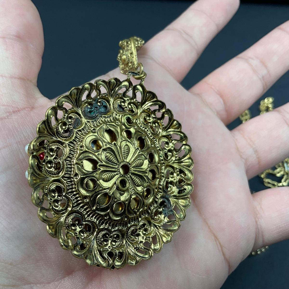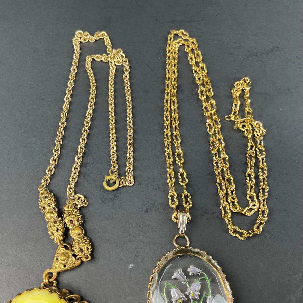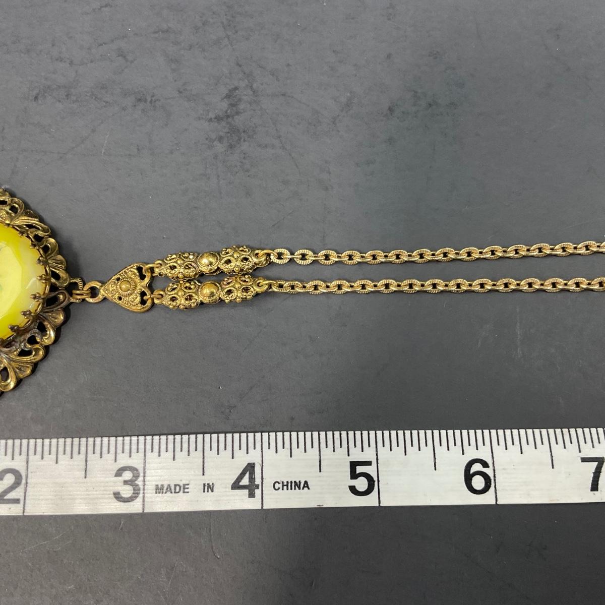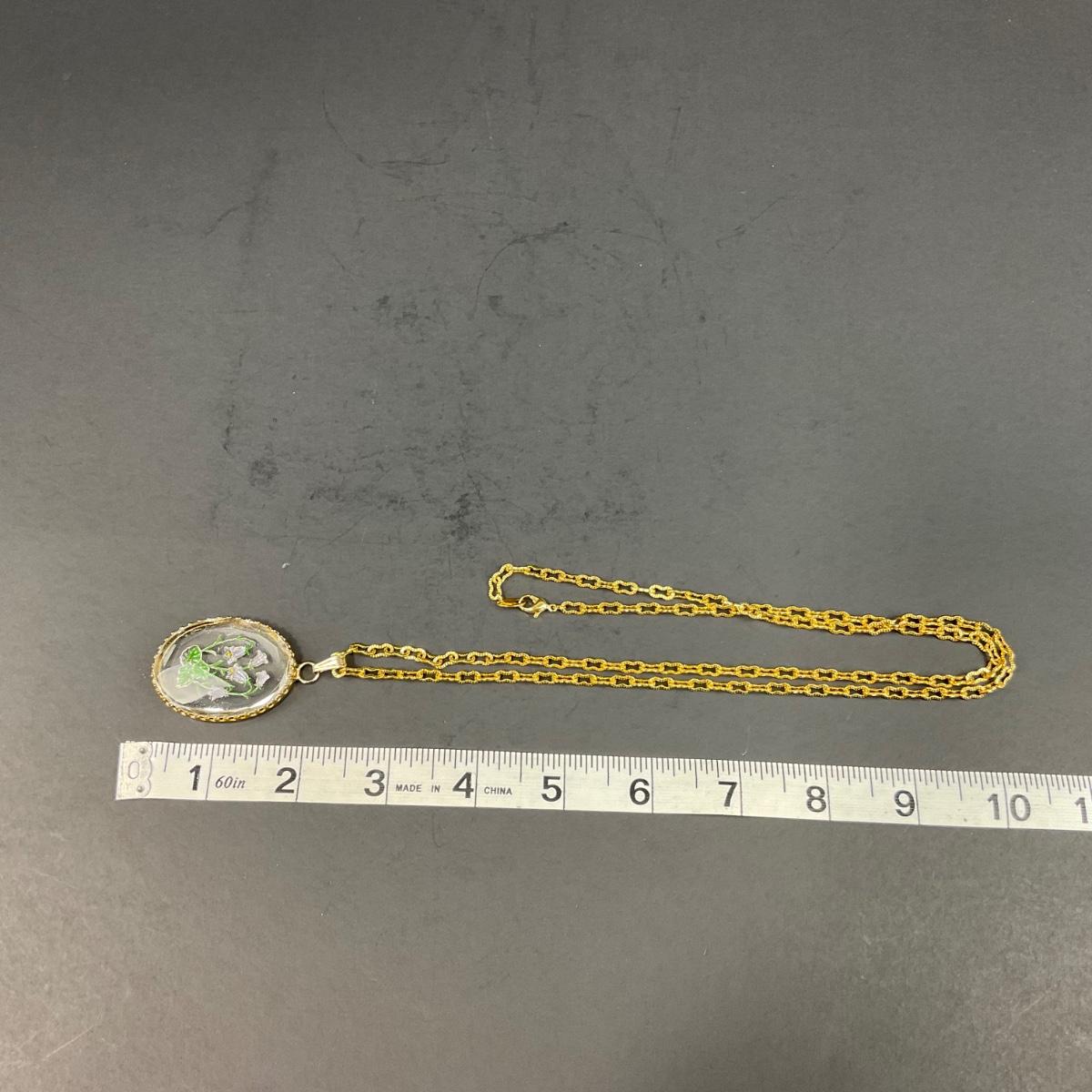Two vintage statement pendant flower necklaces including one etched and painted flower pendant. Please see photos for details and condition. Any condition statement is given as a courtesy to a client, is an opinion, and should not be treated as a statement of fact. Reference to condition written, oral or within a condition report shall not be regarded as a full account of condition and may not include all defects, alterations, or restorations. Absence of a condition report does not imply a lot is flawless or lacking imperfections or damage. Katherine’s Auction & Appraisal Service shall have no responsibility for any error or omission. Returns shall not be accepted on the basis of condition. ::: Shipping is available on this lot. If you require shipping you must let us know at the close of the auction. We will coordinate with you after the item has been won. Shipping fees will include insurance up to or exceeding the value of all items being mailed. If you have any questions regarding this lot please contact the auctioneer either via this website, by direct email or by phone. PICK UP TIMES and other important information can be found in the TERMS and DESCRIPTION of the auction. Please take a look for pertinent information. Thanks!