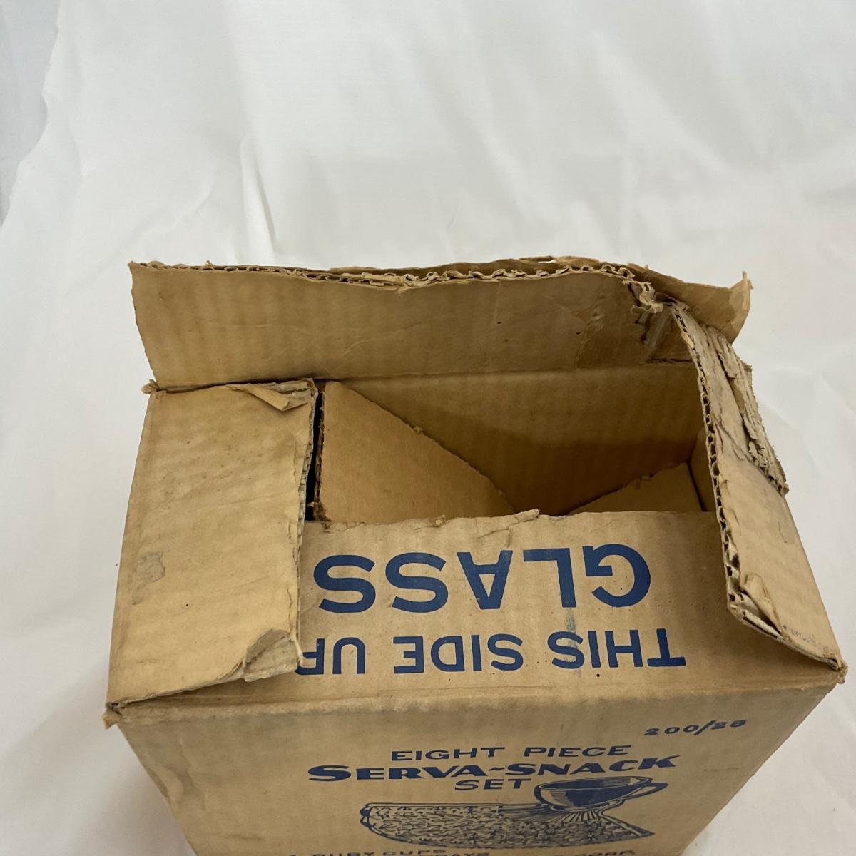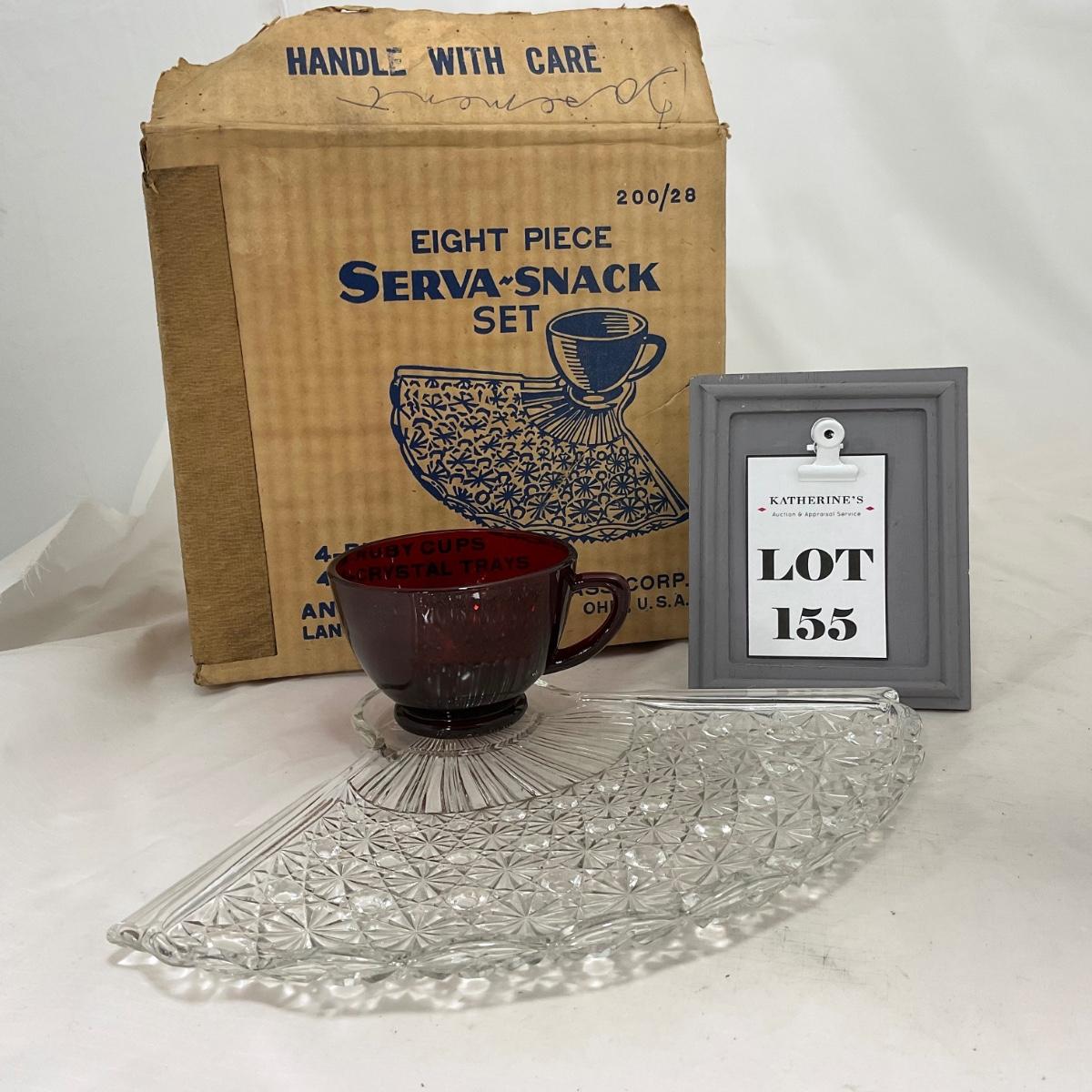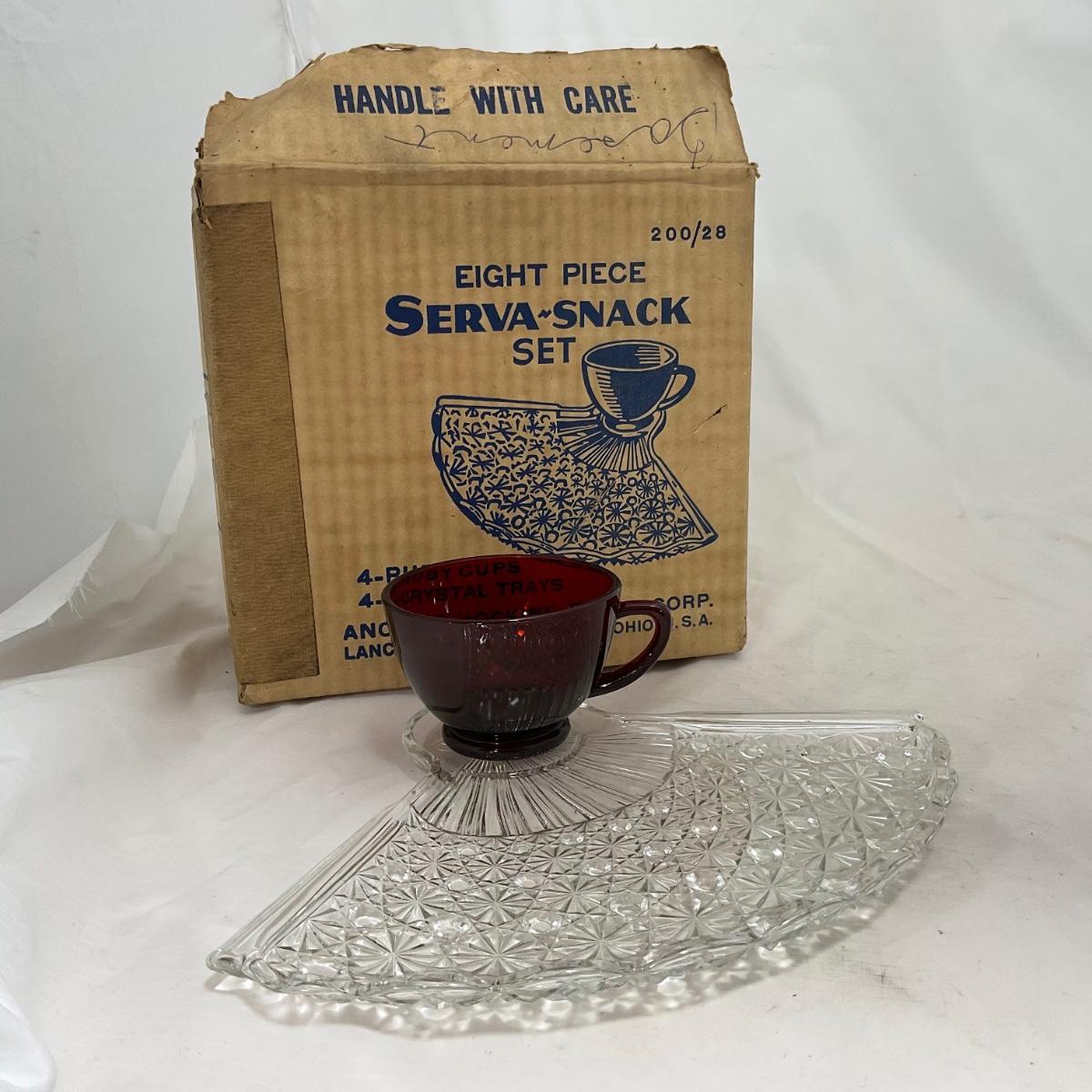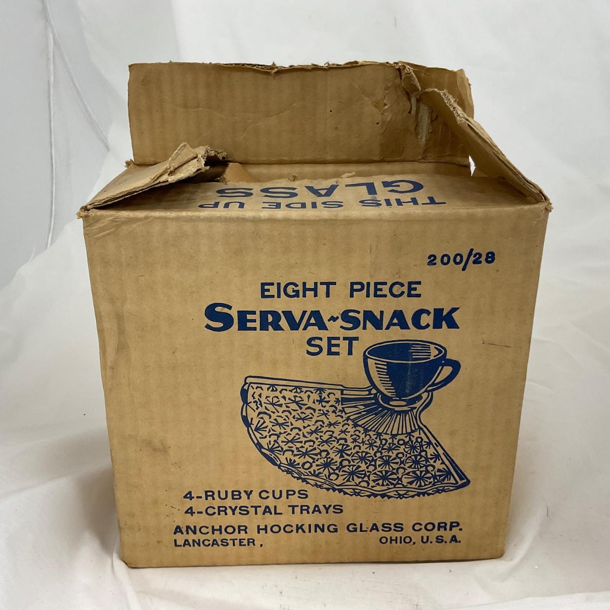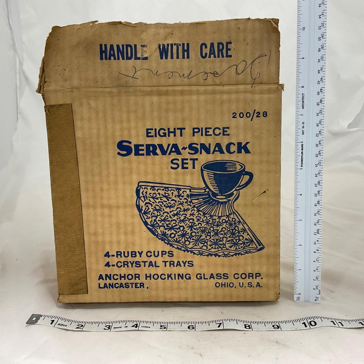 Eight piece Serva - Snack set new in box four ruby red glasses and four clear glass fan shaped dishes. Anchor Hocking Set. Please see photos for details and condition. ::: Shipping is available on this lot. If you require shipping you must let us know at the close of the auction. We will coordinate with you after the item has been won. Shipping fees will include insurance up to or exceeding the value of all items being mailed. If you have any questions regarding this lot please contact the auctioneer either via this website, by direct email or by phone. PICK UP TIMES and other important information can be found in the TERMS and DESCRIPTION of the auction. Please take a look for pertinent information. Thanks!