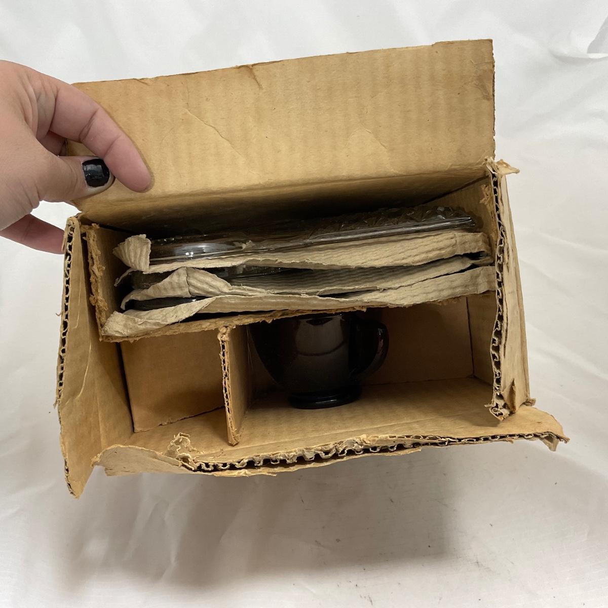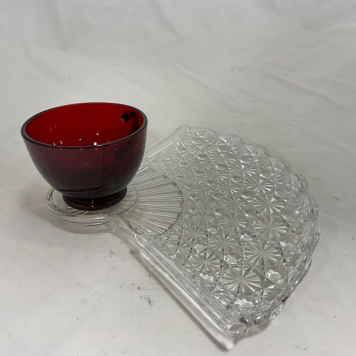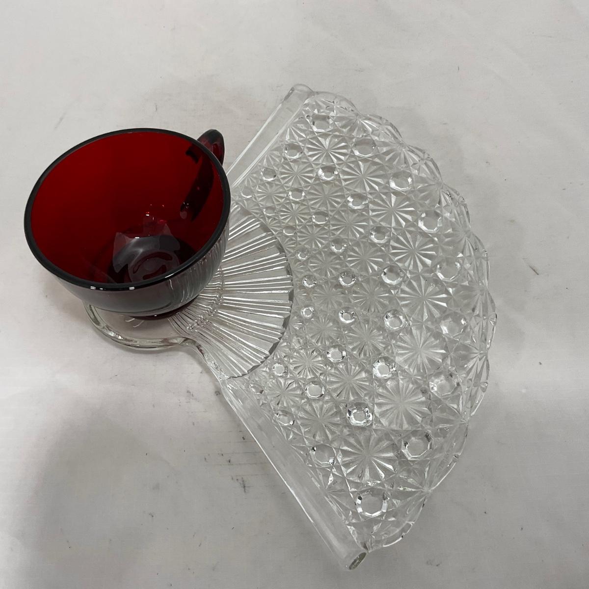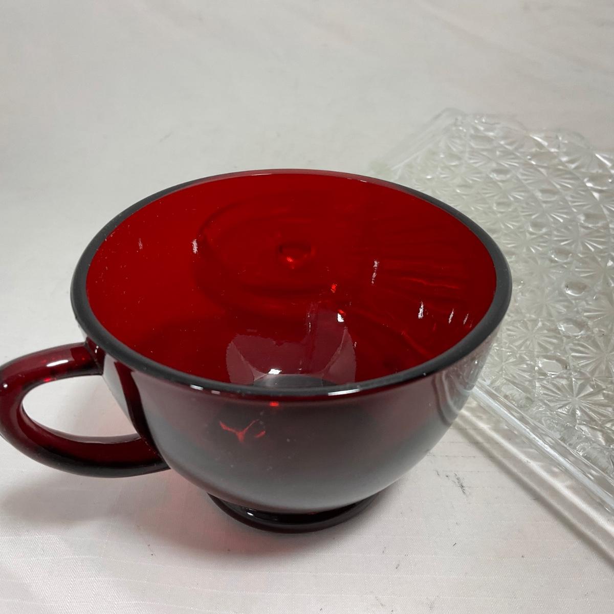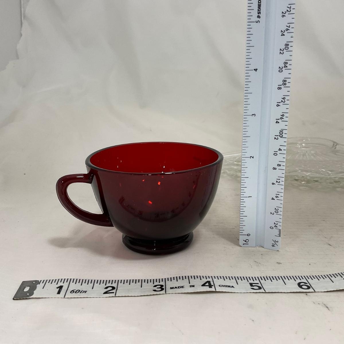 Eight piece Serva - Snack set new in box four ruby red glasses and four clear glass fan shaped dishes. Anchor Hocking Set. Please see photos for details and condition. ::: Shipping is available on this lot. If you require shipping you must let us know at the close of the auction. We will coordinate with you after the item has been won. Shipping fees will include insurance up to or exceeding the value of all items being mailed. If you have any questions regarding this lot please contact the auctioneer either via this website, by direct email or by phone. PICK UP TIMES and other important information can be found in the TERMS and DESCRIPTION of the auction. Please take a look for pertinent information. Thanks!