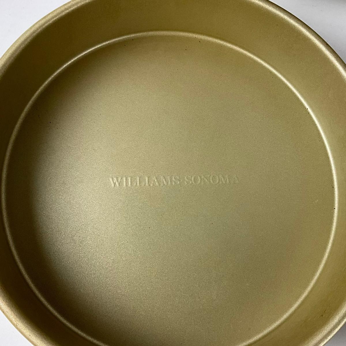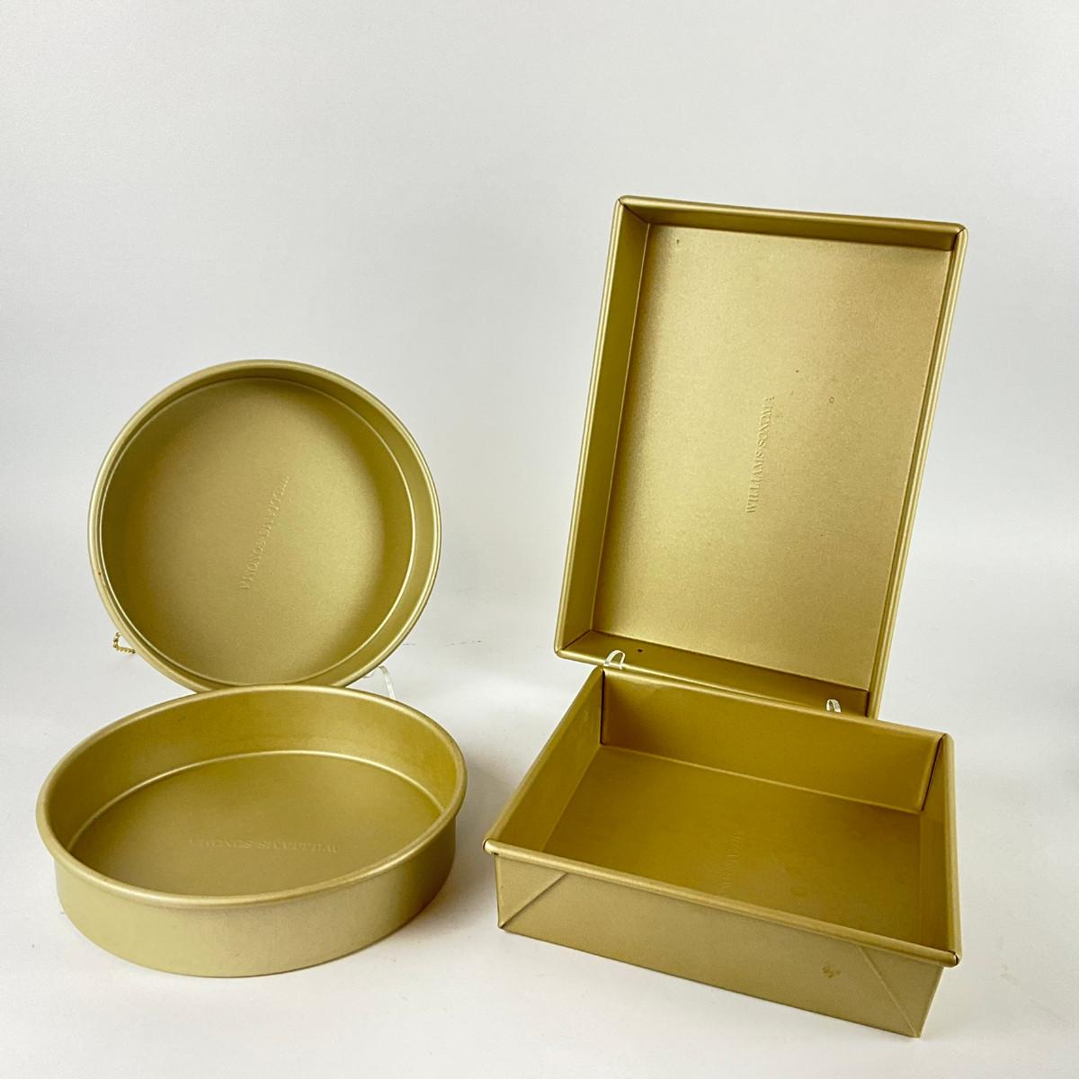 Has two 9.5" diameter pans, one 13.5" wide x 9.5" deep rectangle pan, and one 9.5" square pan
