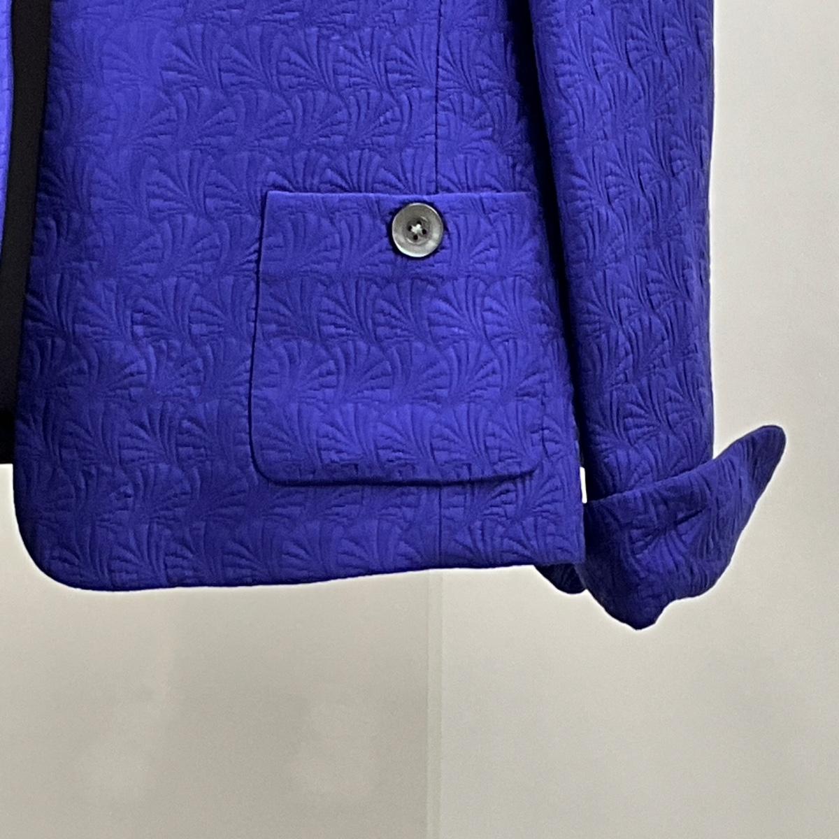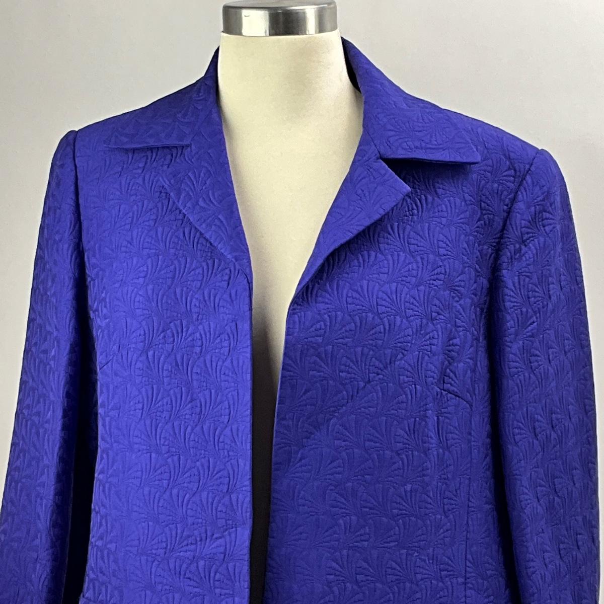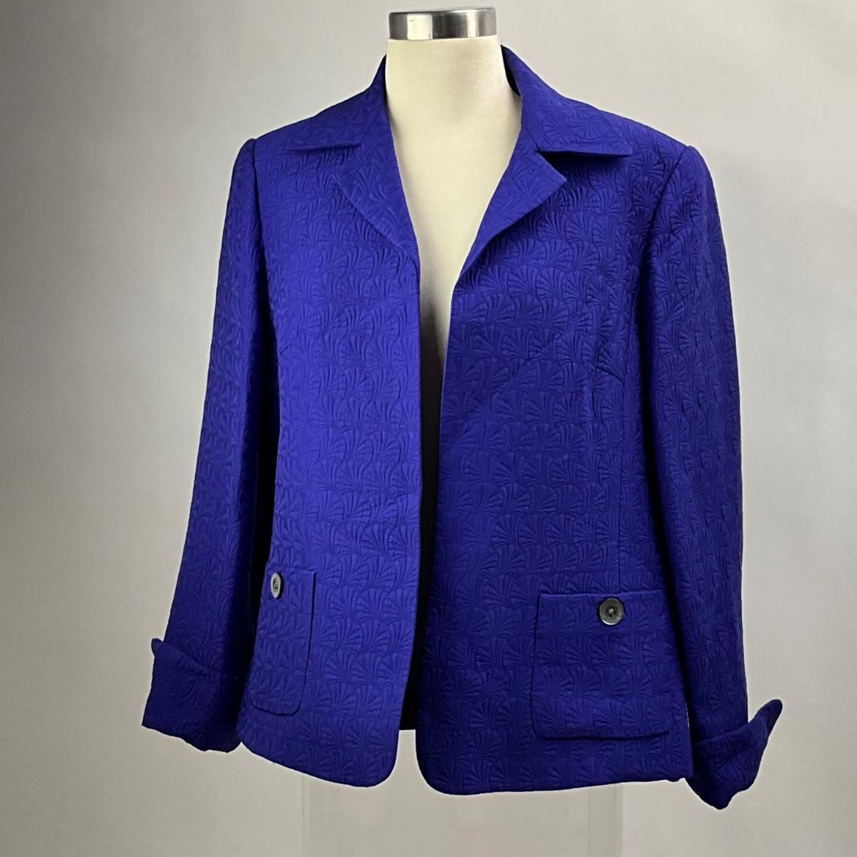 The blazer is cotton with silk lining quilted texture, open front, excellent condition, measures 20" from armpit to armpit and 26" overall length