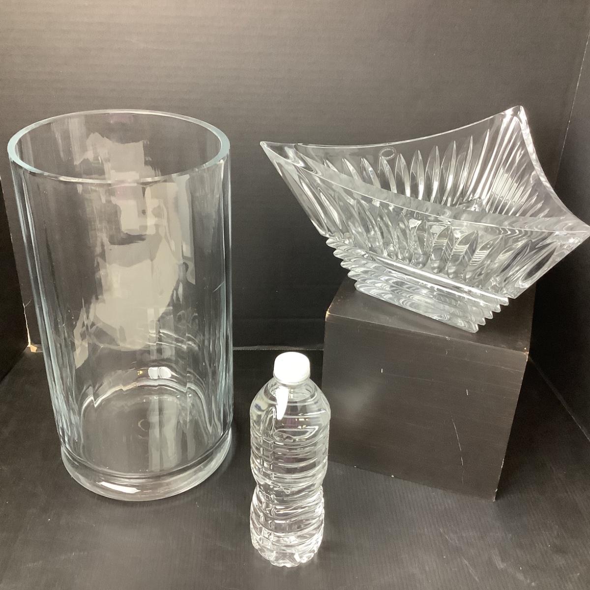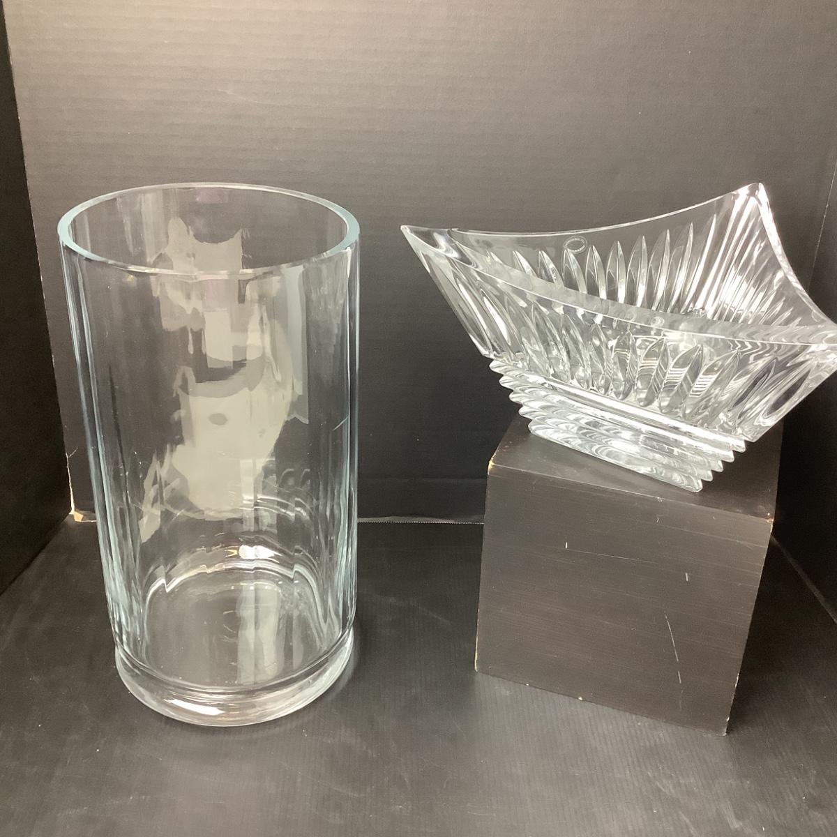 Cylinder Vase is 13" tall and 7" in diameter, the triangular dish is 5" tall and 11" across.