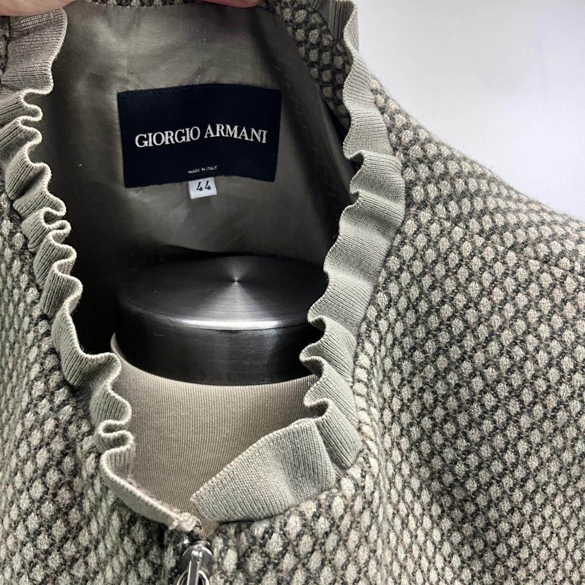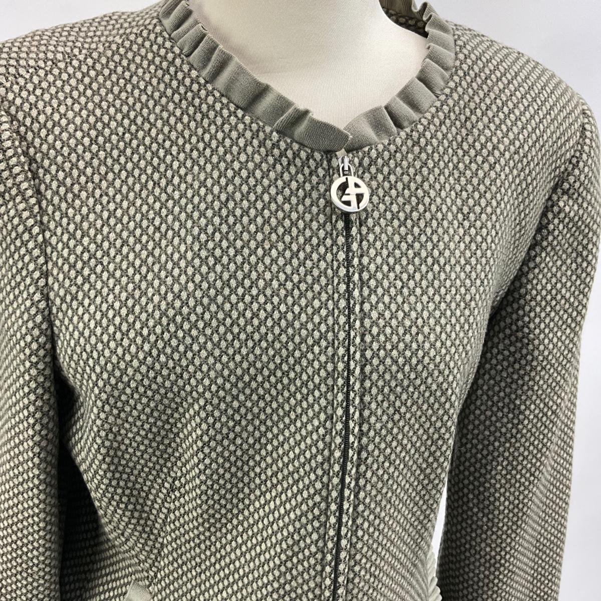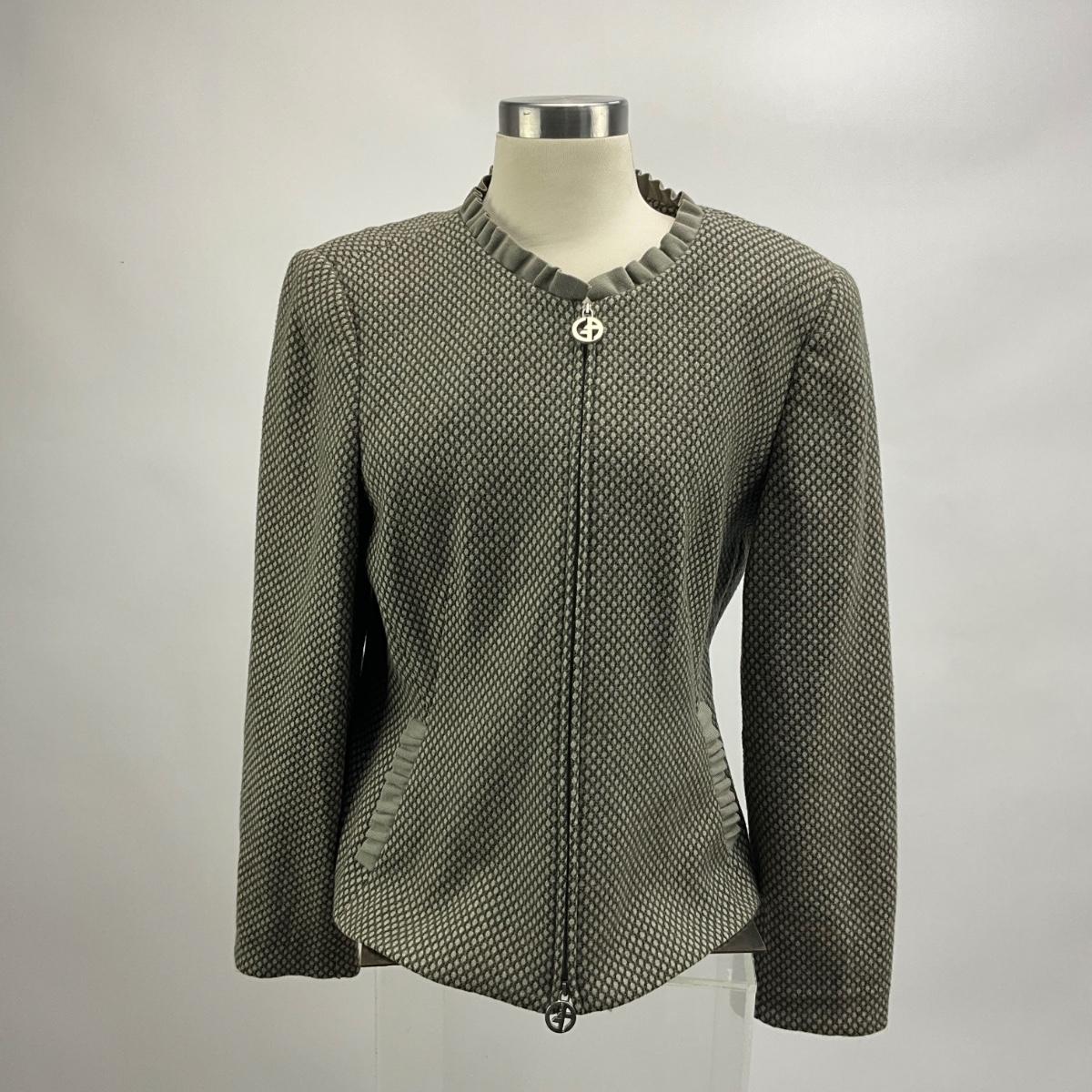 The blazer is cashmere wool blend, Borgo 21, ruffle details at the collars and pocket trim. It measures 20" from pit to pit and 24" overall length.