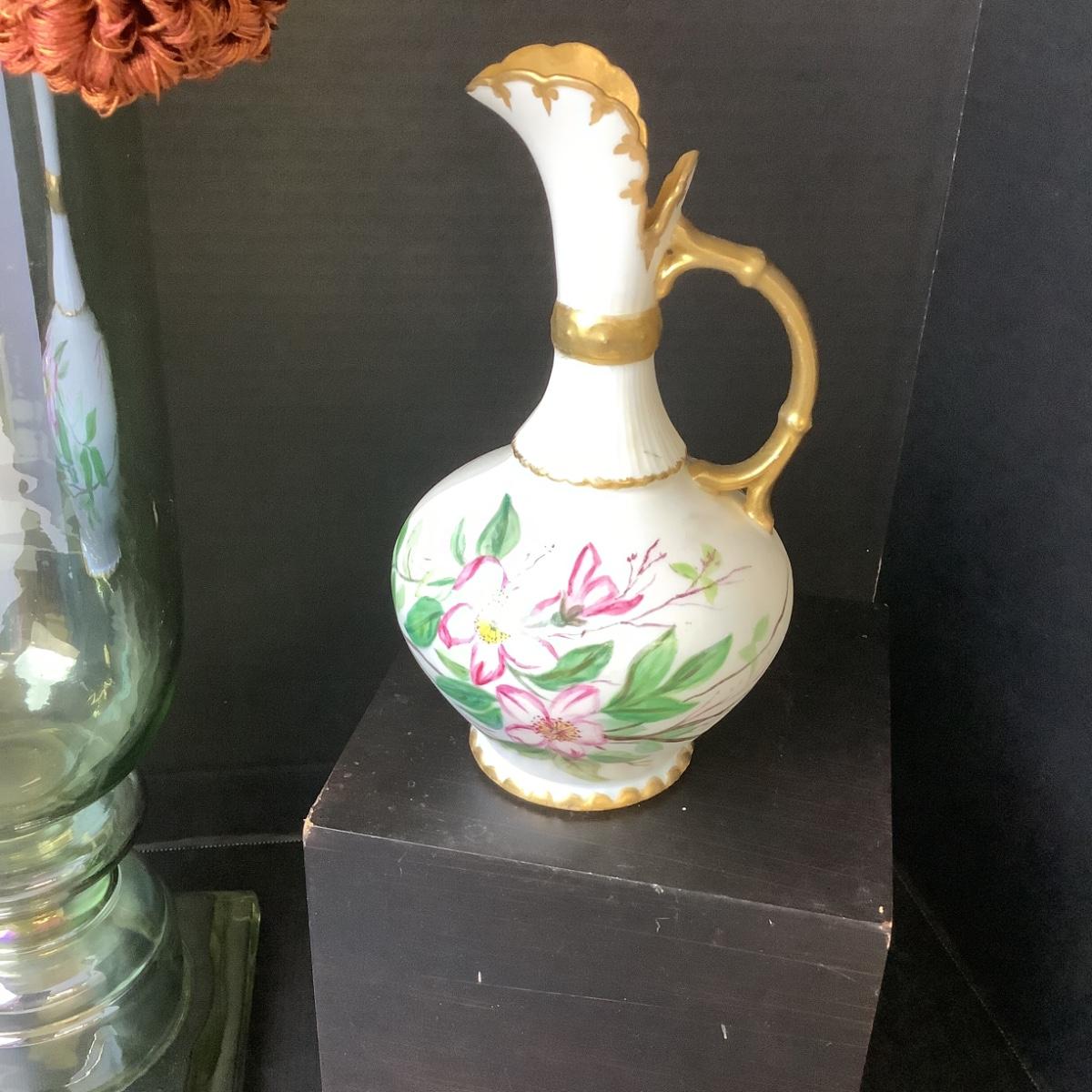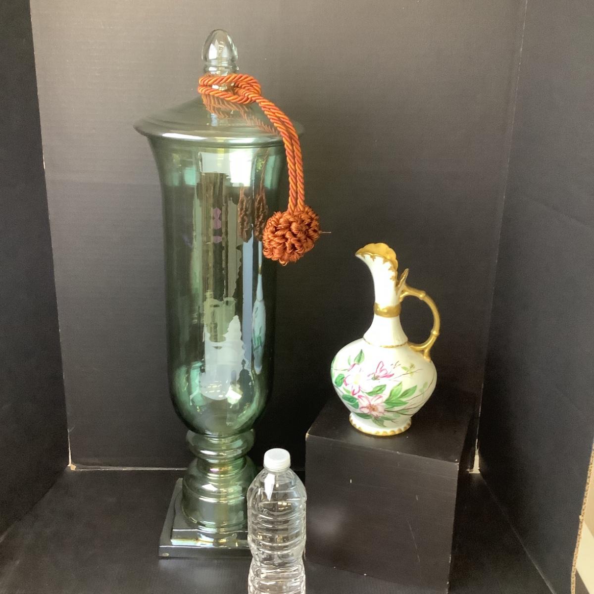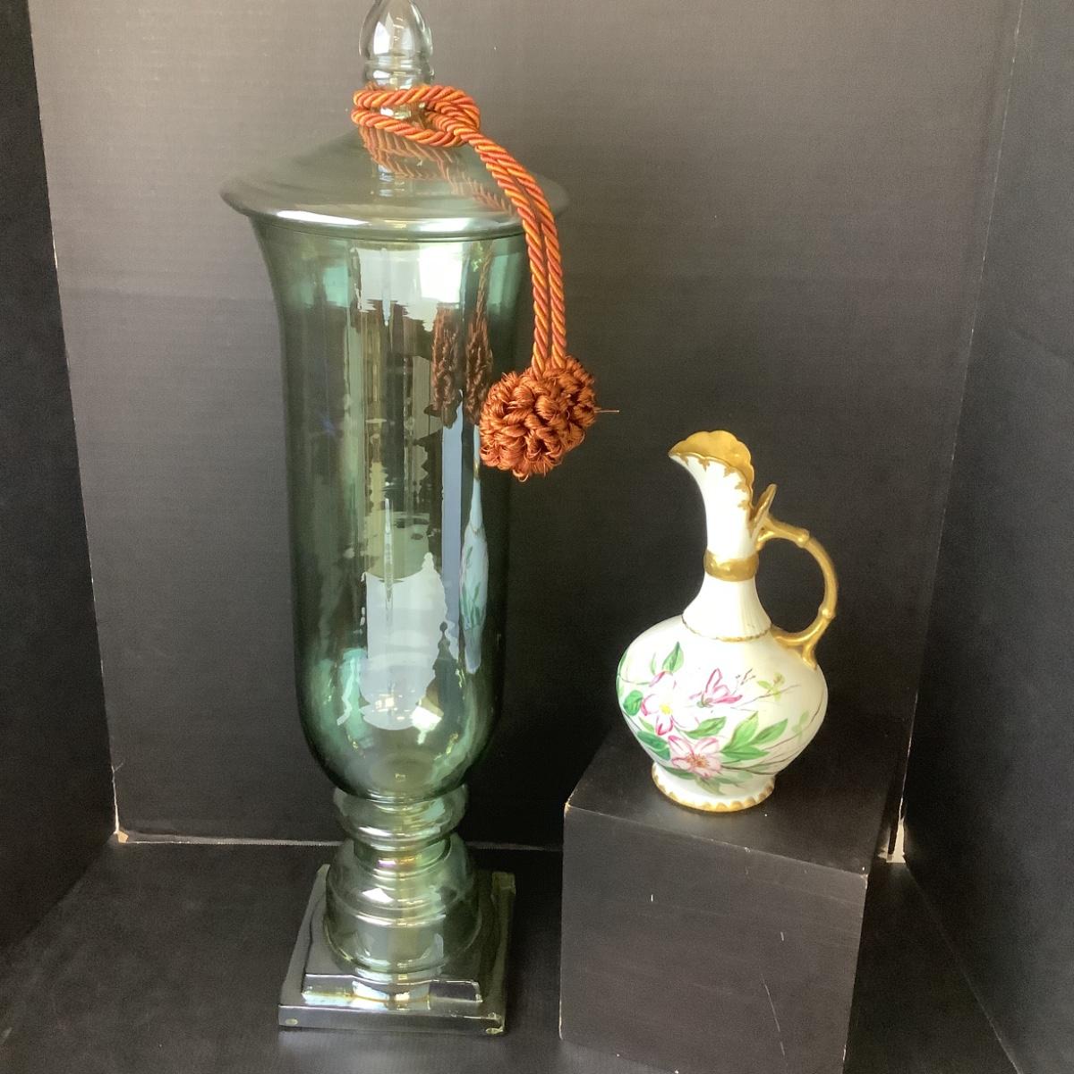 Apothecary jar is 25" tall and 8" in diameter, the ewer is 9.5" tall and 5" in diameter.