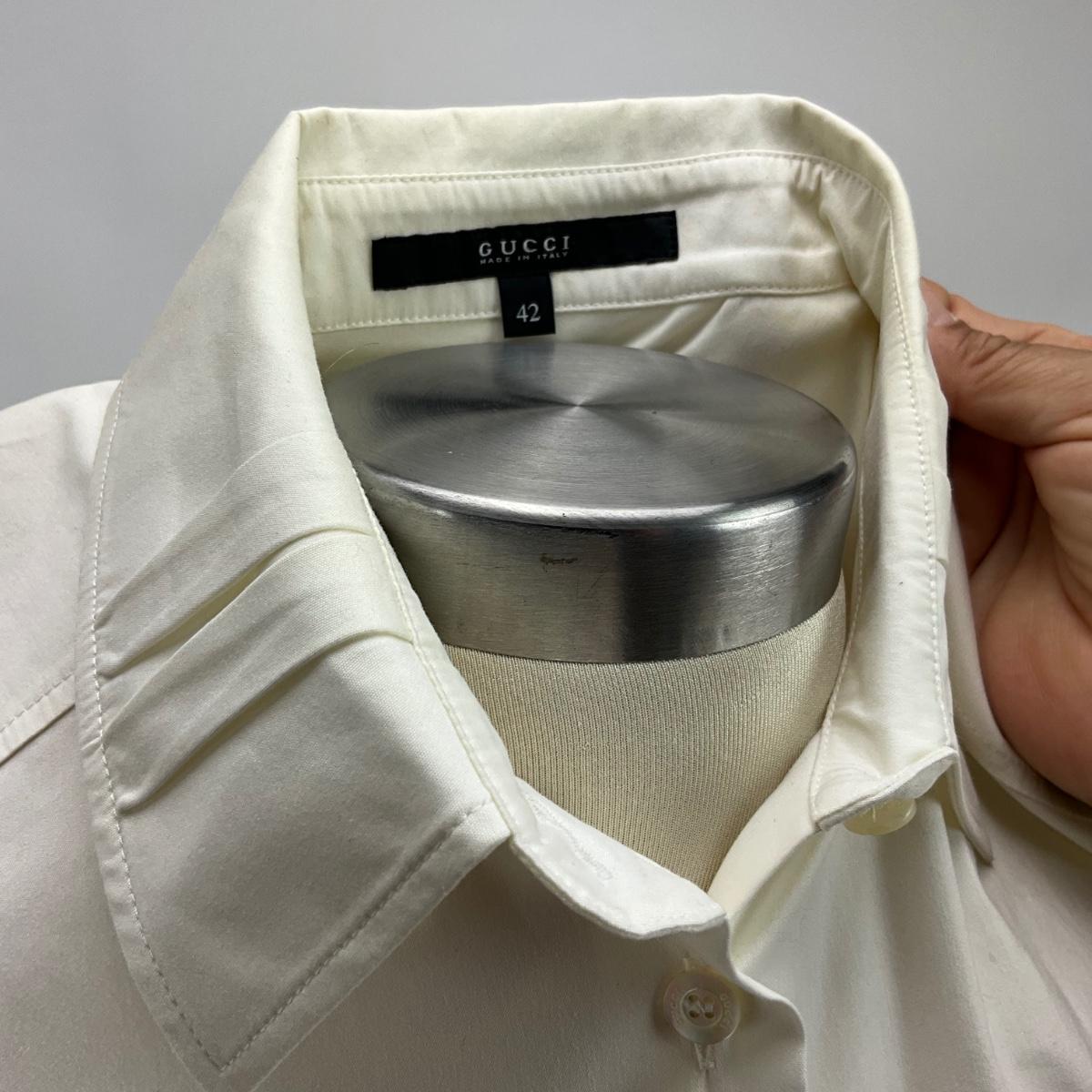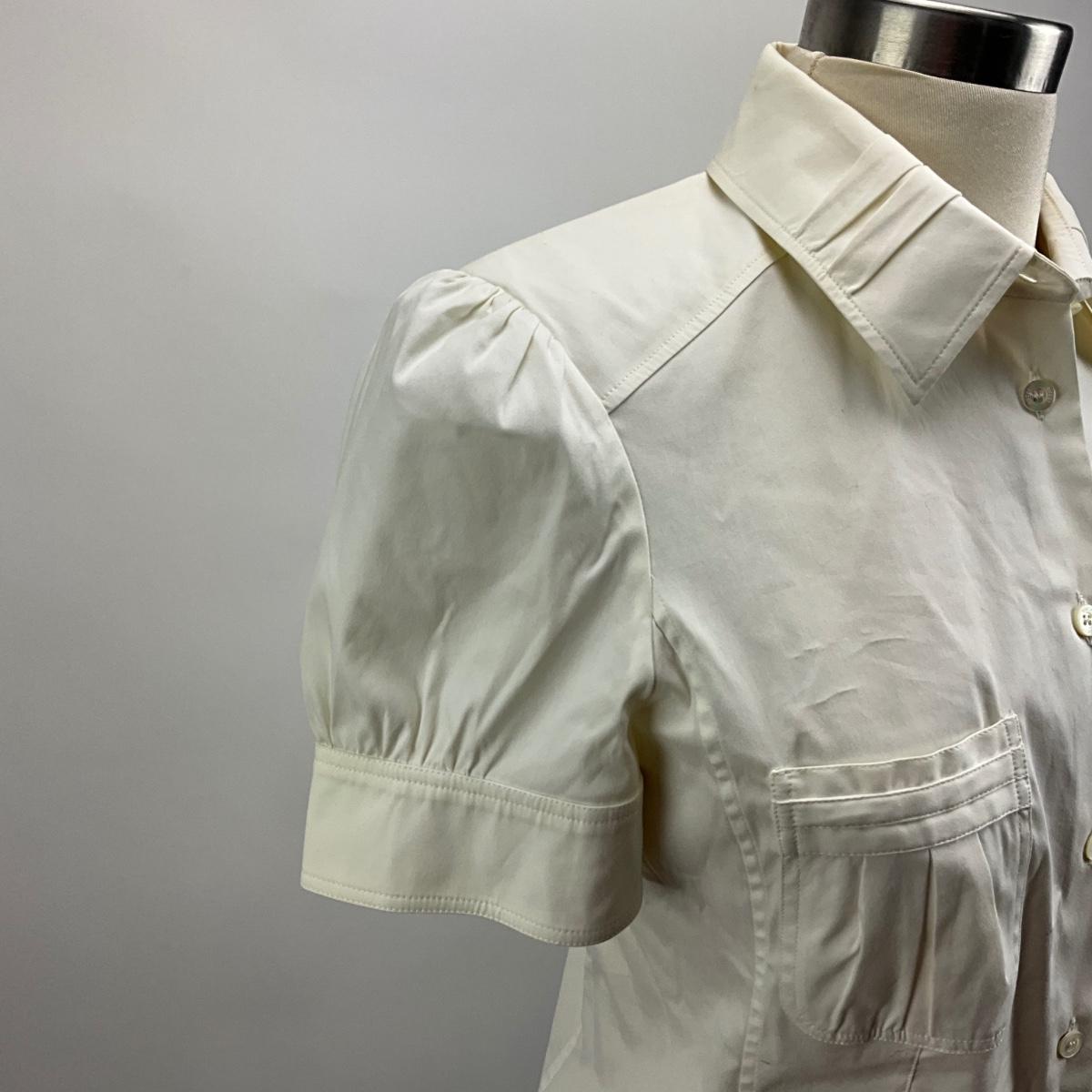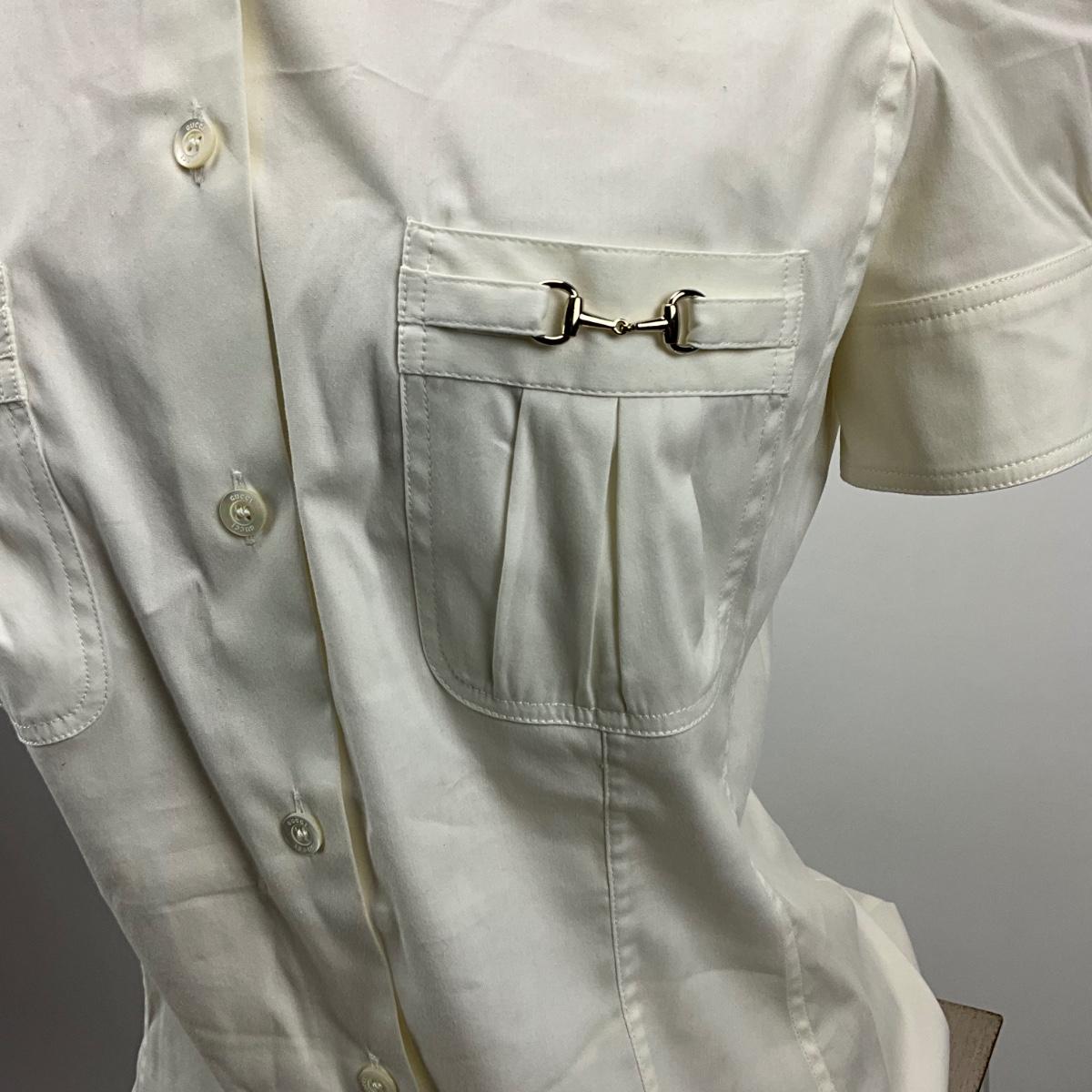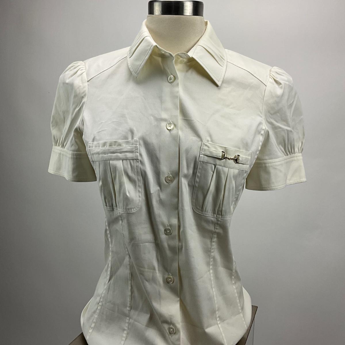 Top is white with gold tone bit hardware on pocket, cap short sleeves, measures 17.5" from armpit to armpit and 27" in overall length. (Size 42 is US 10)