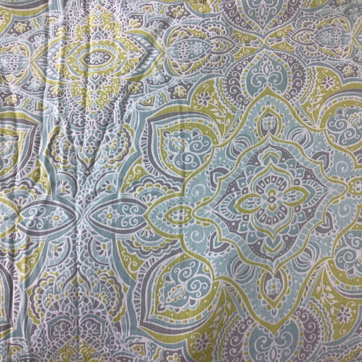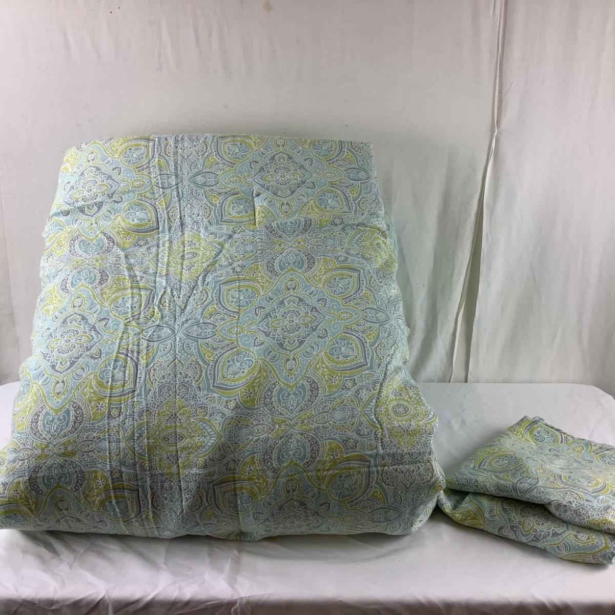 Blue, green and purple in color, comforter is 96" x 88" and the 2 shams are king size and they zip.