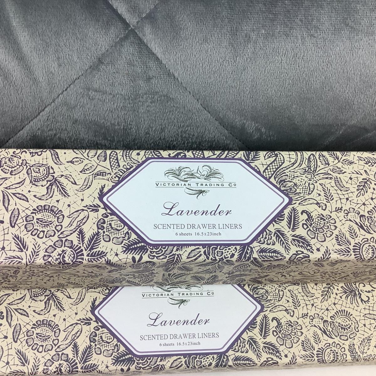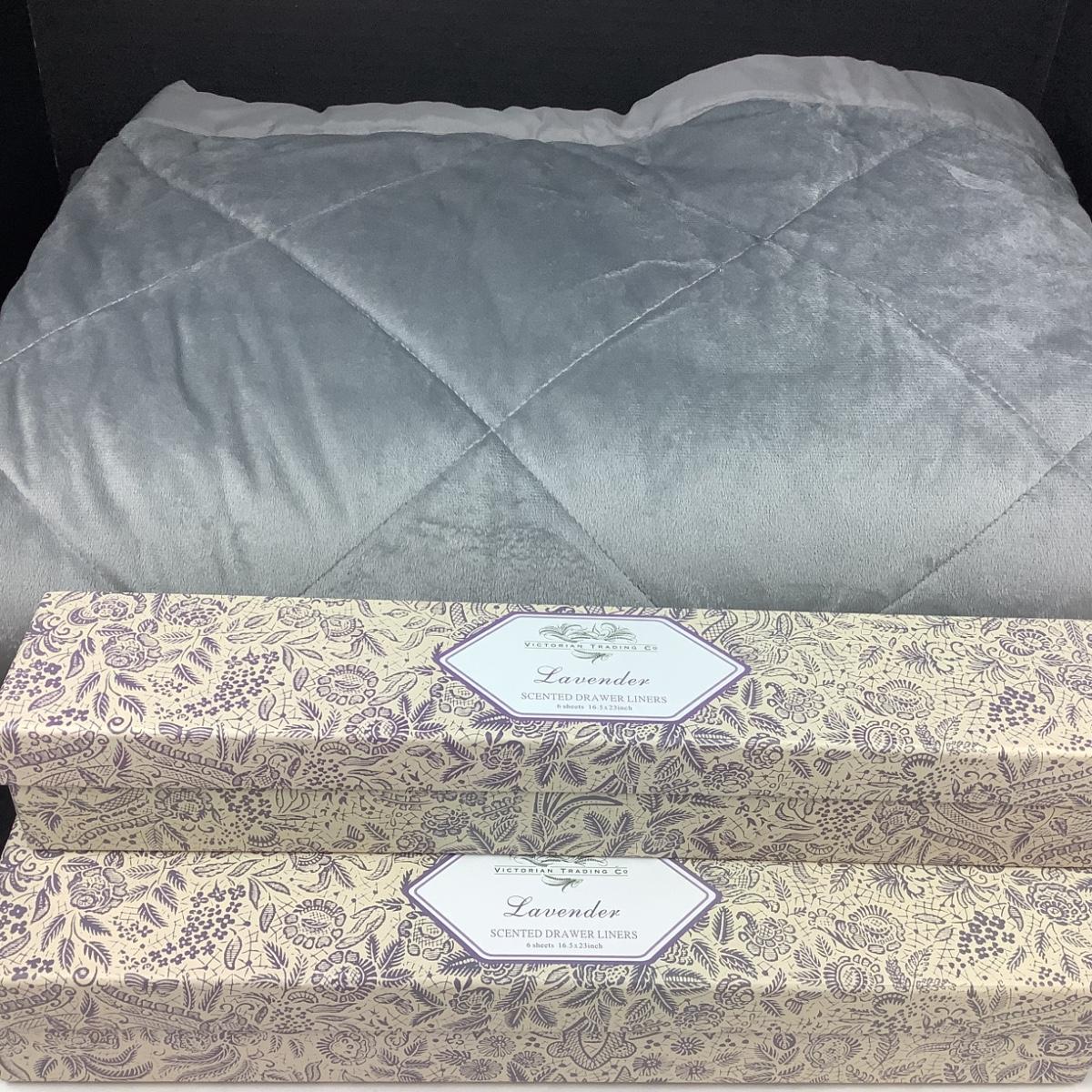 King size blanket in good condition with three boxes of Victorian Trading Co. Lavender Scented Drawer Liners