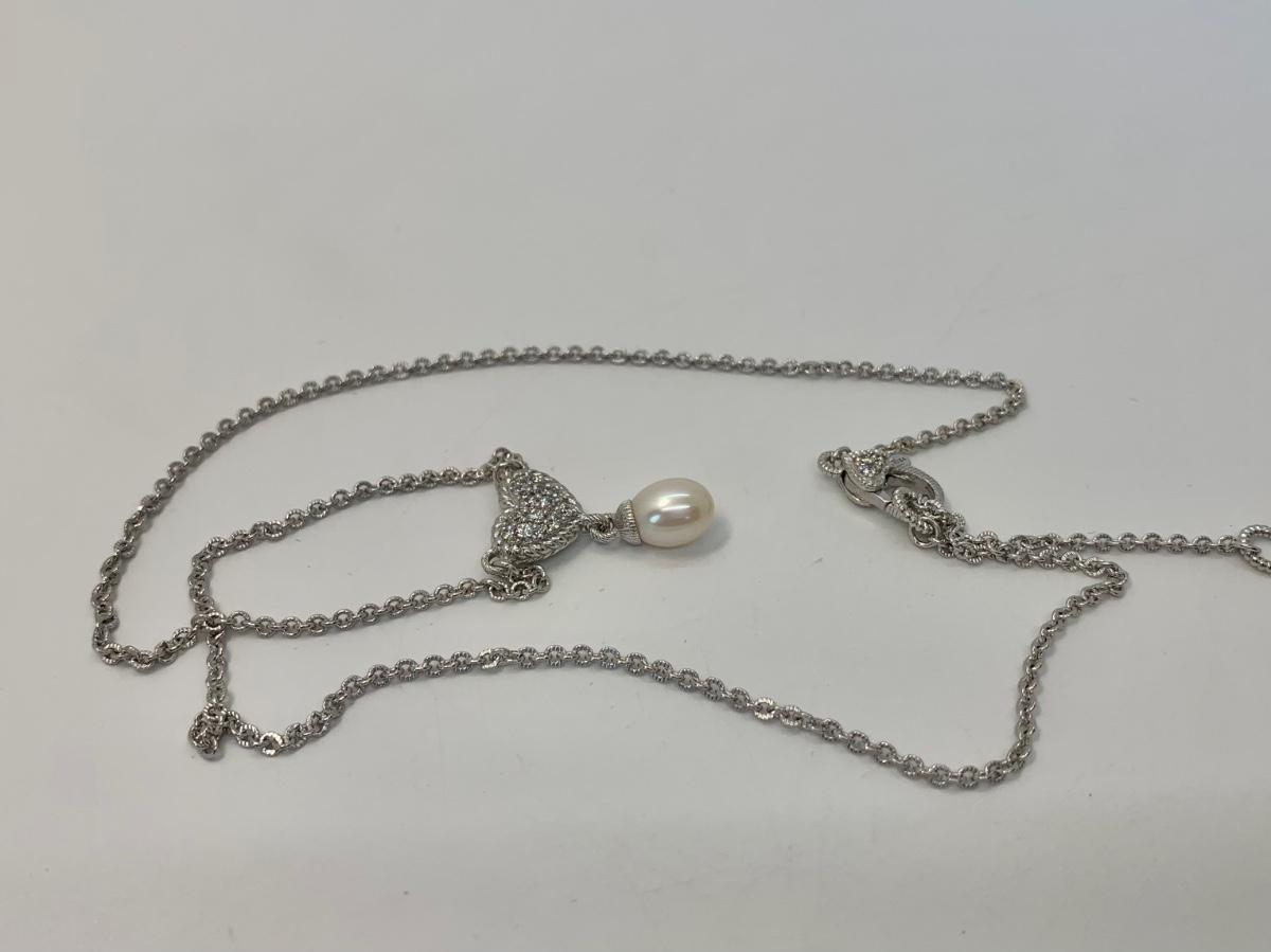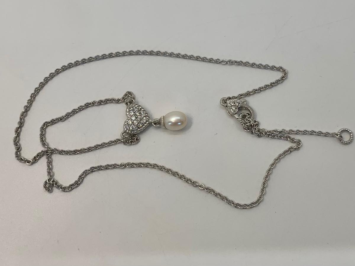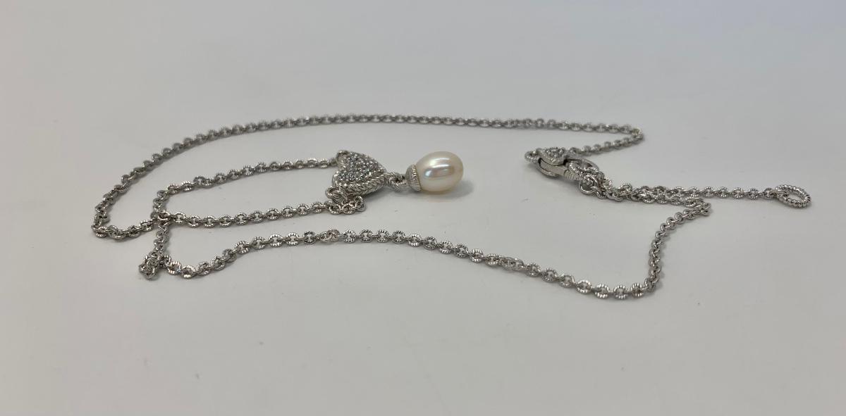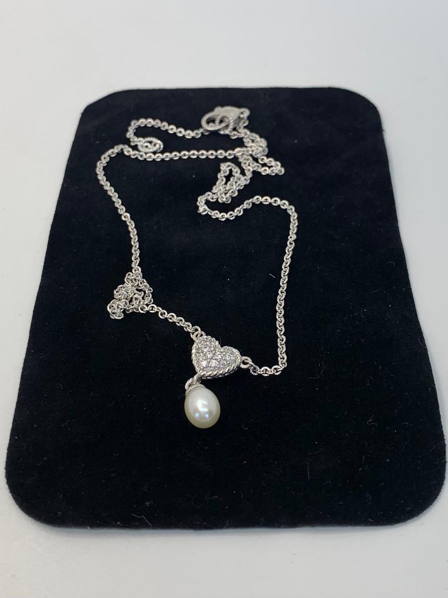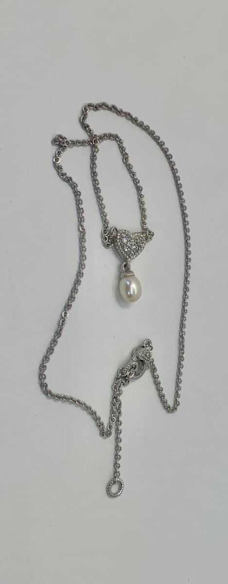 156:  925 Judith Ripka Sterling Silver 925 pavé CZ Heart And Pearl Drop Necklace