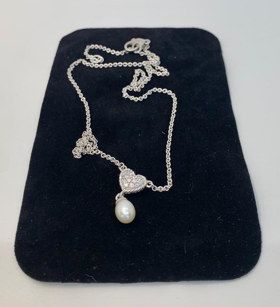 156: 925 Judith Ripka Sterling Silver 925 pavé CZ Heart And Pearl Drop Necklace