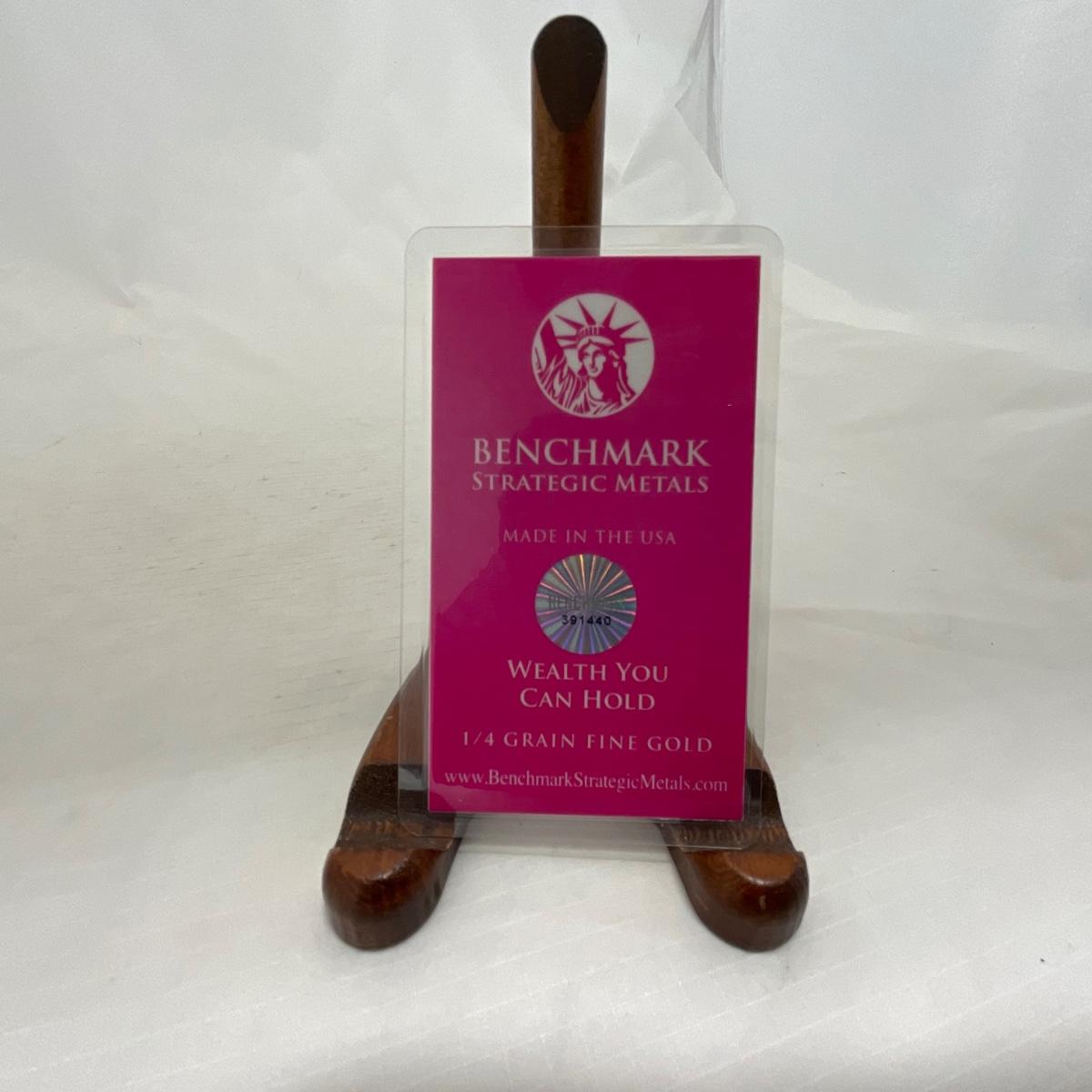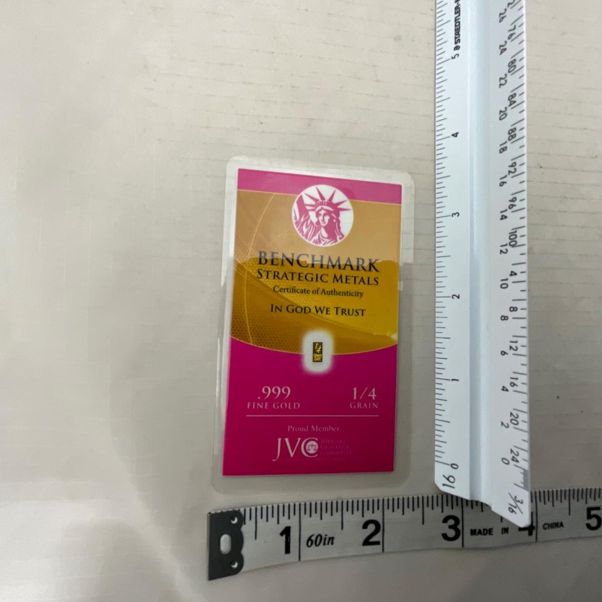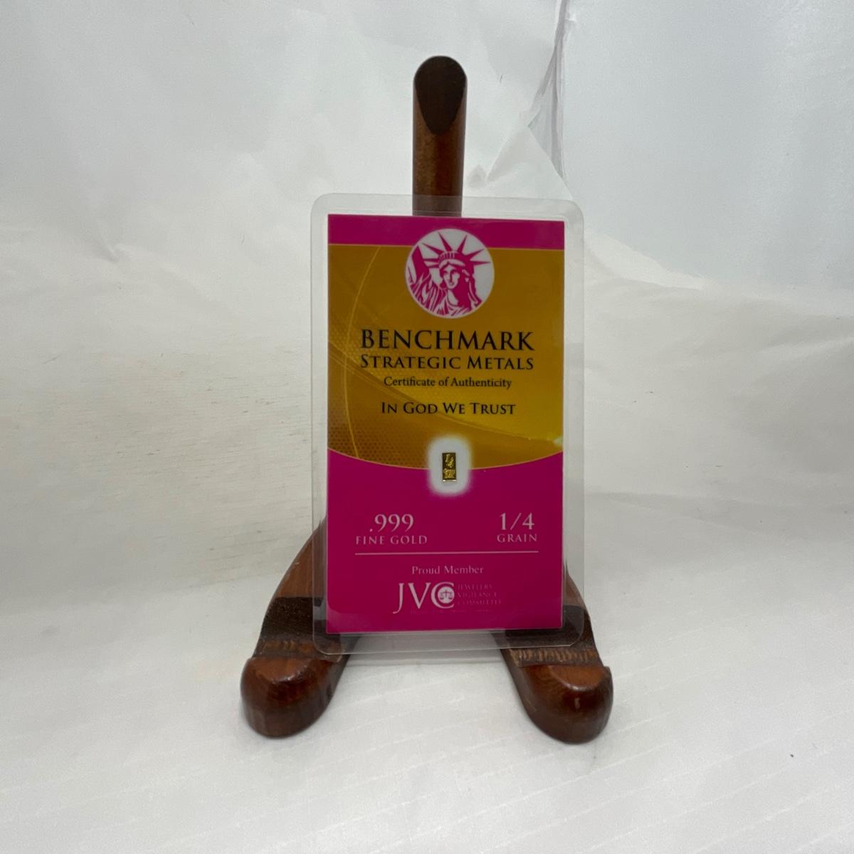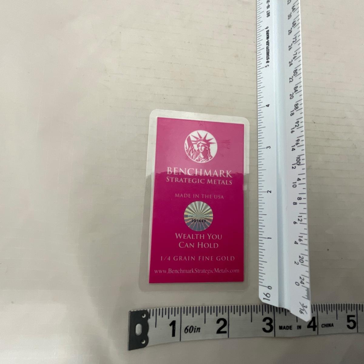 One Fraction 1/4 Grain .999 Fine Gold piece with mark of authenticity. Benchmark Strategic Metals. Please see photos for details and condition. ::: Shipping is available on this lot. If you require shipping you must let us know at the close of the auction. We will coordinate with you after the item has been won. Shipping fees will include insurance up to or exceeding the value of all items being mailed. If you have any questions regarding this lot please contact the auctioneer either via this website, by direct email or by phone. PICK UP TIMES and other important information can be found in the TERMS and DESCRIPTION of the auction. Please take a look for pertinent information. Thanks!