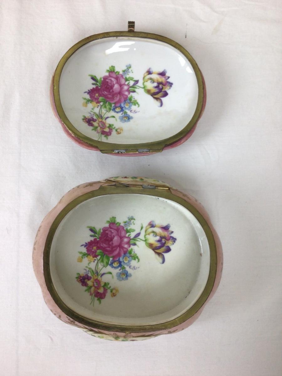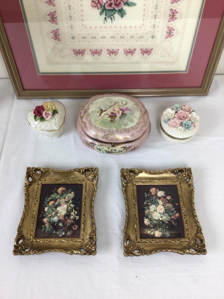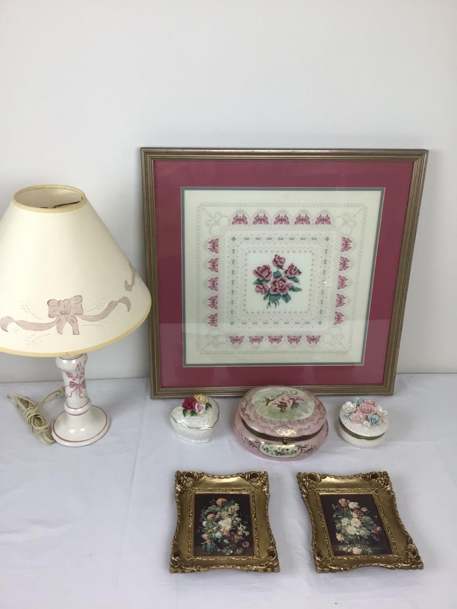 Lot contains framed needlework (20” x 20”) trinket boxes and lamp with bows.