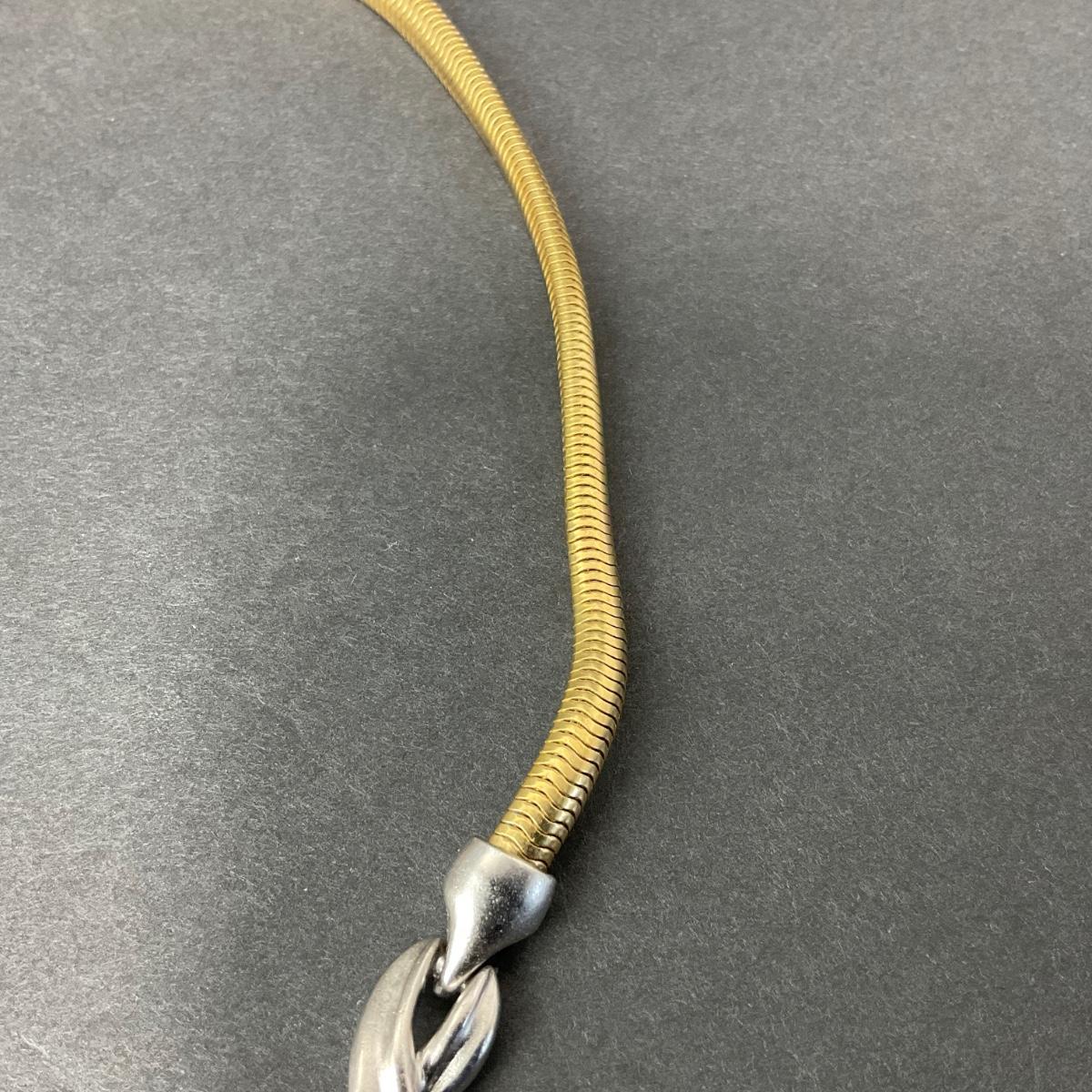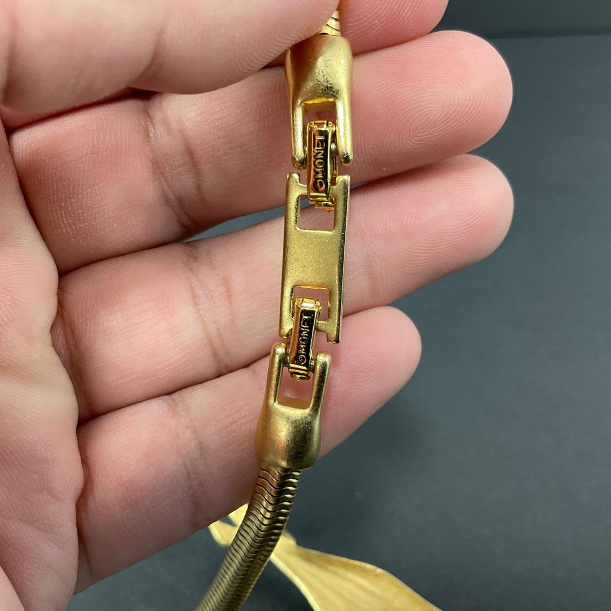 One two tone marked Monet statement necklace. Please see photos for details and condition. Any condition statement is given as a courtesy to a client, is an opinion, and should not be treated as a statement of fact. Reference to condition written, oral or within a condition report shall not be regarded as a full account of condition and may not include all defects, alterations, or restorations. Absence of a condition report does not imply a lot is flawless or lacking imperfections or damage. Katherine’s Auction & Appraisal Service shall have no responsibility for any error or omission. Returns shall not be accepted on the basis of condition. ::: Shipping is available on this lot. If you require shipping you must let us know at the close of the auction. We will coordinate with you after the item has been won. Shipping fees will include insurance up to or exceeding the value of all items being mailed. If you have any questions regarding this lot please contact the auctioneer either via this website, by direct email or by phone. PICK UP TIMES and other important information can be found in the TERMS and DESCRIPTION of the auction. Please take a look for pertinent information. Thanks!