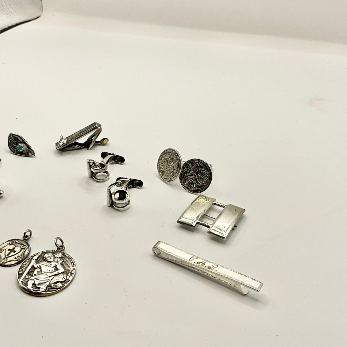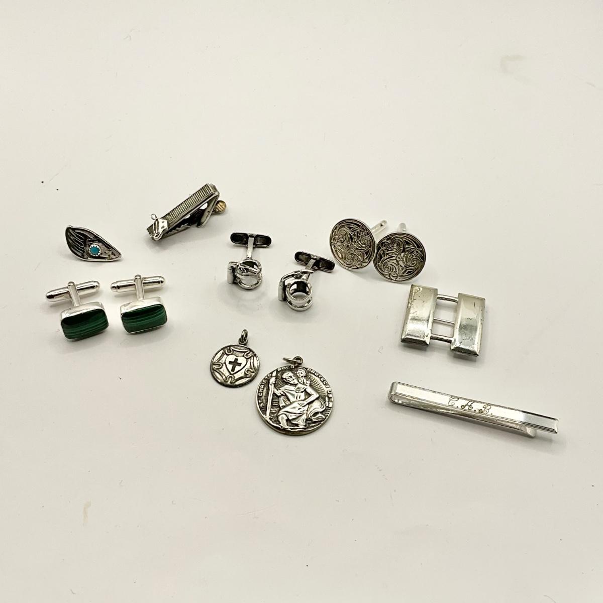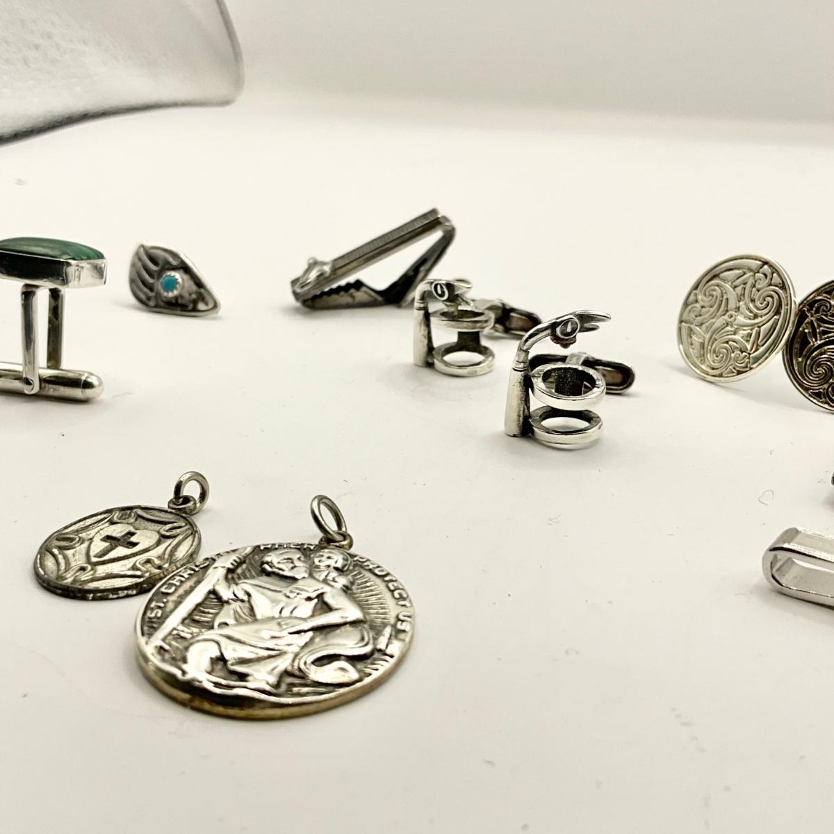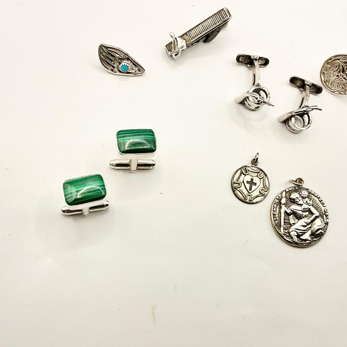 Sterling silver tie pins, bars, cufflinks, and St. Christopher Medal
