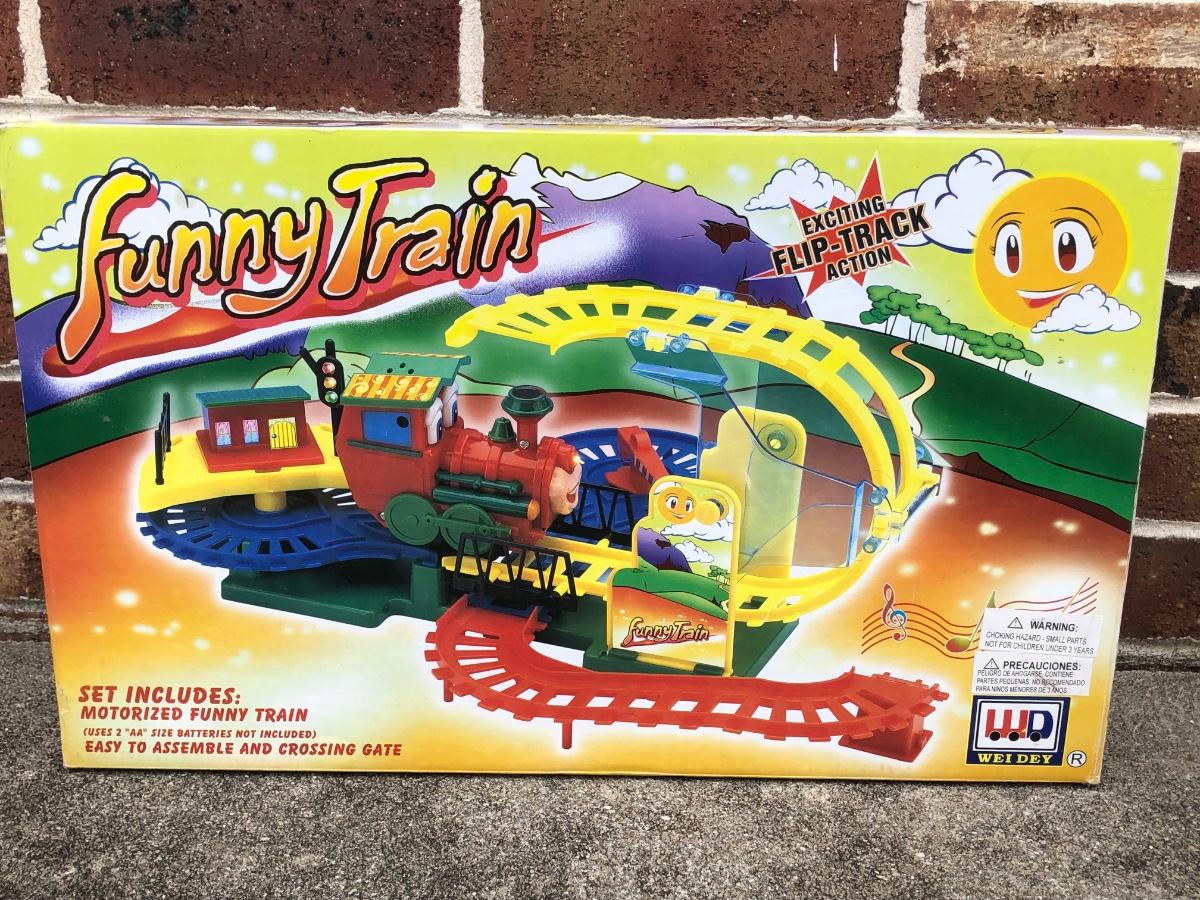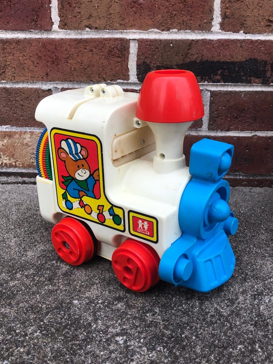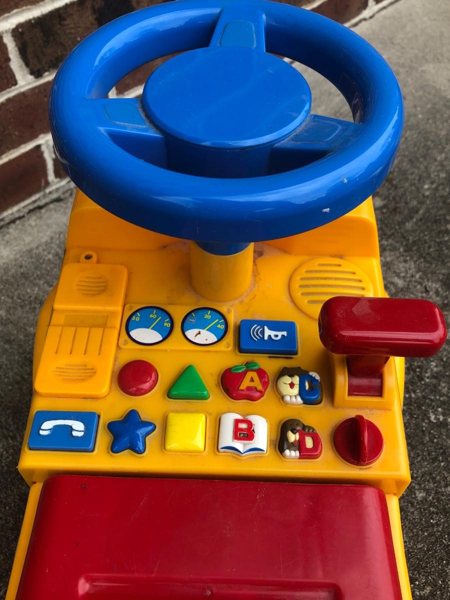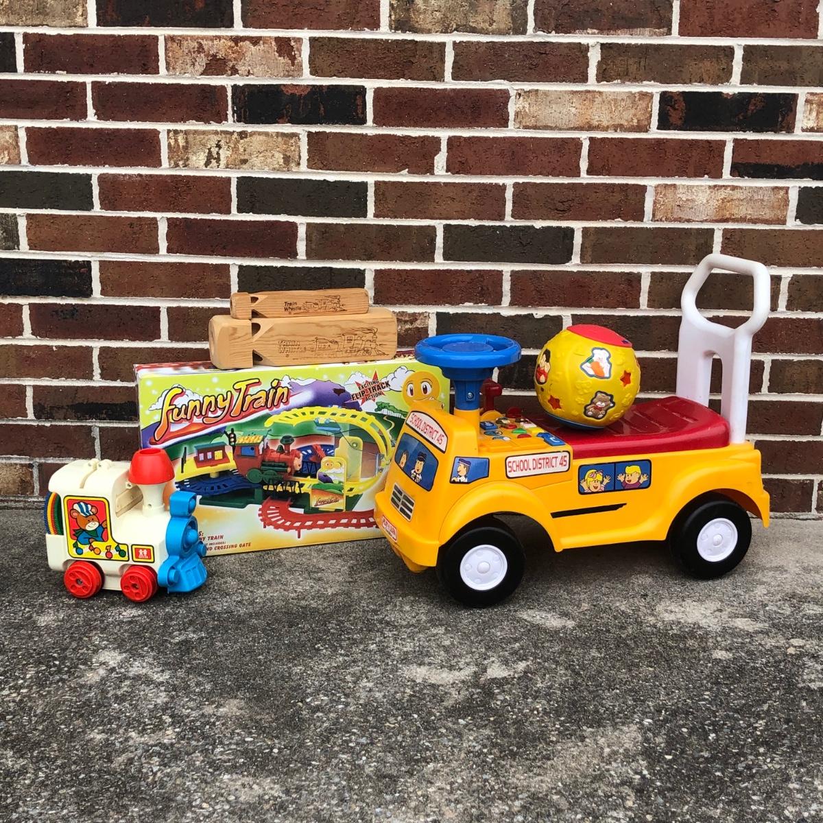 School bus has batteries and works, baby ball and train need new batteries. Funny Train appears to have all its pieces. Includes two wooden train whistles.