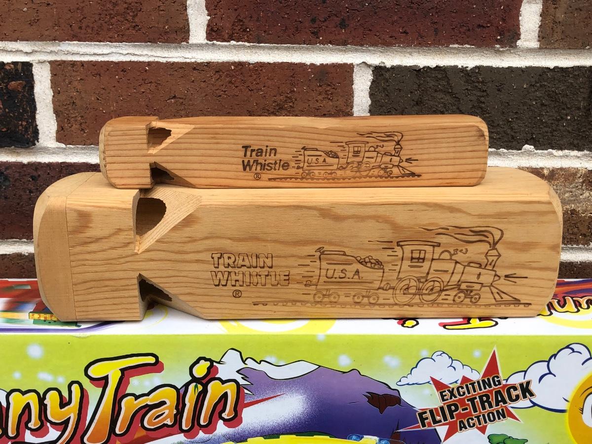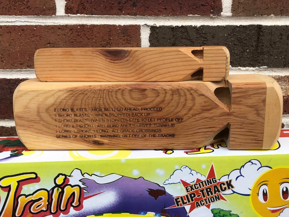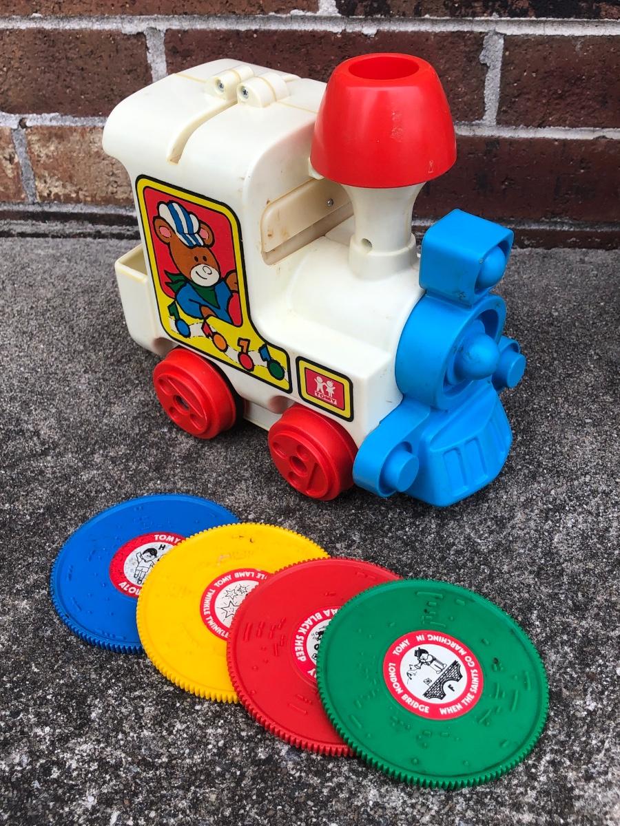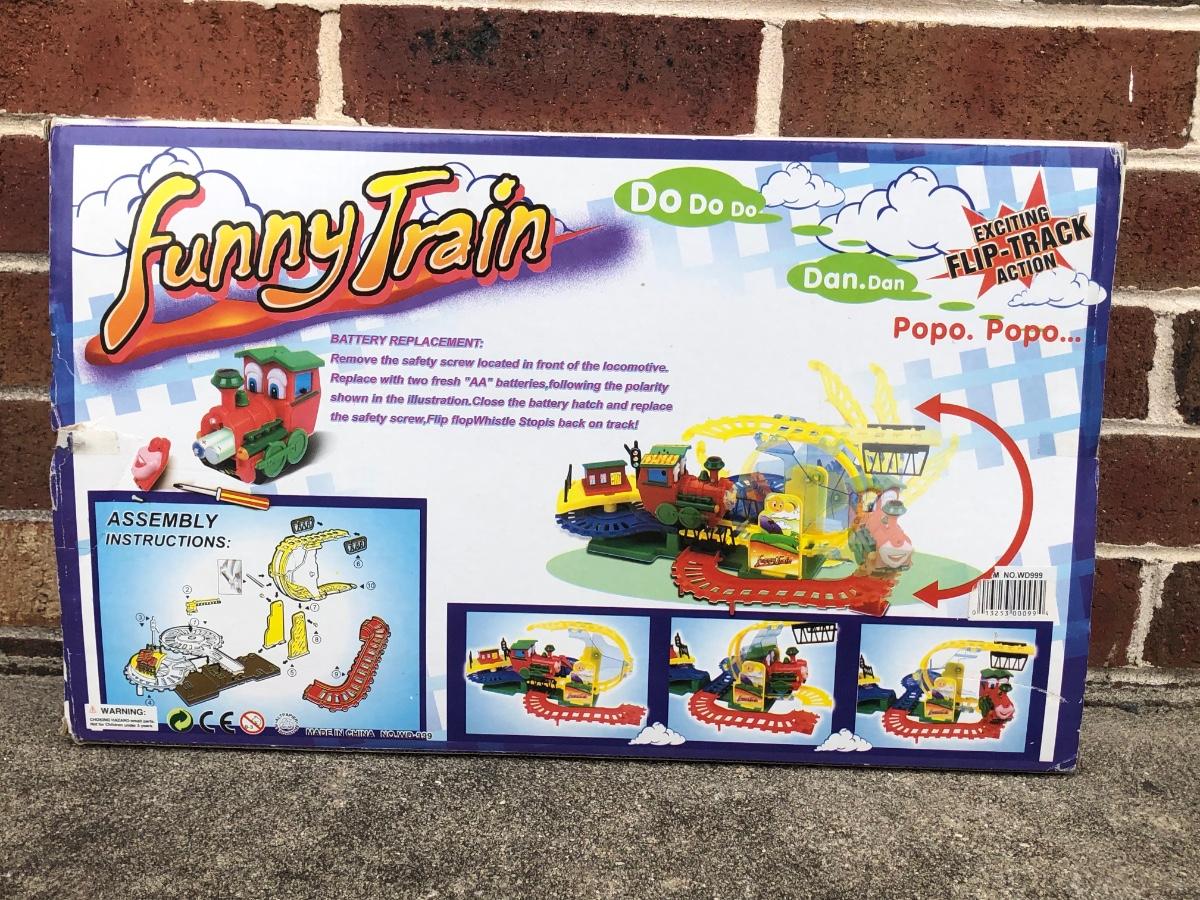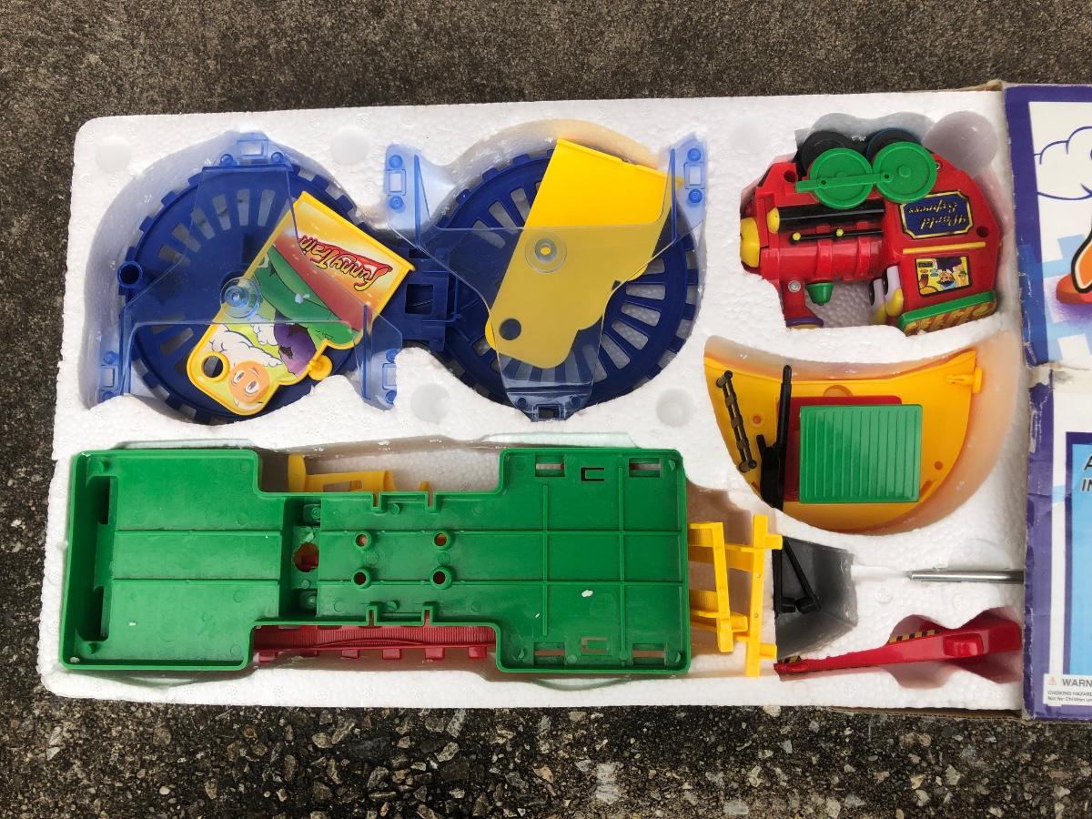 School bus has batteries and works, baby ball and train need new batteries. Funny Train appears to have all its pieces. Includes two wooden train whistles.
