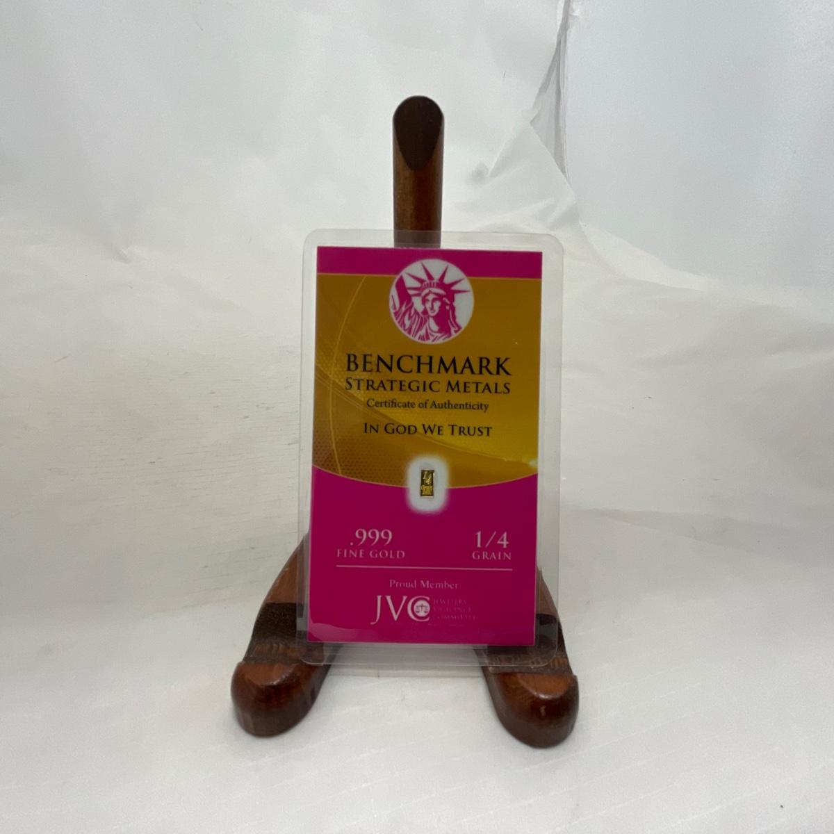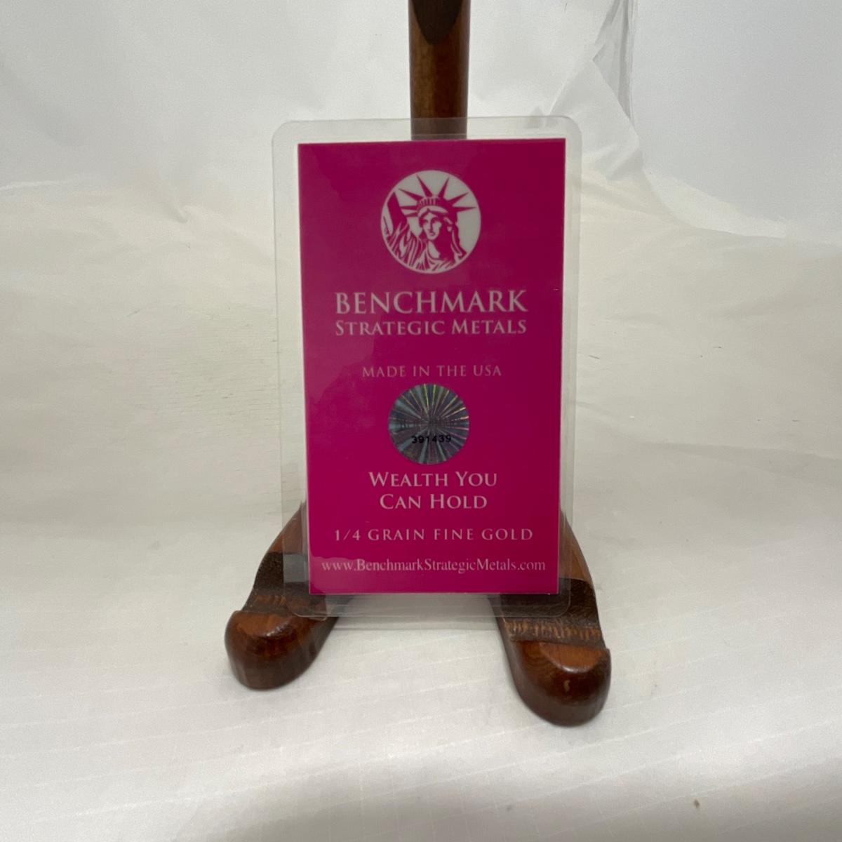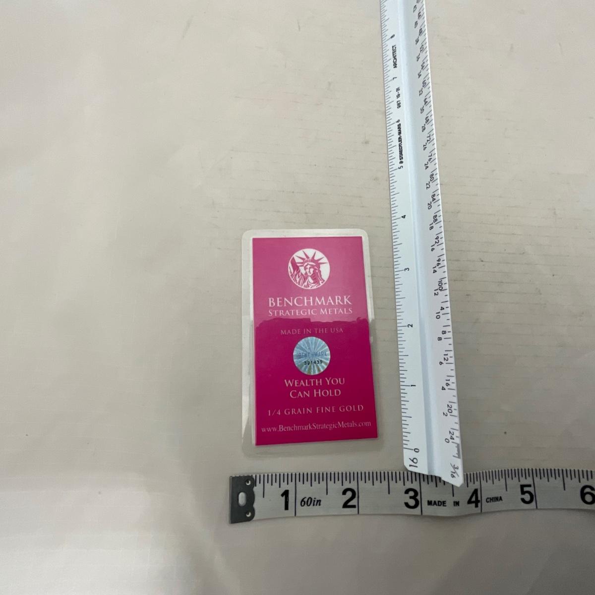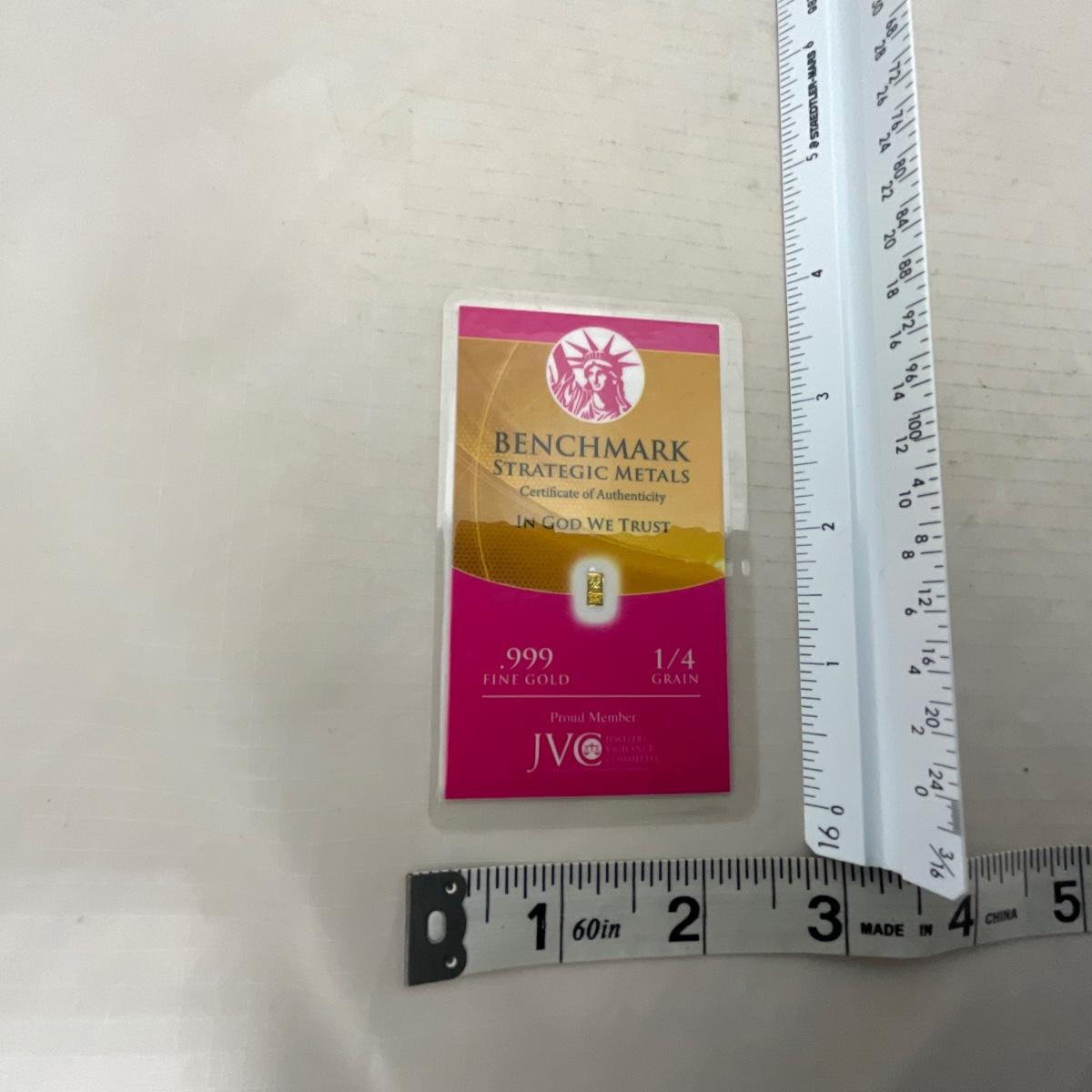 One Fraction 1/4 Grain .999 Fine Gold piece with mark of authenticity. Benchmark Strategic Metals. Please see photos for details and condition. ::: Shipping is available on this lot. If you require shipping you must let us know at the close of the auction. We will coordinate with you after the item has been won. Shipping fees will include insurance up to or exceeding the value of all items being mailed. If you have any questions regarding this lot please contact the auctioneer either via this website, by direct email or by phone. PICK UP TIMES and other important information can be found in the TERMS and DESCRIPTION of the auction. Please take a look for pertinent information. Thanks!