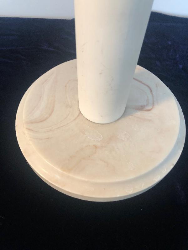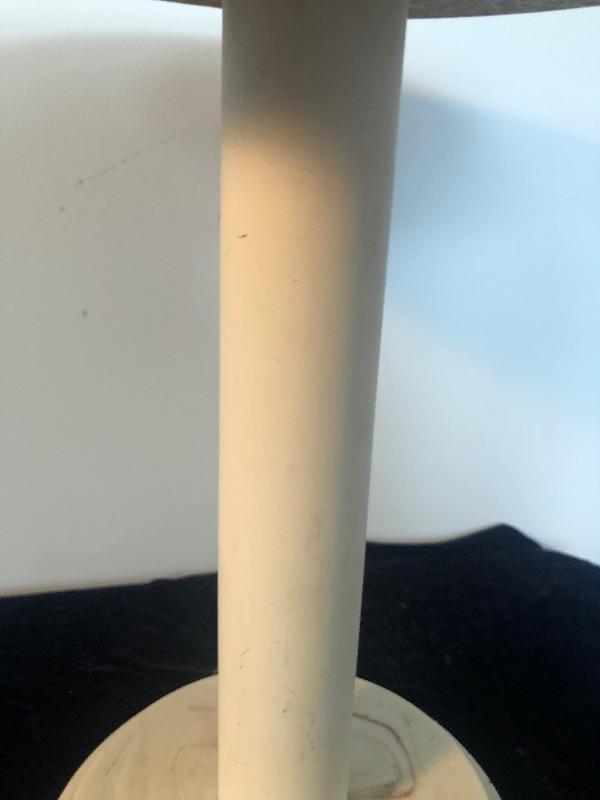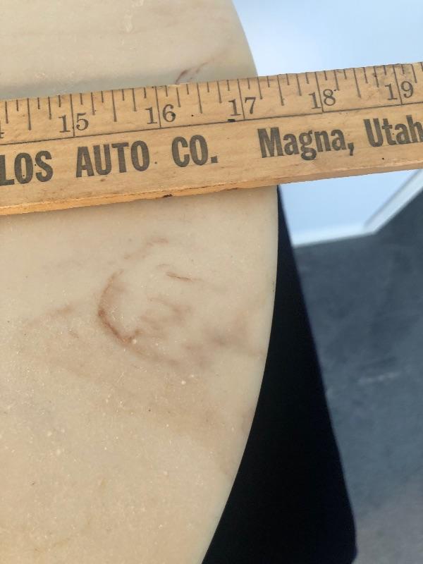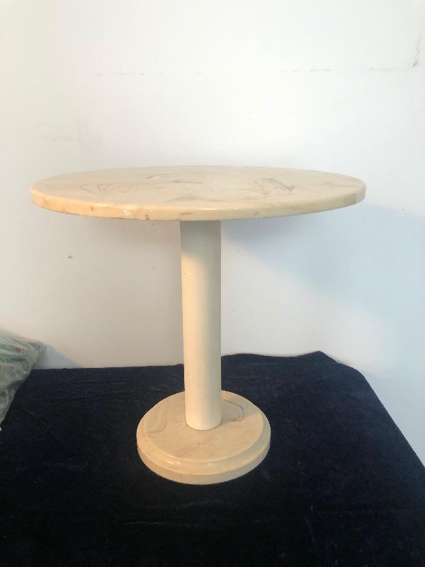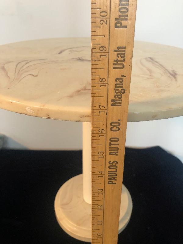 Base and top appear to be made out of marble, support is PVC Table is 17" high and just over 17" in diameter. This is an ONSITE Auction all items will need to be picked up on location. Please see auction description for pick up procedures. Shipping is available on smaller items.