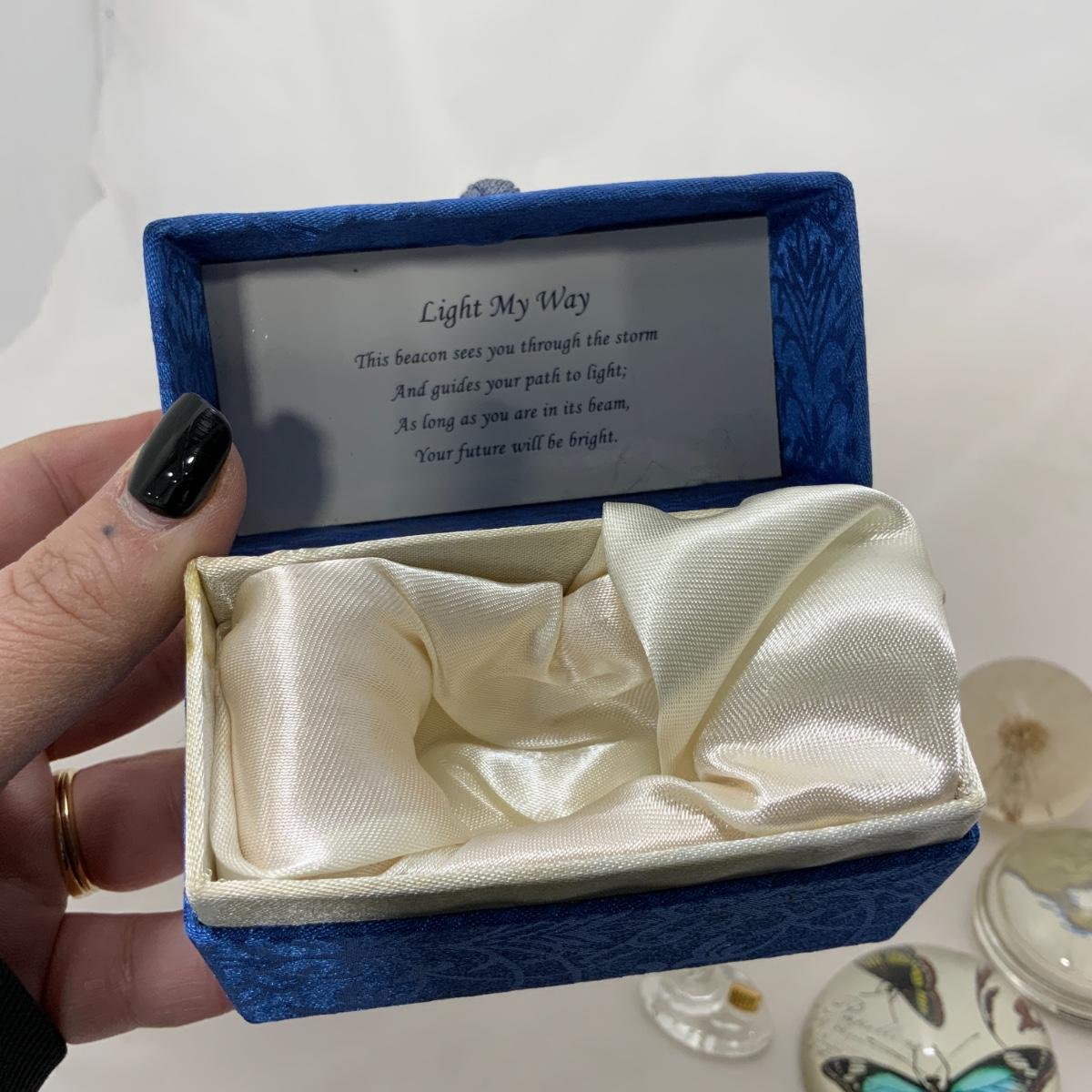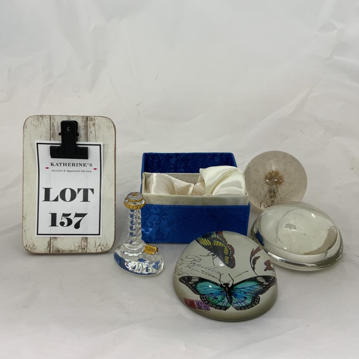 From the Estate of Peter and Alice Radovanovich: Three nice paperweights, one with butterflies, one that will magnify things, and a dandelion encased in acrylic. The Light House figurine has a pleasant notion on the interior of the box as well. Please see photos for details and condition. ::: Shipping is available on this lot. If you require shipping you must let us know at the close of the auction. We will coordinate with you after the item has been won. Shipping fees will include insurance up to or exceeding the value of all items being mailed. If you have any questions regarding this lot please contact the auctioneer either via this website, by direct email or by phone. PICK UP TIMES and other important information can be found in the TERMS and DESCRIPTION of the auction. Please take a look for pertinent information. Thanks!