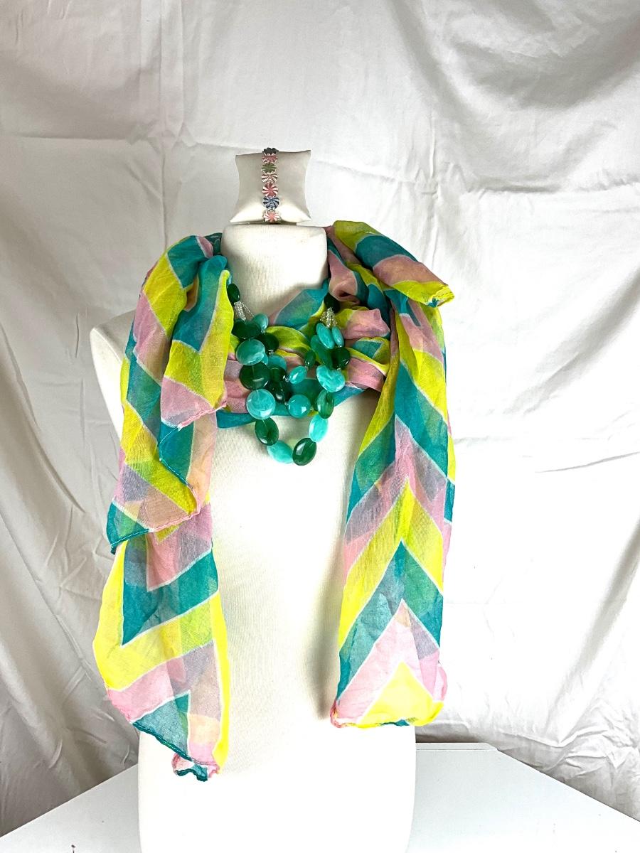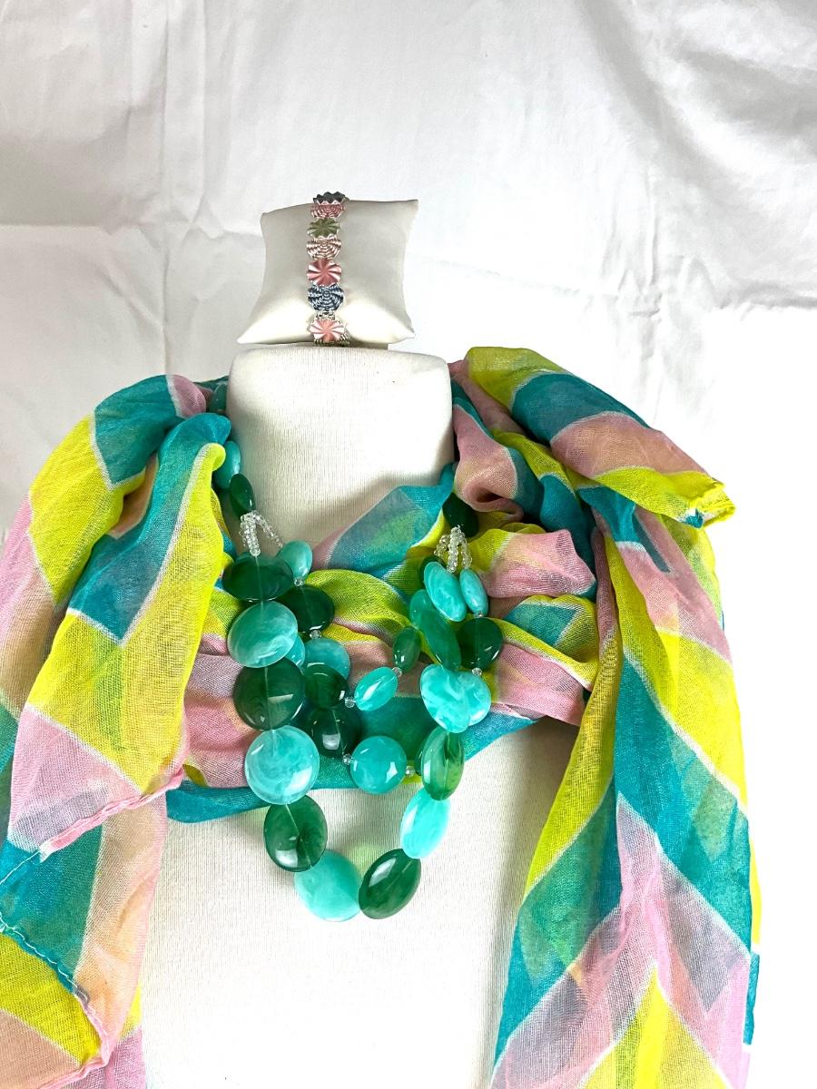 157 Pink, Green, Yellow Scarf with Green Statement Necklace and Flower Stretch Bracelet