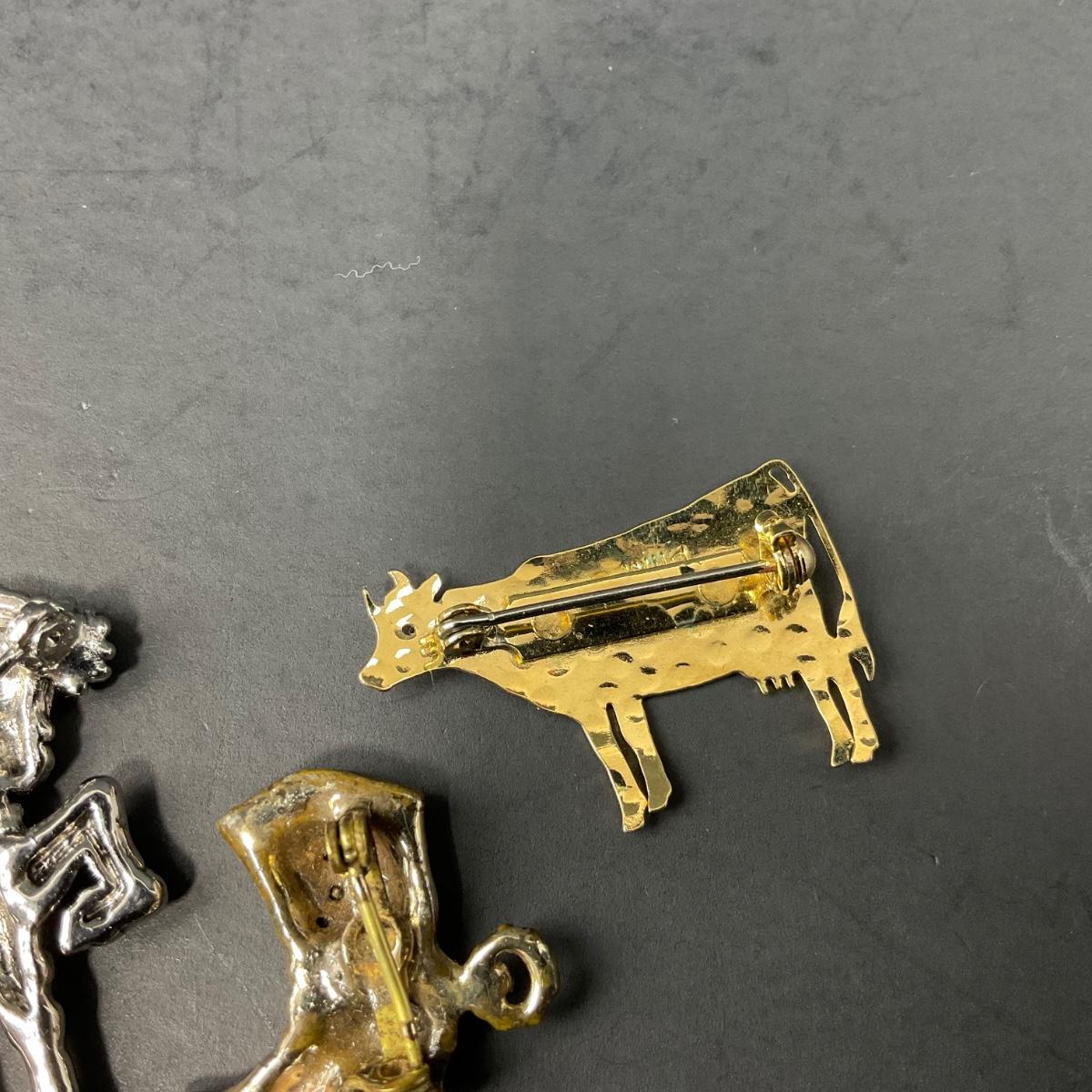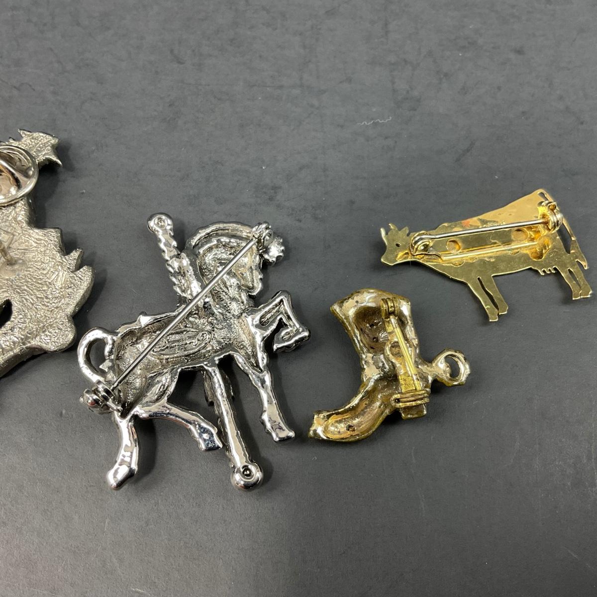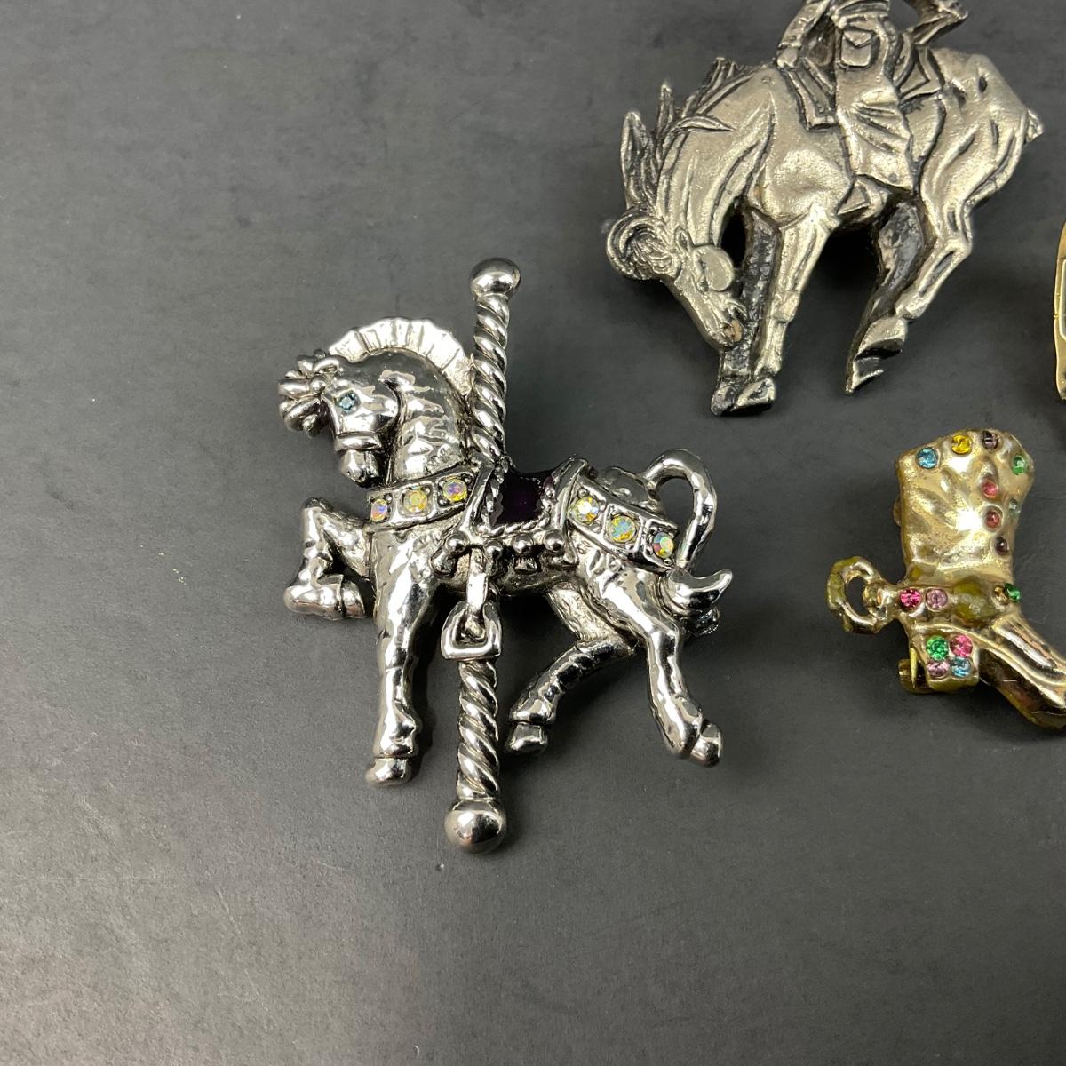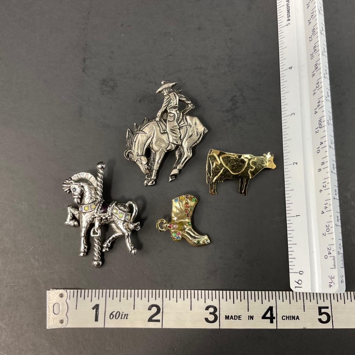 Four vintage assorted pins including one carrousel horse, one cowboy on horseback, one cowboy boot, and one cow. Please see photos for details and condition. Any condition statement is given as a courtesy to a client, is an opinion, and should not be treated as a statement of fact. Reference to condition written, oral or within a condition report shall not be regarded as a full account of condition and may not include all defects, alterations, or restorations. Absence of a condition report does not imply a lot is flawless or lacking imperfections or damage. Katherine’s Auction & Appraisal Service shall have no responsibility for any error or omission. Returns shall not be accepted on the basis of condition. ::: Shipping is available on this lot. If you require shipping you must let us know at the close of the auction. We will coordinate with you after the item has been won. Shipping fees will include insurance up to or exceeding the value of all items being mailed. If you have any questions regarding this lot please contact the auctioneer either via this website, by direct email or by phone. PICK UP TIMES and other important information can be found in the TERMS and DESCRIPTION of the auction. Please take a look for pertinent information. Thanks!