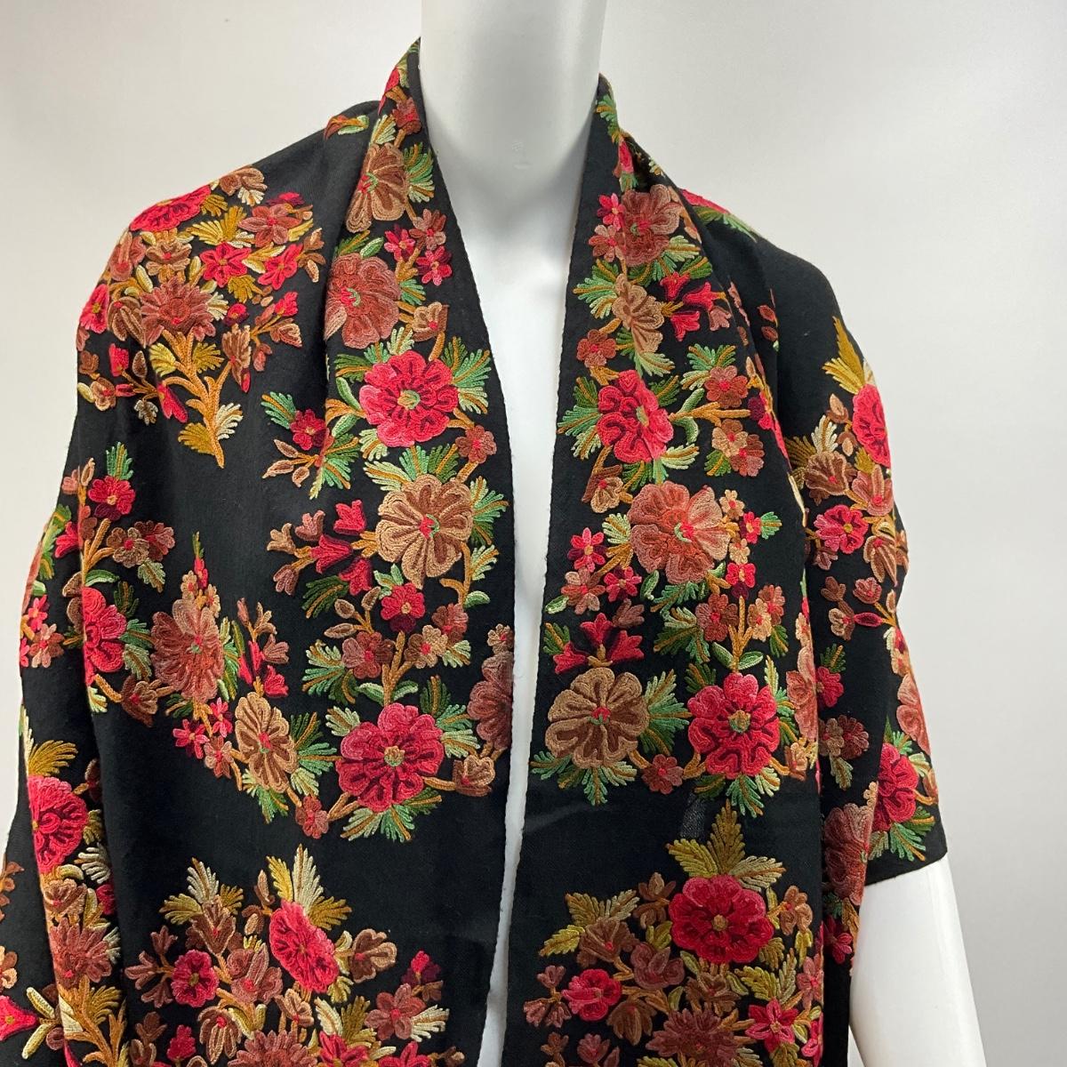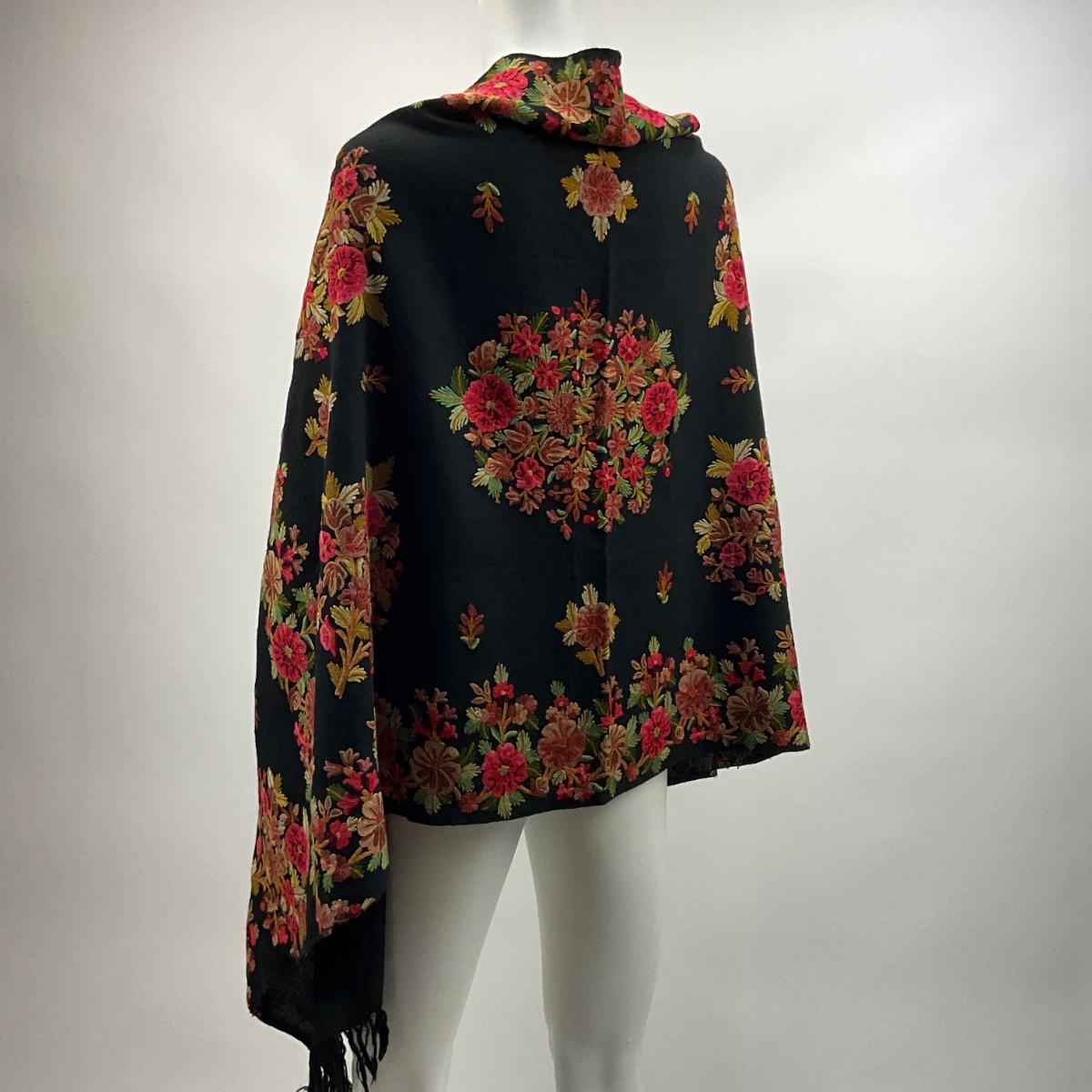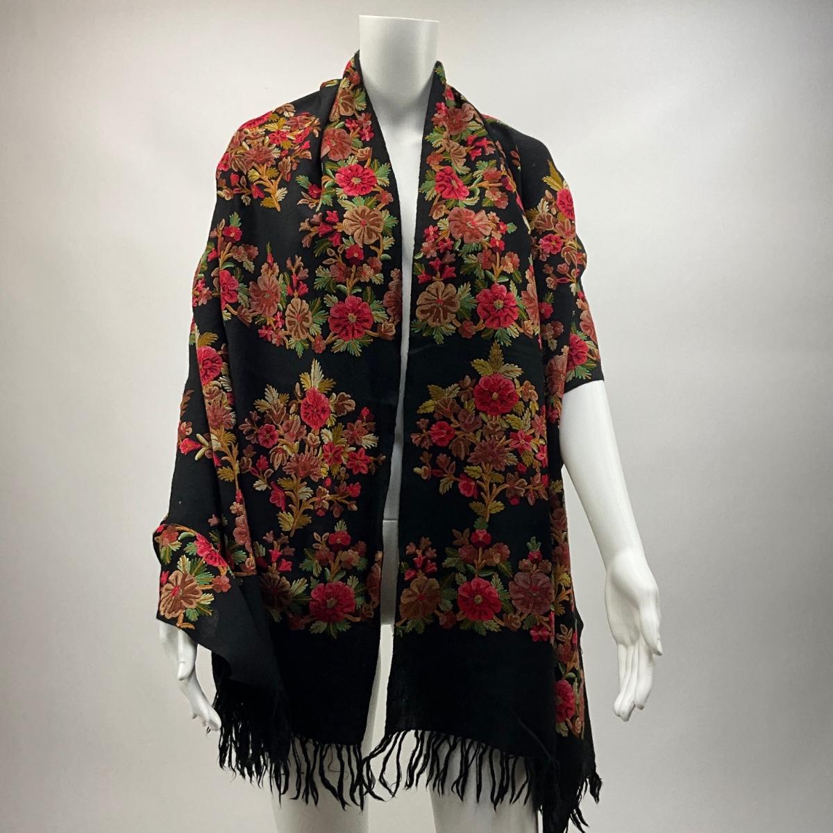 The shawl is black with bright red flowers, one size, measures 70" x 28.5".