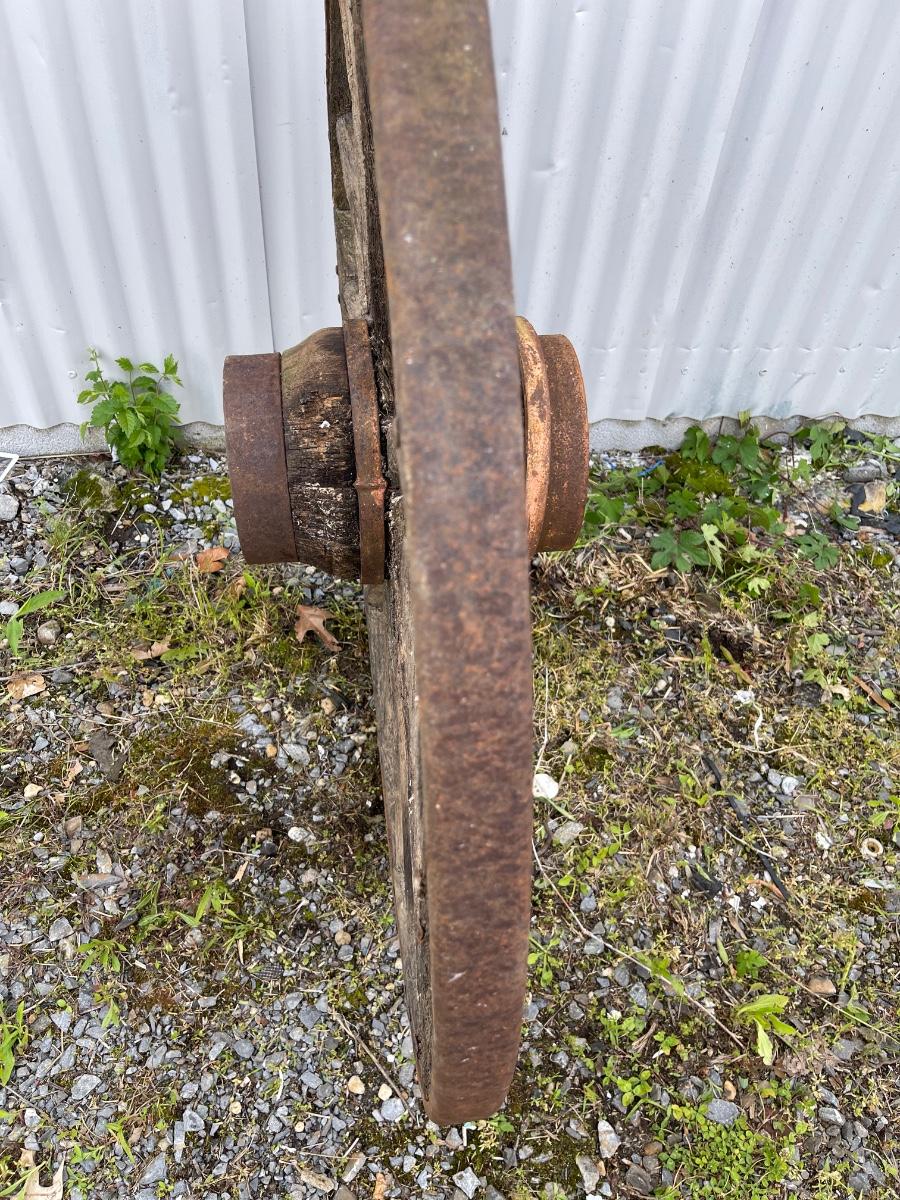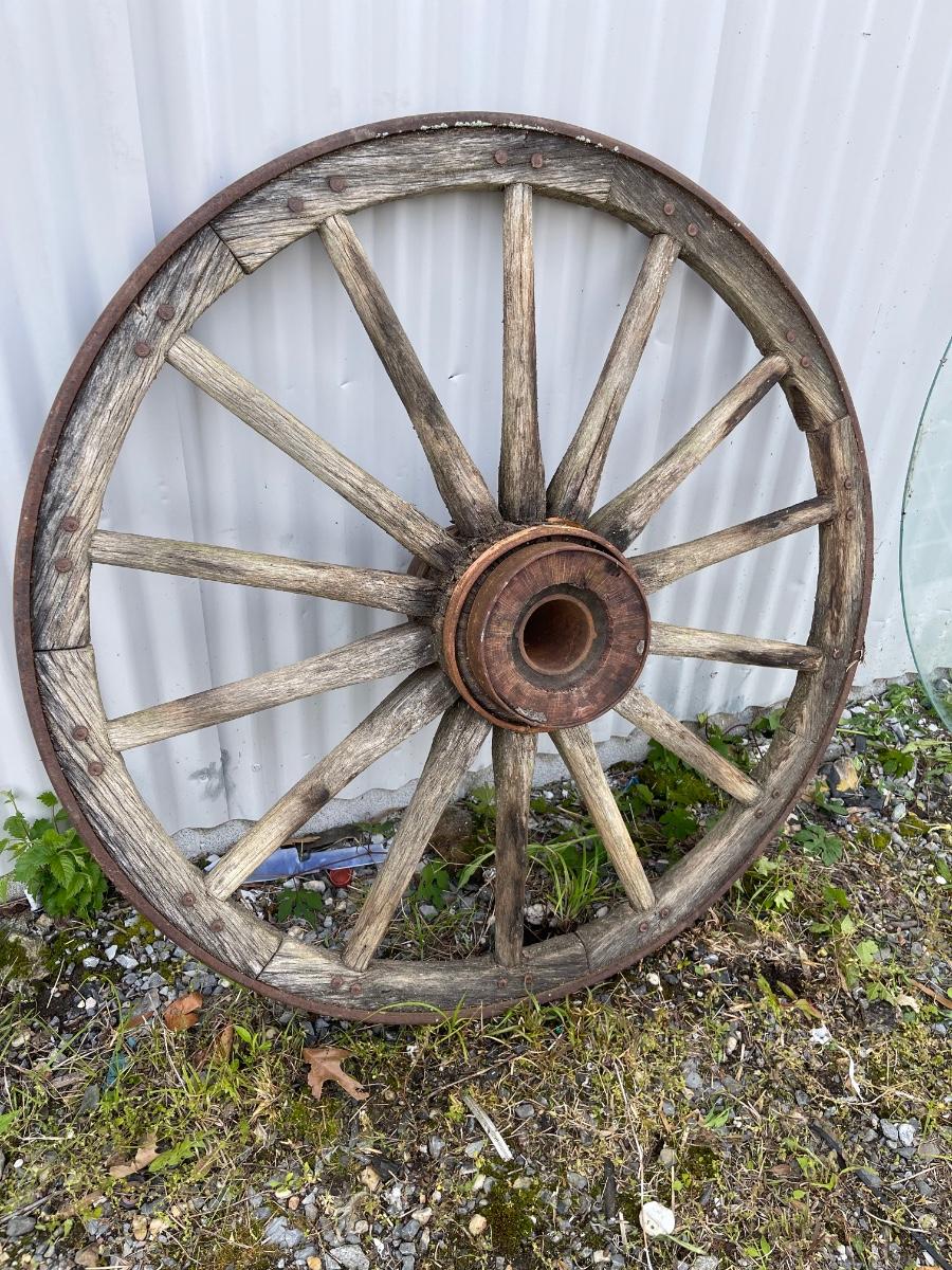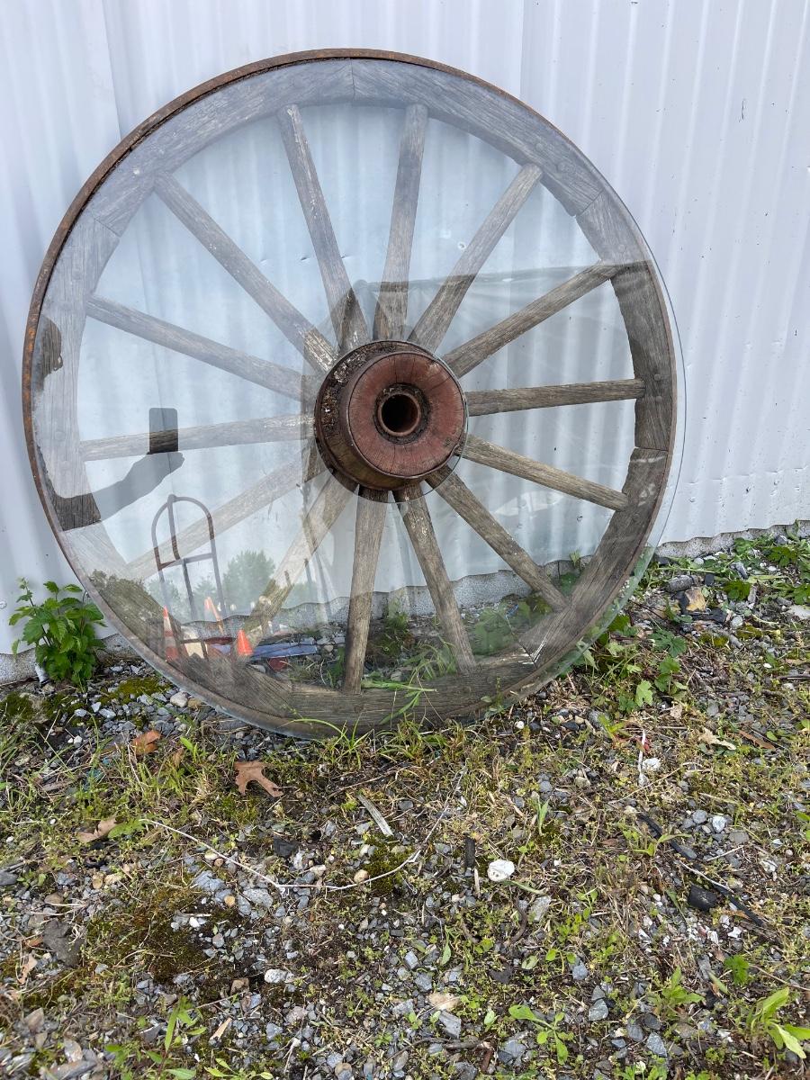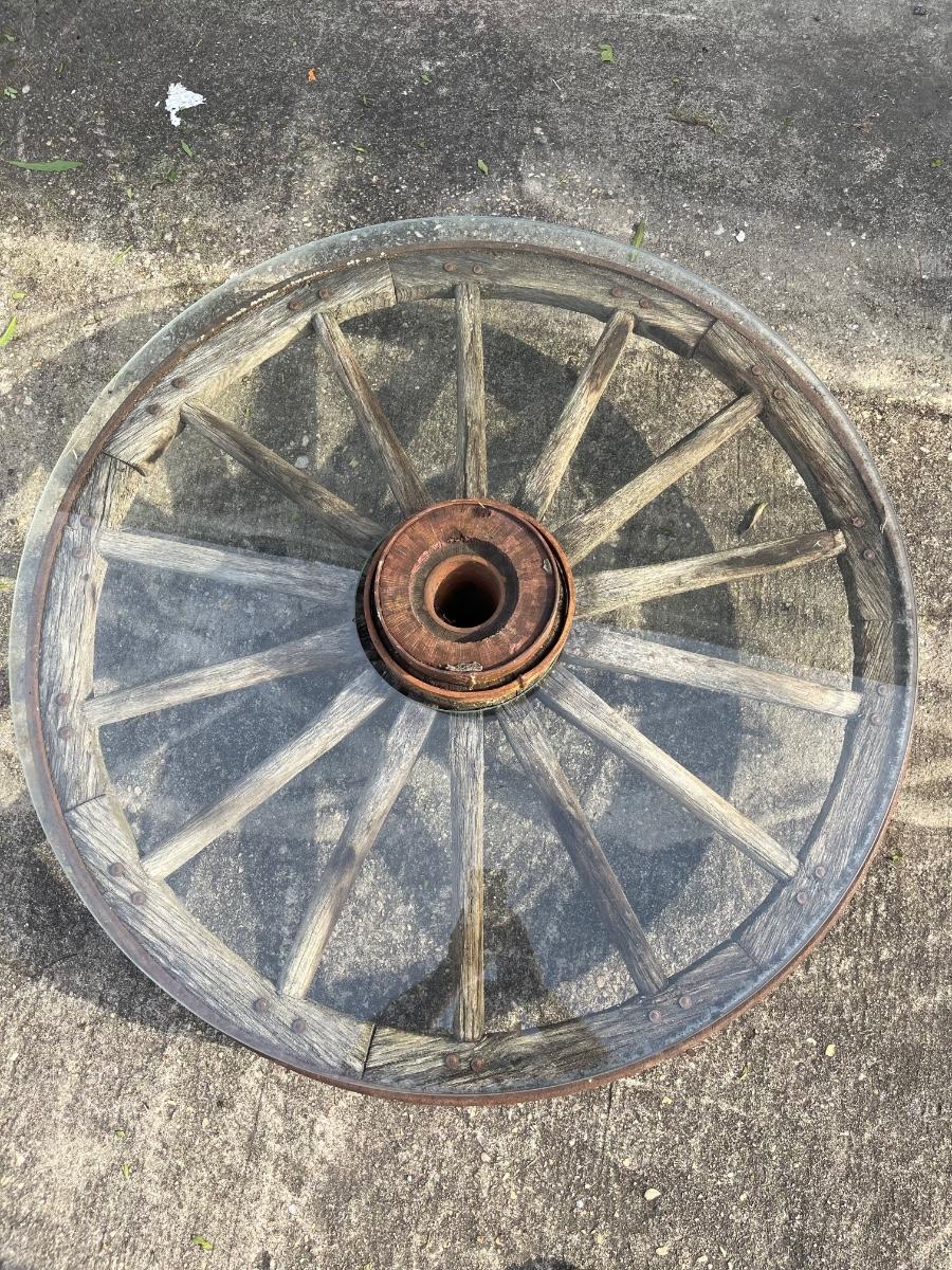 Antique Wagon Wheel Wooden Glass-top Table. 3’-6” Diameter. Wooden and steel center hub with steel banding around wheels perimeter edge. NOTE: Does not include base or umbrella. A great project piece or yard decor. Glass is removable.