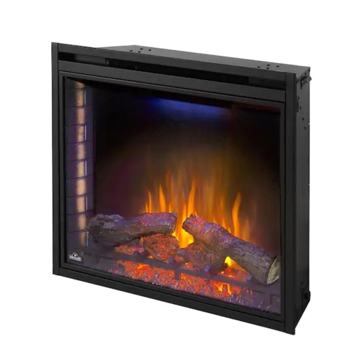 Firebox is used and ready to install, it is 33", ultra bright LED Lights, whisper quiet fan and heater, self-trimming flange. Realistic glowing logs and ember bed. It is 28.75" tall x 34" wide and 9.75" deep.