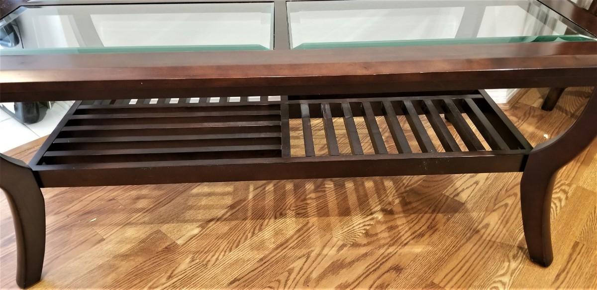 Nice contemporary coffee table - good used condition. Matches the sofa table in Lot #151. 29.75" across, 50" long, 19" tall.