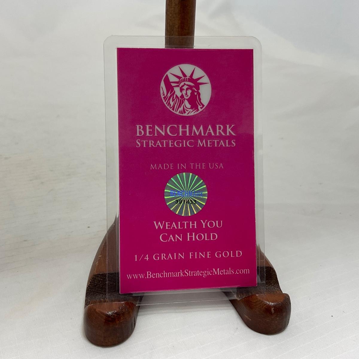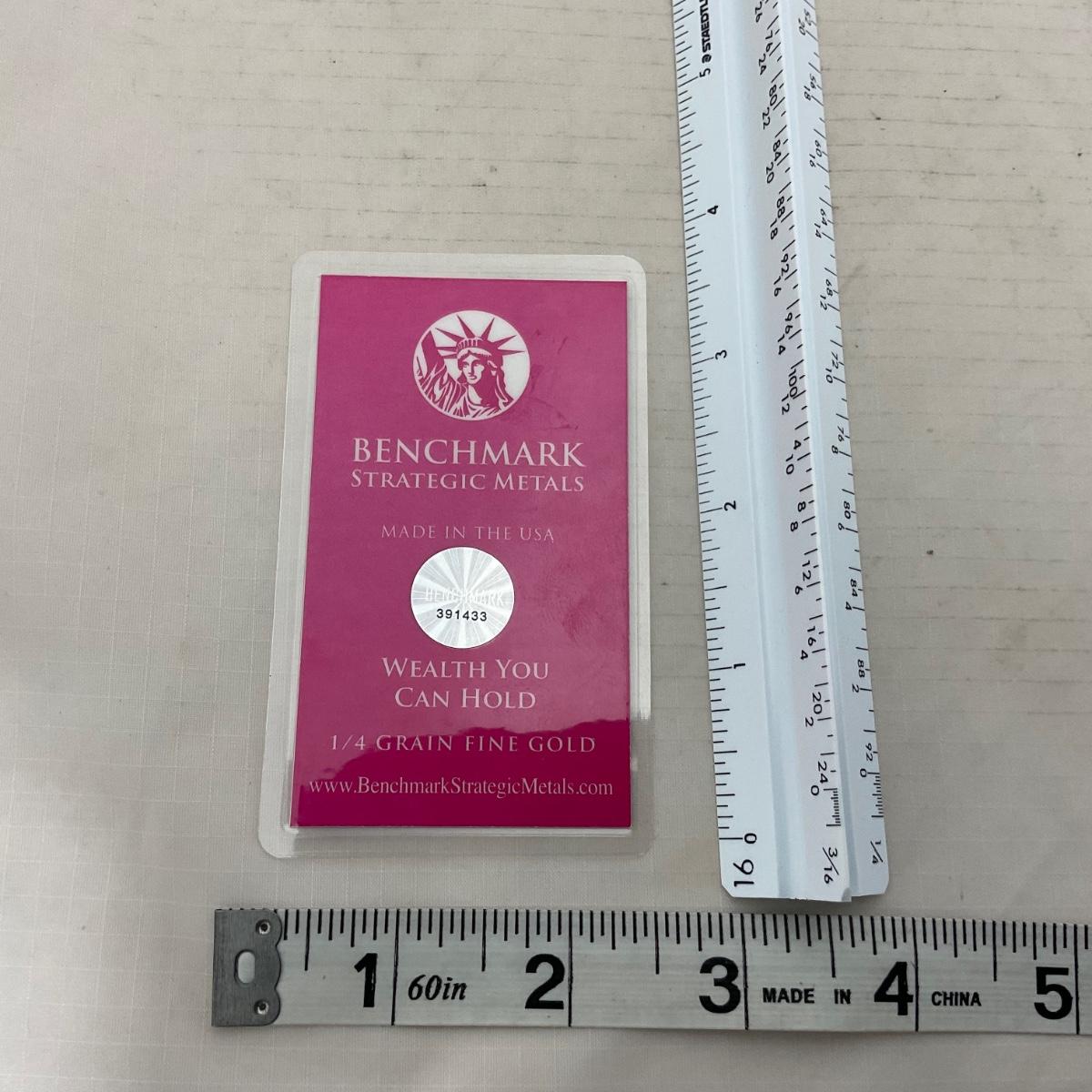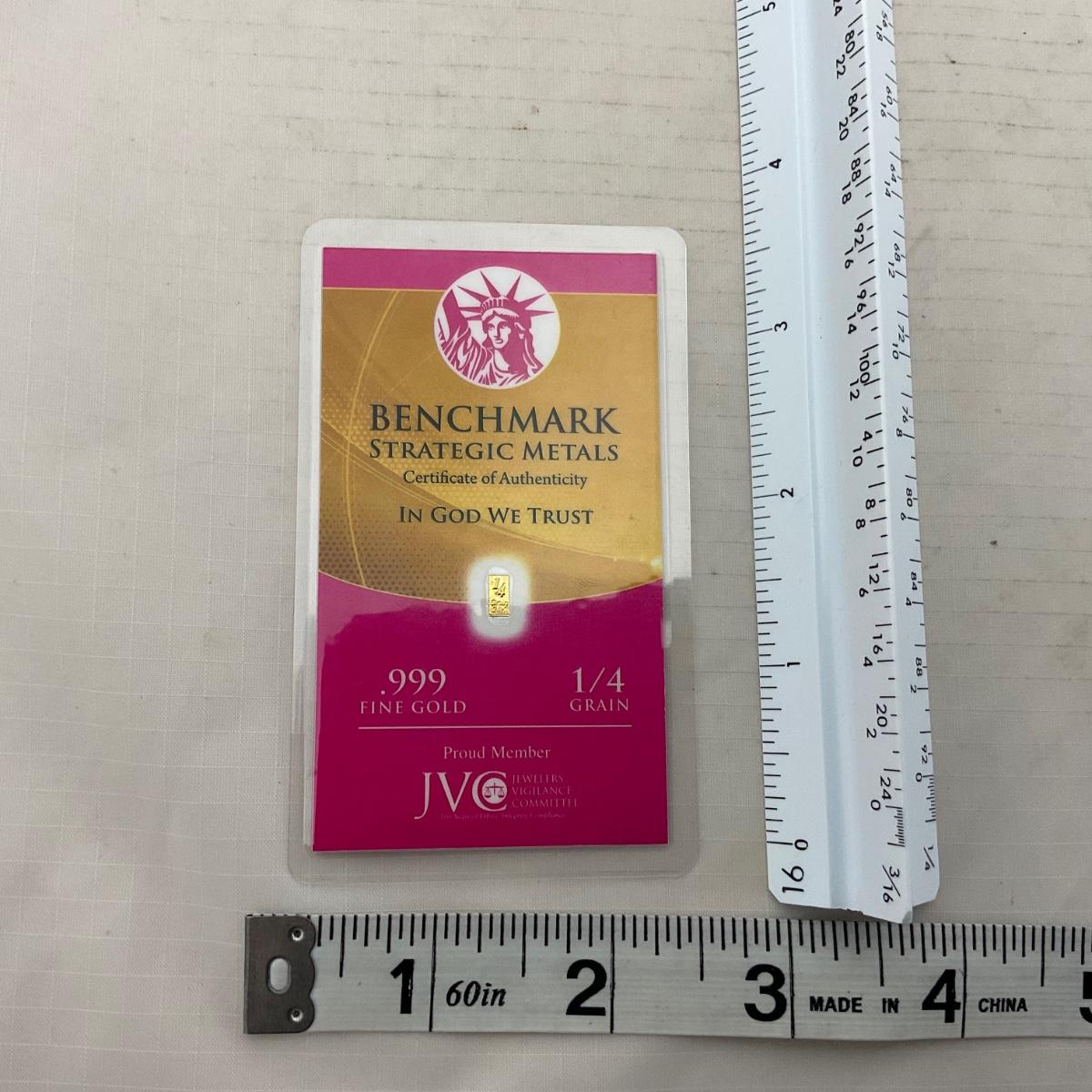 One Fraction 1/4 Grain .999 Fine Gold with mark of authenticity. Benchmark Strategic Metals. Please see photos for details and condition. ::: Shipping is available on this lot. If you require shipping you must let us know at the close of the auction. We will coordinate with you after the item has been won. Shipping fees will include insurance up to or exceeding the value of all items being mailed. If you have any questions regarding this lot please contact the auctioneer either via this website, by direct email or by phone. PICK UP TIMES and other important information can be found in the TERMS and DESCRIPTION of the auction. Please take a look for pertinent information. Thanks!