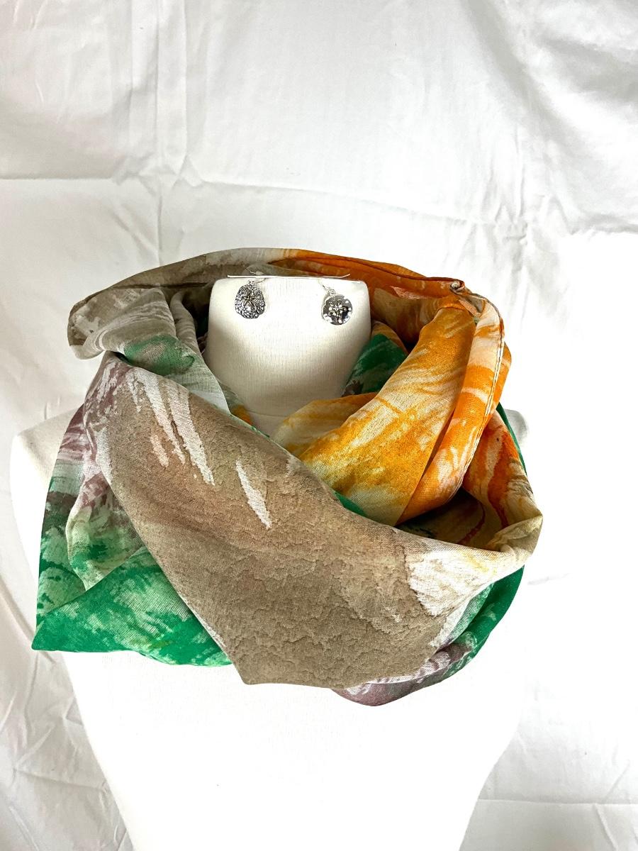 Hand bag has fading from being in store window , with orange, yellow, brown, green infinity scarf and silver tone sand dollar charm necklace with matching earrings