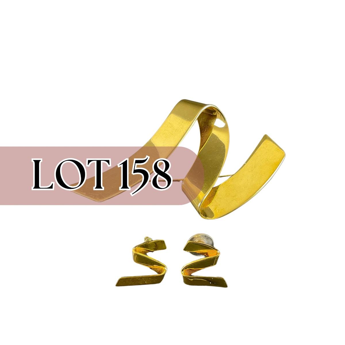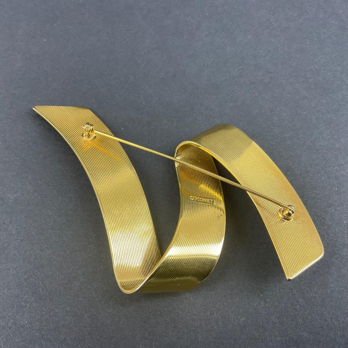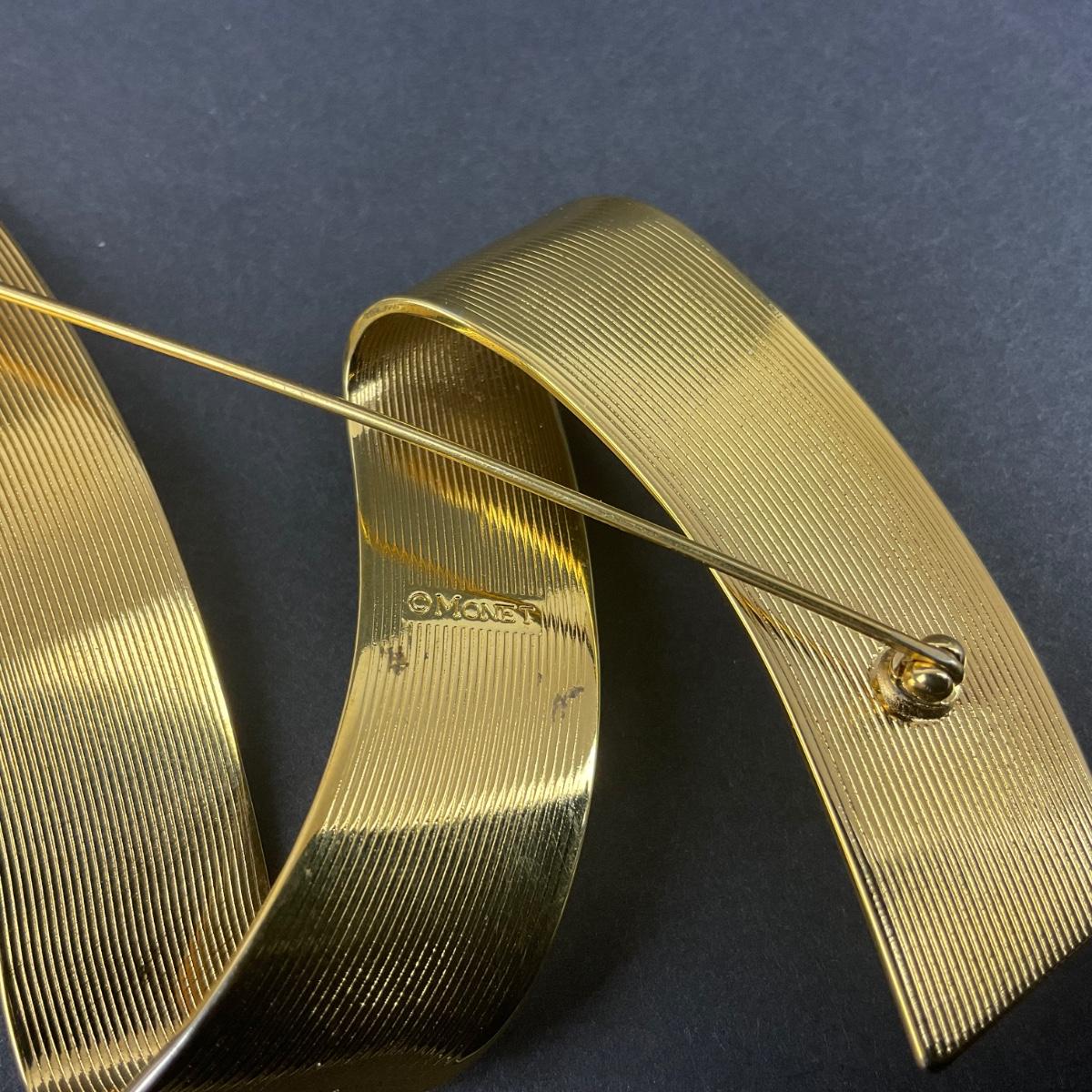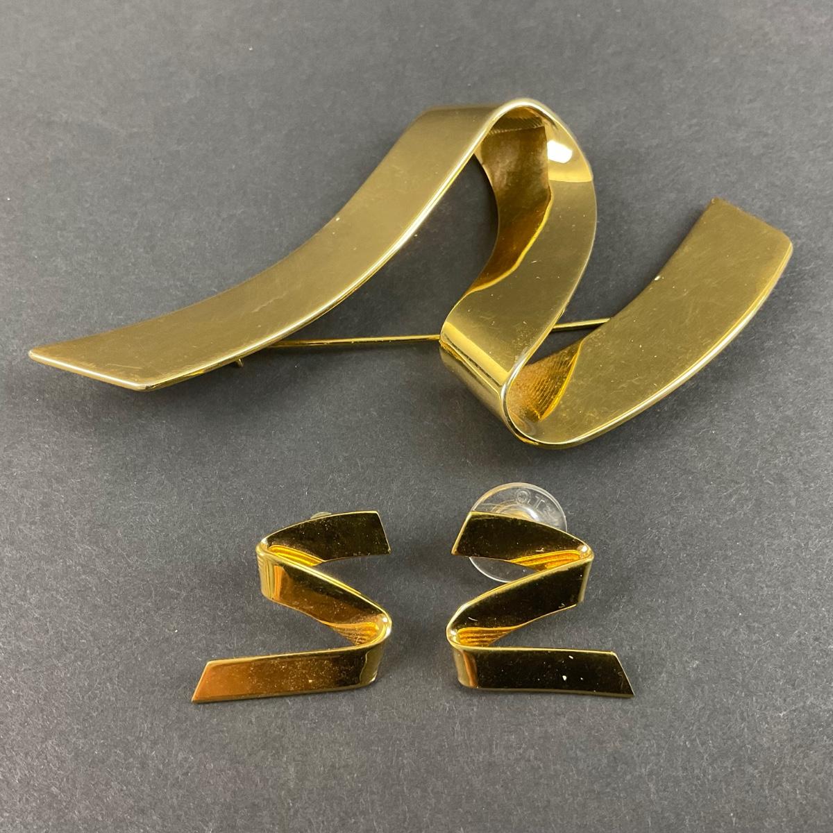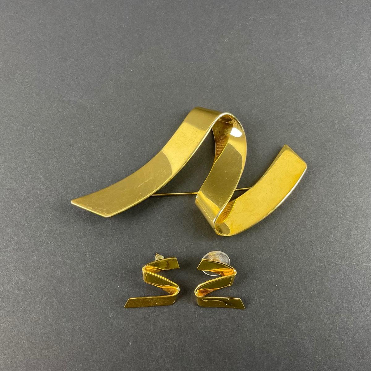 -158- MONET | Gold Tone 1970’s Modernist Ribbon Brooch & Earrings | Marked