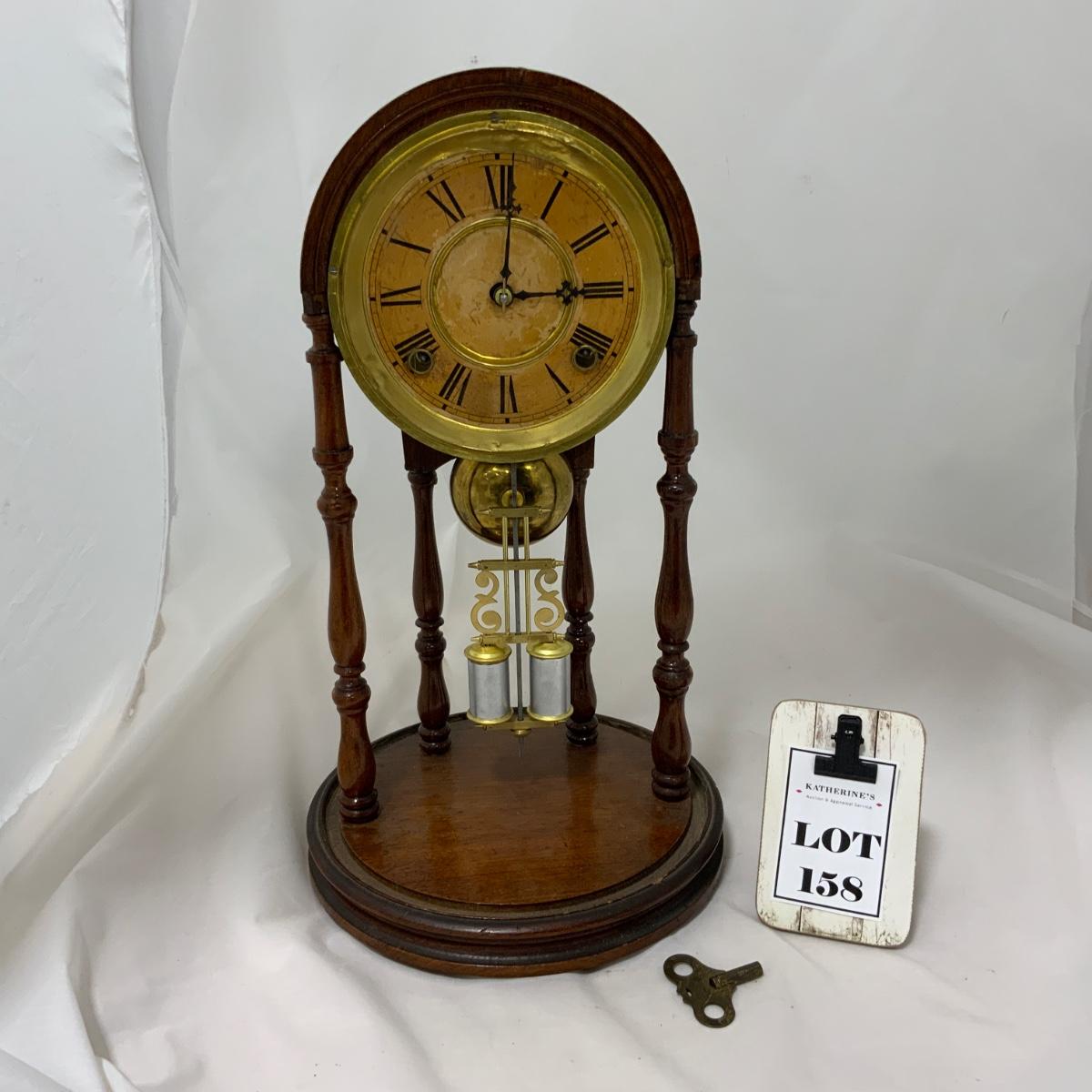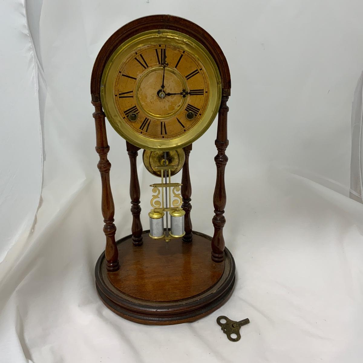 Unusual Ansonia Clock with pendulum and Key. Works well. Dome is missing from this piece, but it looks really incredible without it too. Please see photos for details and condition. ::: Shipping is NOT available on this lot. If you have any questions regarding this lot please contact the auctioneer either via this website, by direct email or by phone. PICK UP TIMES and other important information can be found in the TERMS and DESCRIPTION of the auction. Please take a look for pertinent information. Thanks!