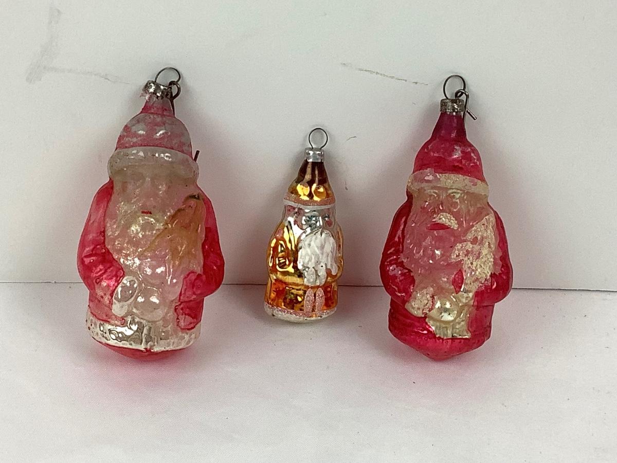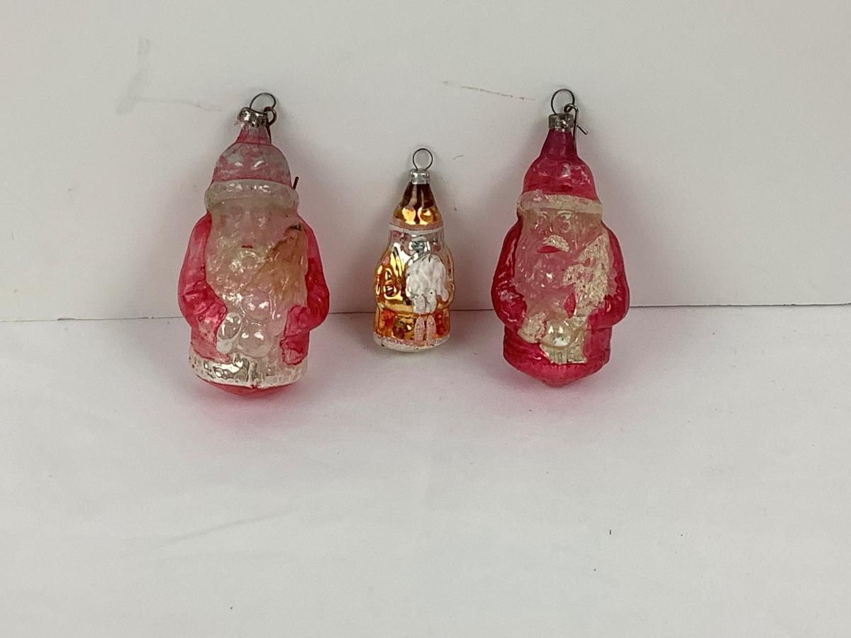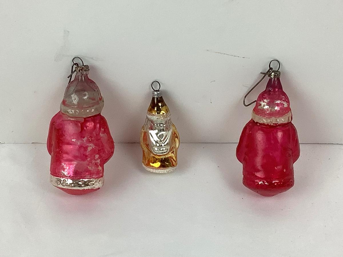 There is a pair of vintage mercury glass santa ornaments that are 3.5" tall, one vintage glass santa made in Germany that measures 2.25" tall.