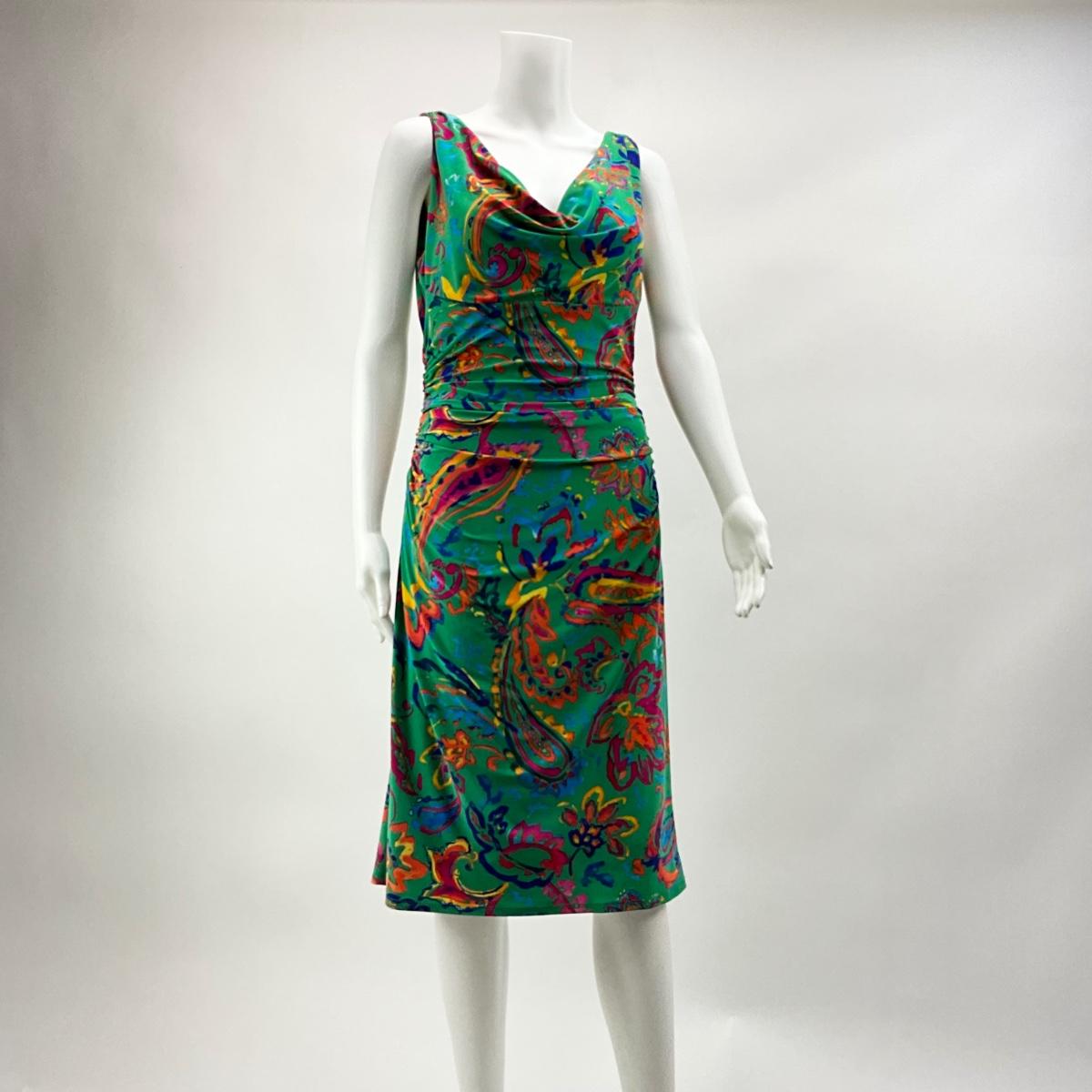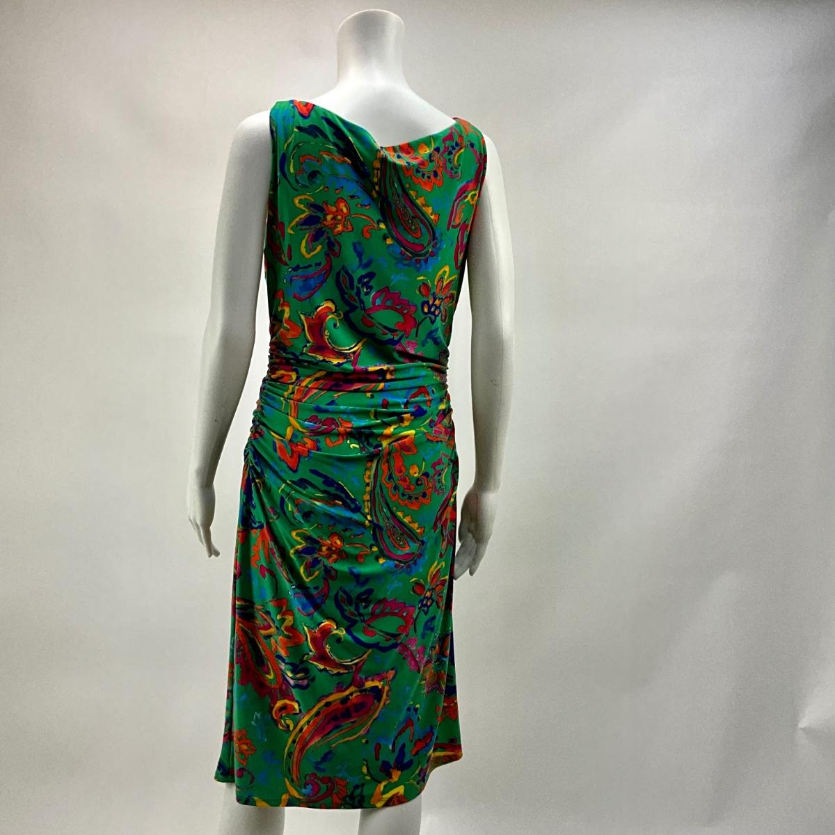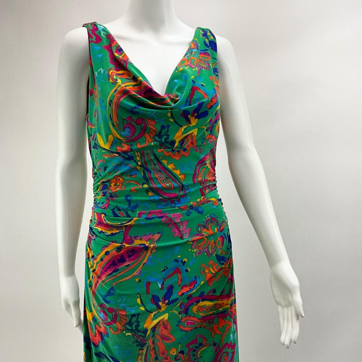 Dress is size 10, floral, sleeveless, rouched sides, poly blend. Measures 18" from armpit to armpit, 14" hip to hip when flat (has some elasticity) and overall length is 39". (Green Label Ralph Lauren)