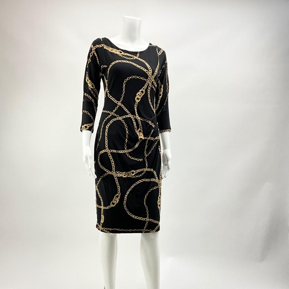 The dress is size 4, black dress with gold chain pattern, green label Lauren, the dress measures 17" from armpit to armpit, 14" at the waist from side to side when laying flat, 39" overall length.