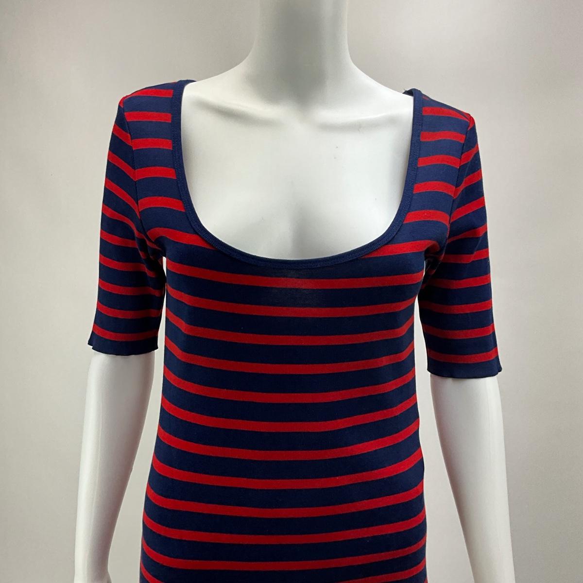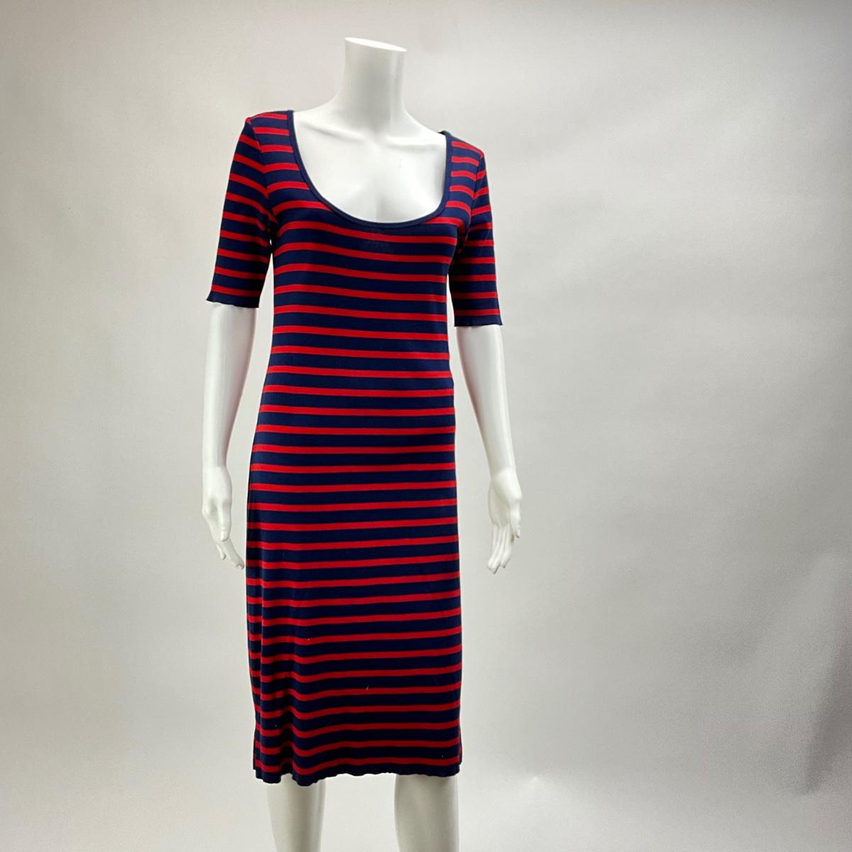 Dress has scoop neck, 3/4 sleeve, knit blend, size medium. The dress measures 15.5" from pit to pit, 40" in length.