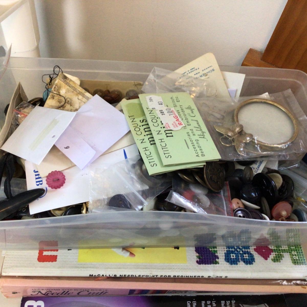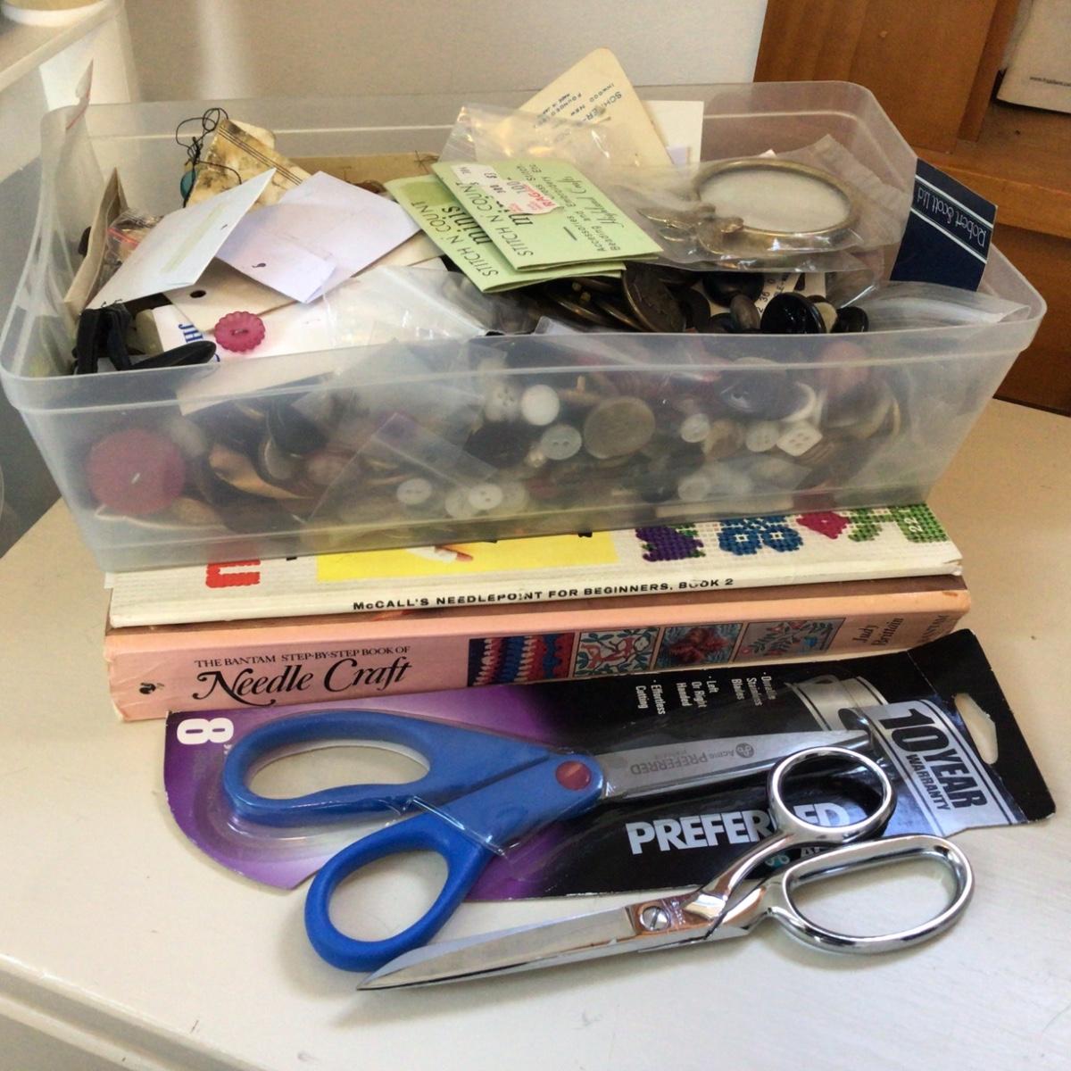 Lot contains books on needle work, Kleen cut shears, scissors and a large container full of buttons.