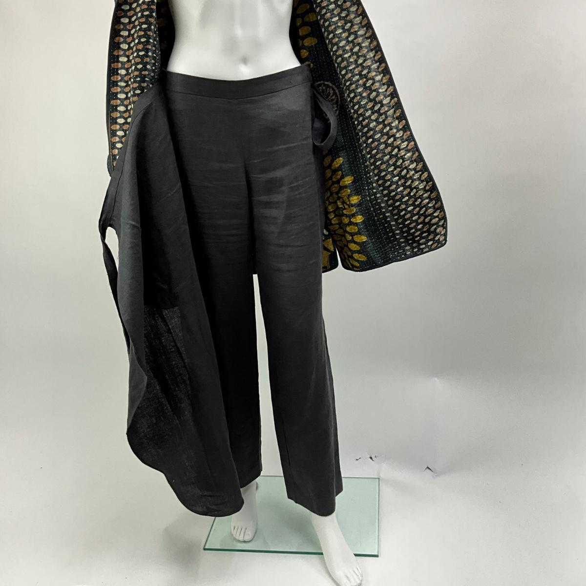 The jacket is reversible with a quilted texture and measures 19" from armpit to armpit, 35" overall length and 23" arm length (shoulder to cuff). The pants have a warp that makes them appear to be a skirt, they are dark grey and measures 15" from hip to hip and 38" in length.