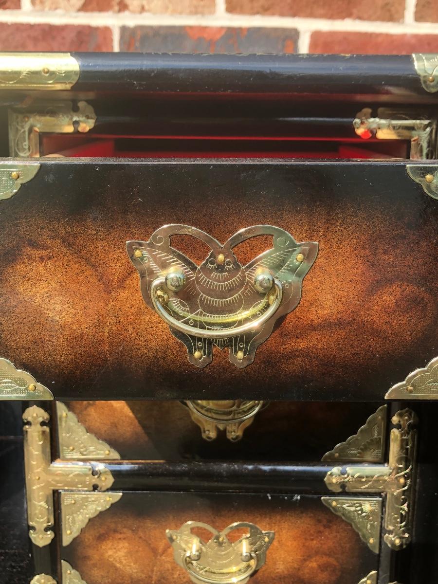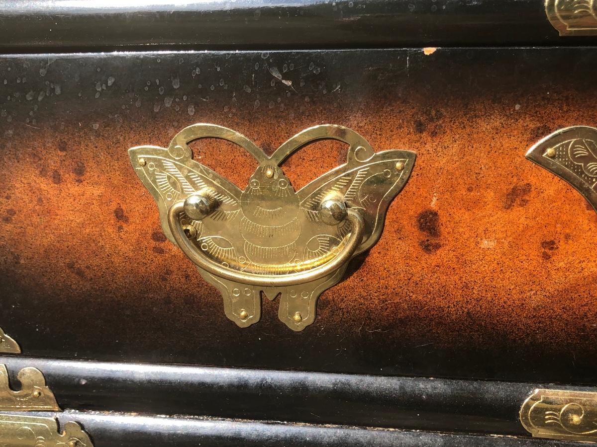 LOT158M: Exotic Wooden Chest With Brass Hinges & Moth Motif