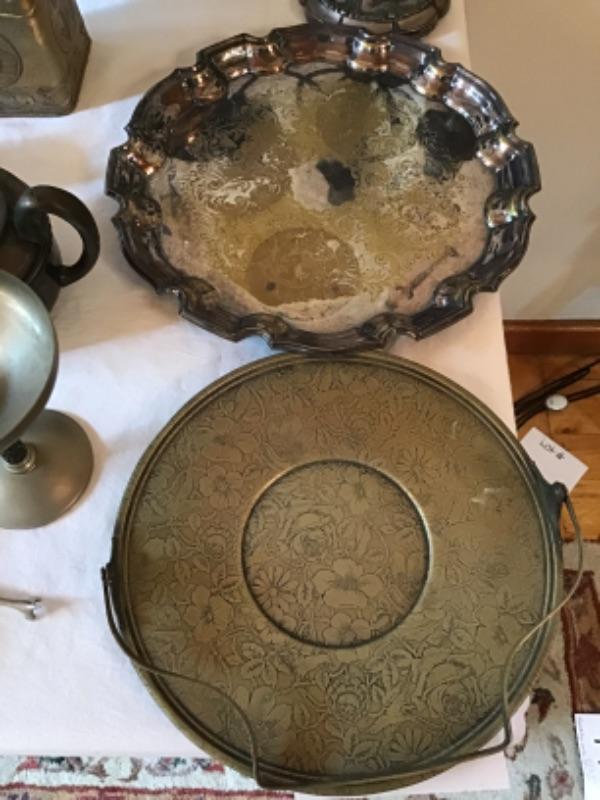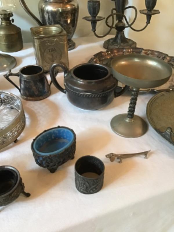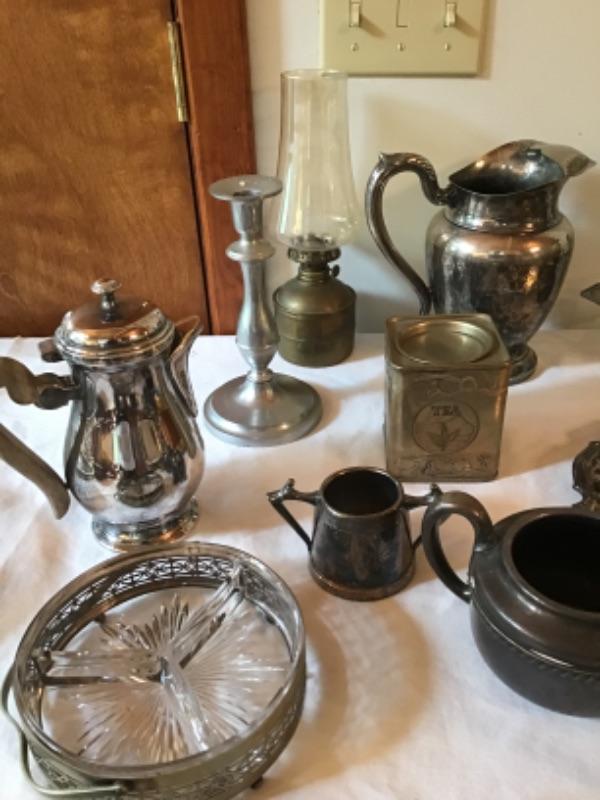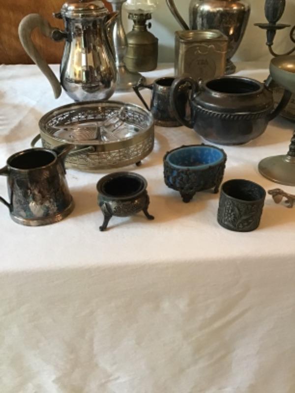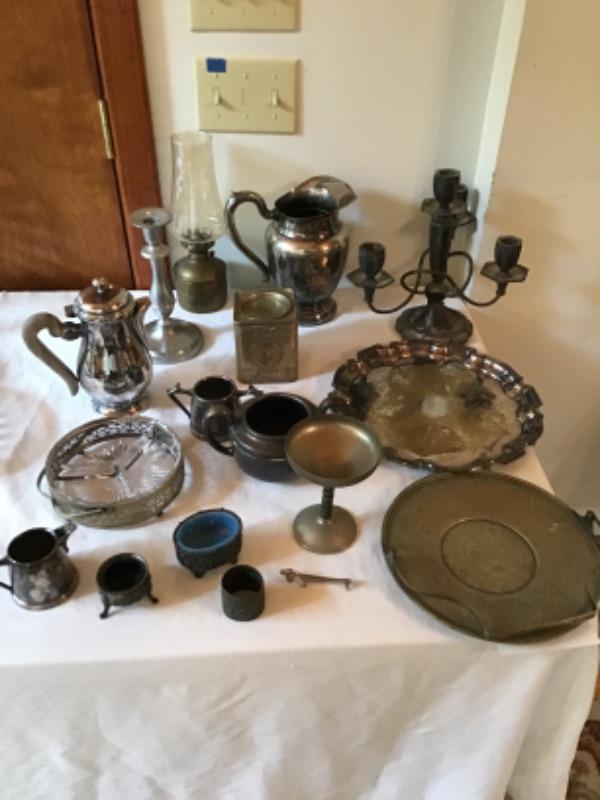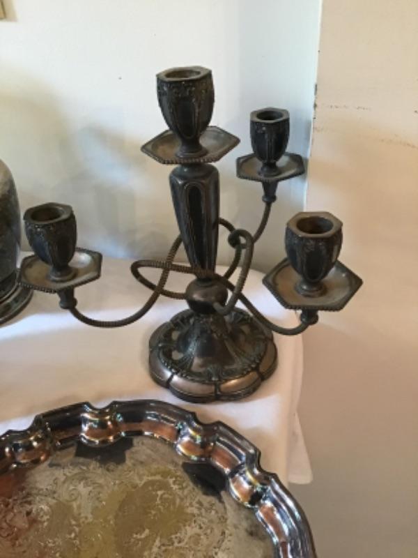 A lot of silver plated hollowware pieces such as pitchers, candle stick holders, trays, and bowls.