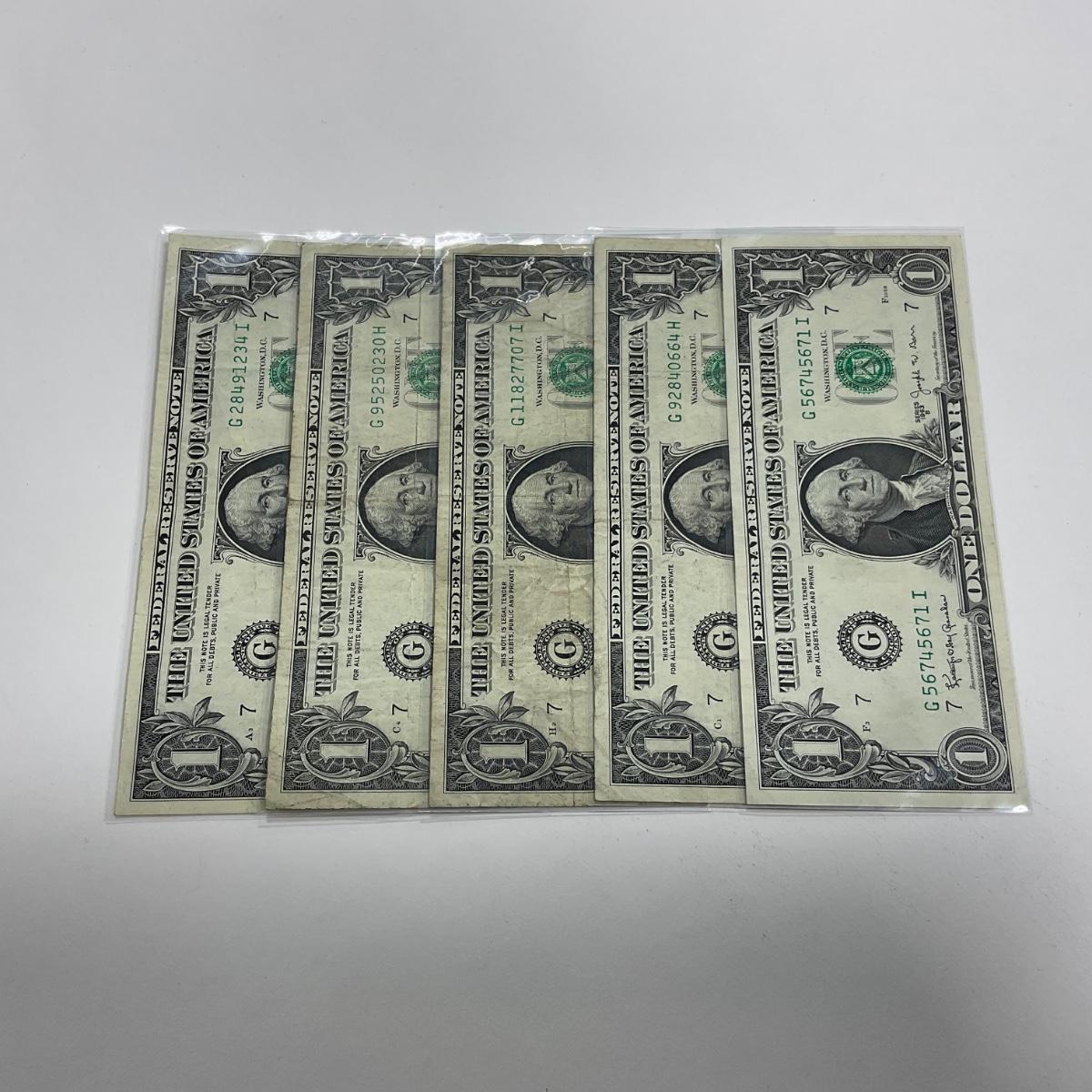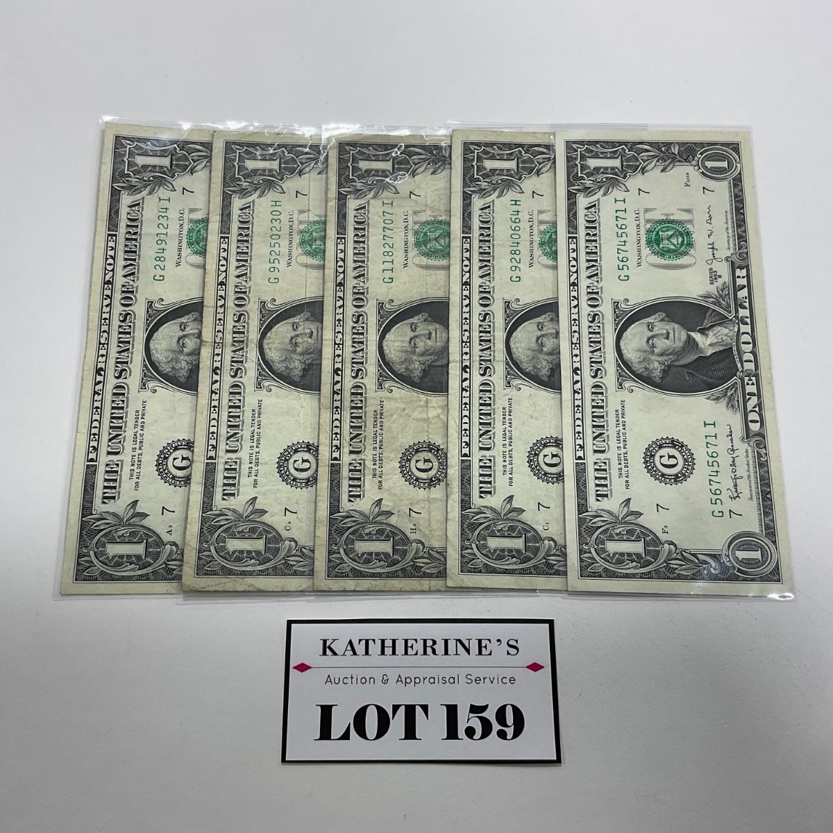 Five 1963-B Dollar notes with average circulation one in better condition. Please see photos for details and condition. ::: Shipping is available on this lot. If you require shipping you must let us know at the close of the auction. We will coordinate with you after the item has been won. Shipping fees will include insurance up to or exceeding the value of all items being mailed. If you have any questions regarding this lot please contact the auctioneer either via this website, by direct email or by phone. PICK UP TIMES and other important information can be found in the TERMS and DESCRIPTION of the auction. Please take a look for pertinent information. Thanks!