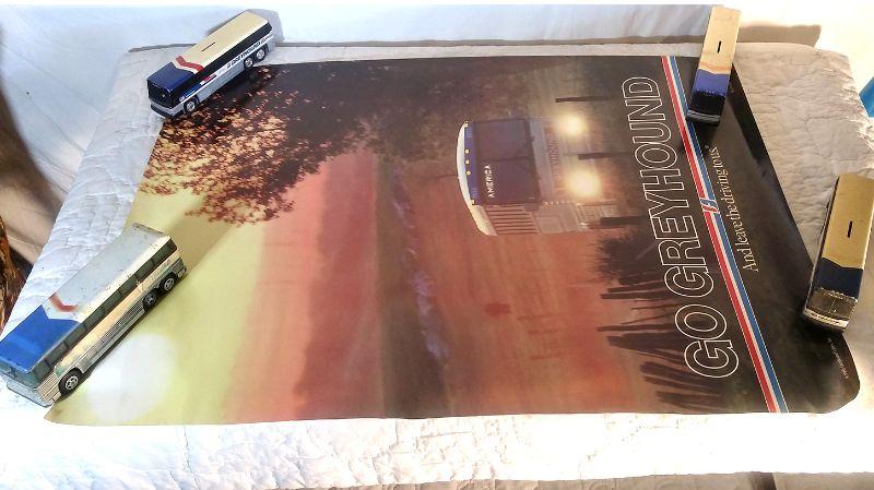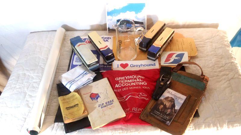 Greyhound grouping: Poster 85/100, sign, paper goods, ticket punch, good driver patches, 5 year service pin, watch, magnets
