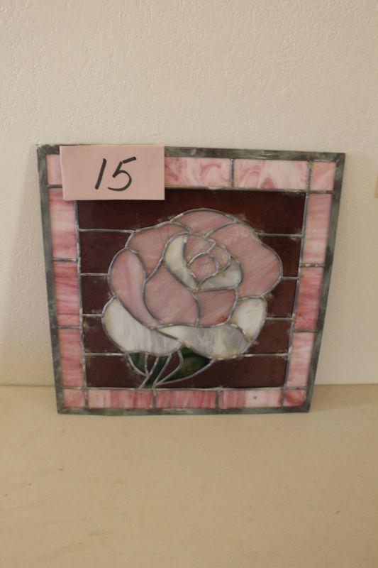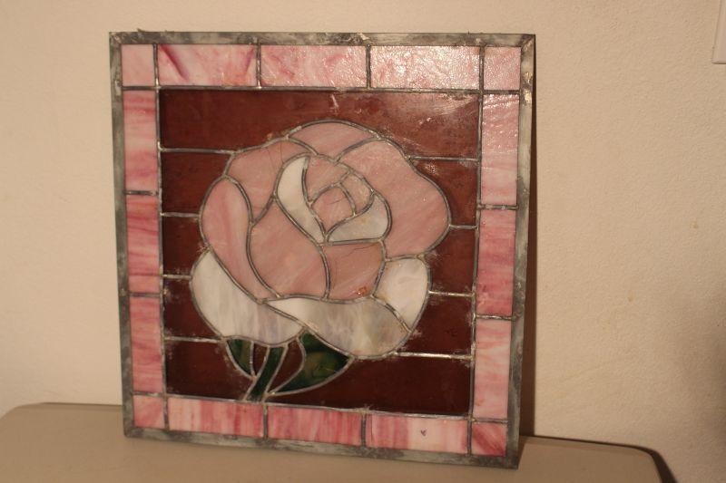 Large Wall Art Window-Pink and Burgundy Rose Stained Glass -16 3/4" x 17" this was handmade and does have some pencil marks that the lead work was not completed on the panels.